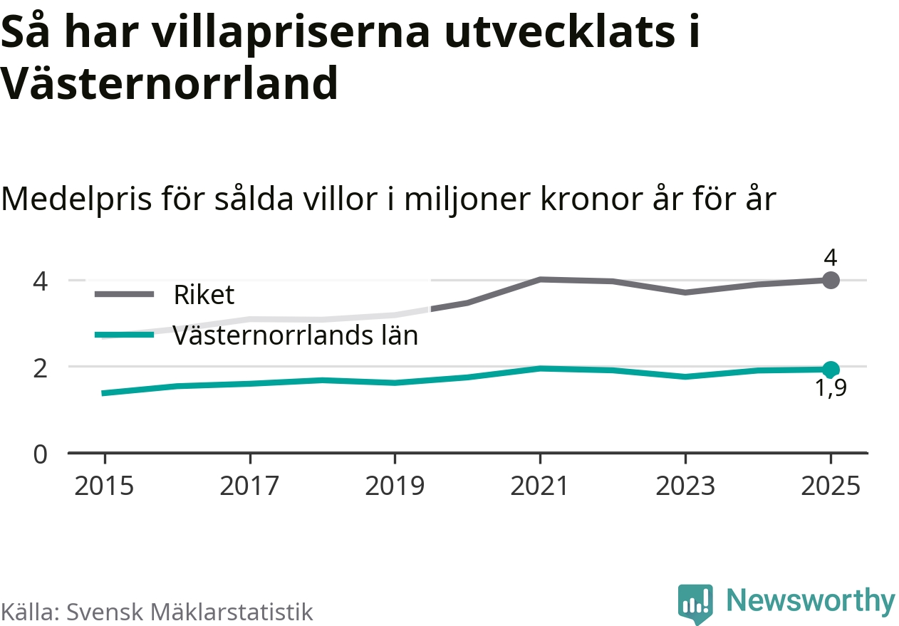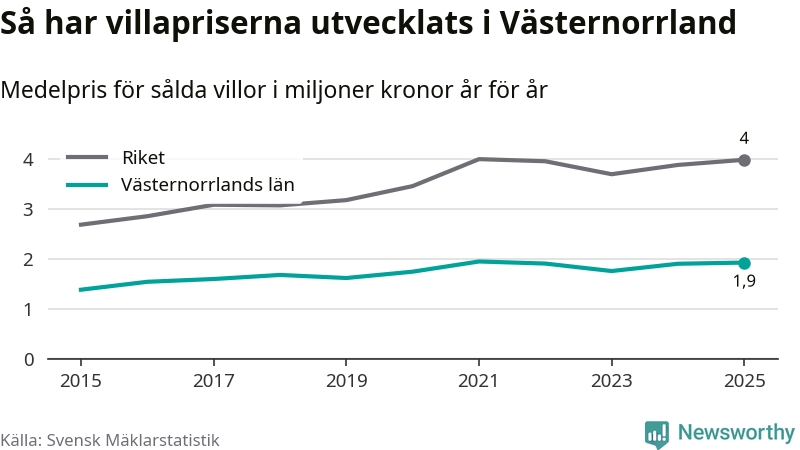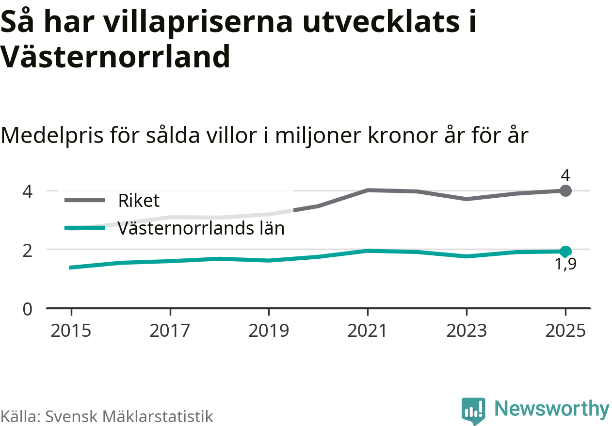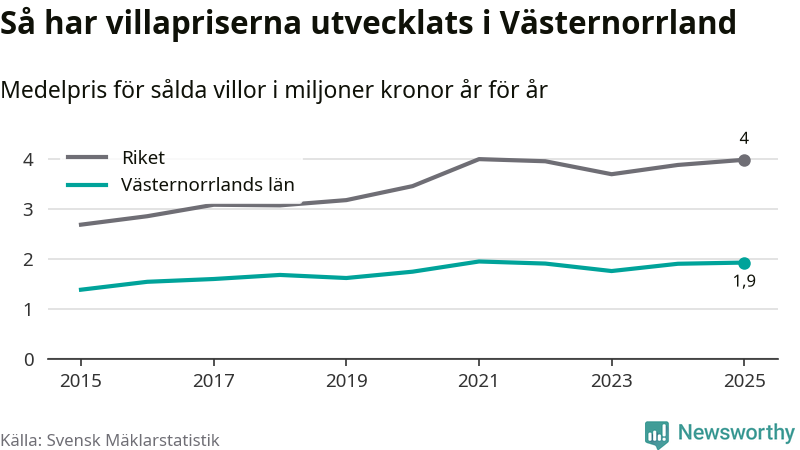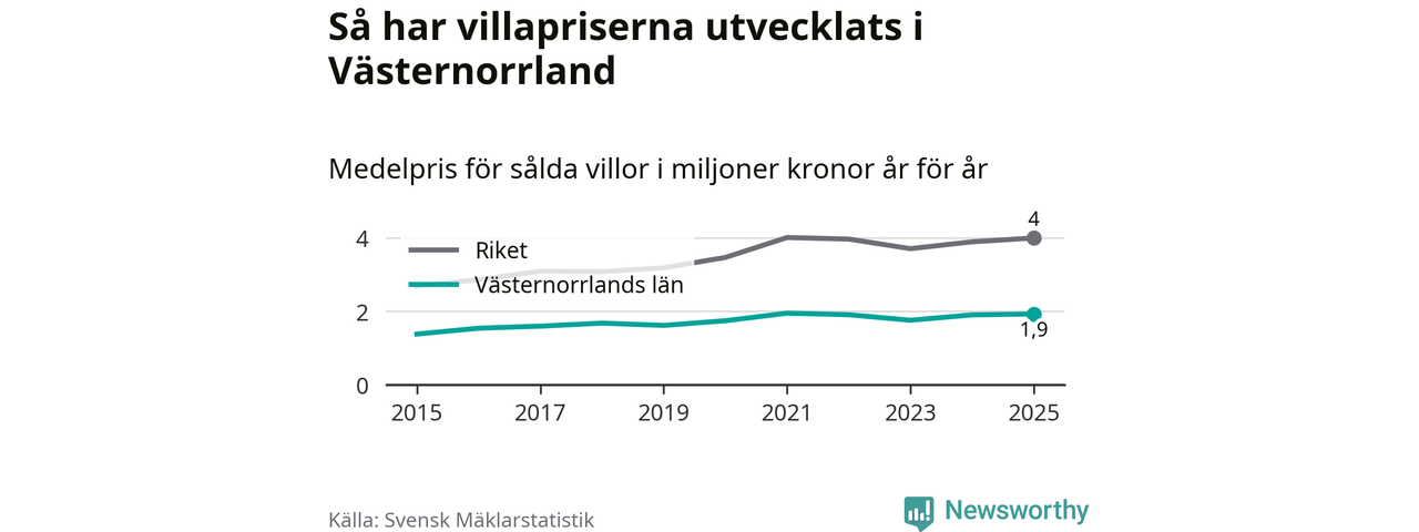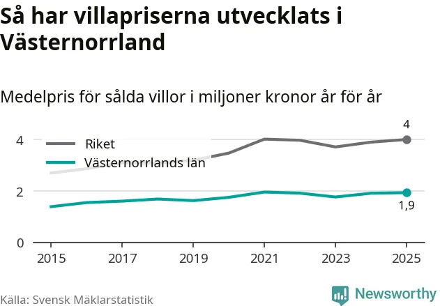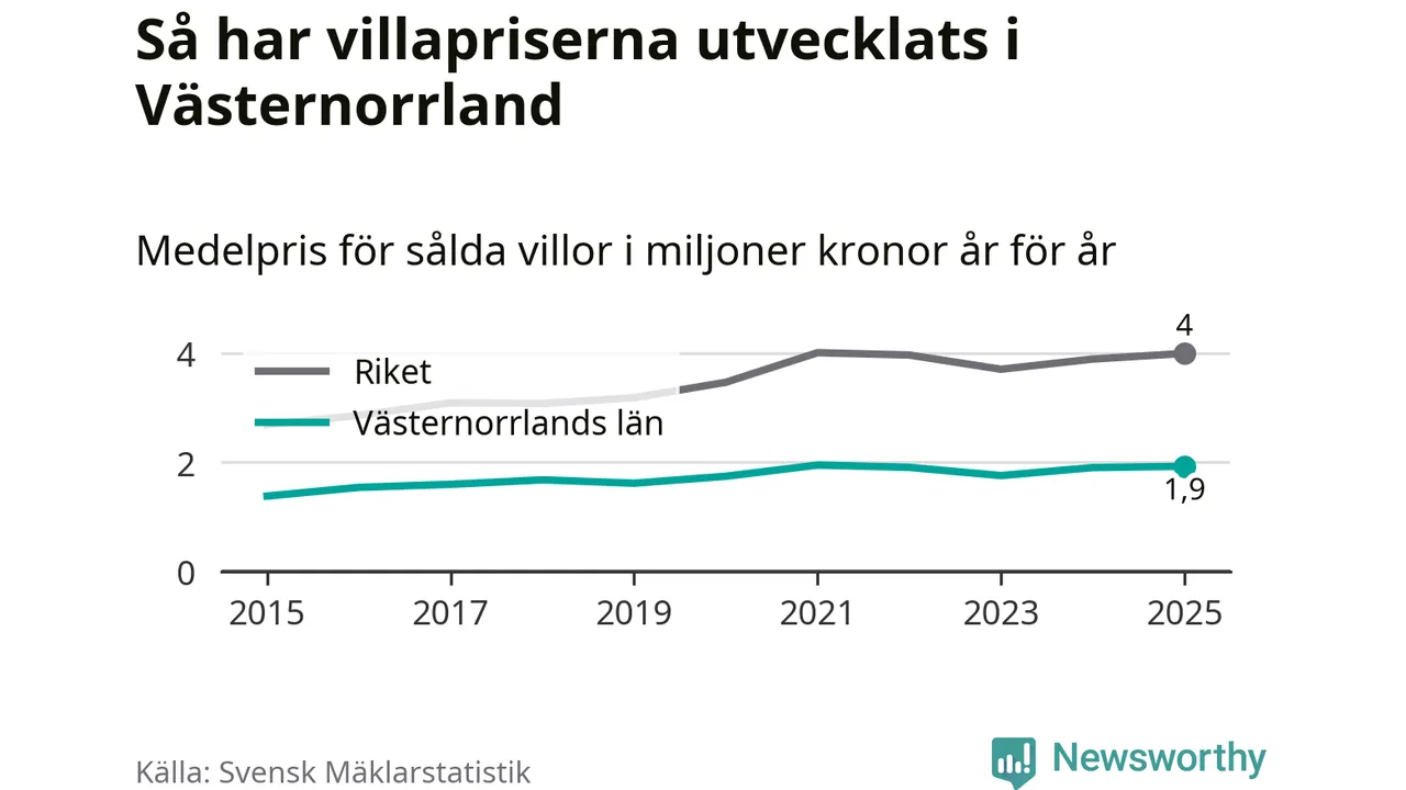 1,9 miljoner kronor är medelpriset för de villor som såldes i Västernorrlands län under året, eller 16 010 kronor per kvadratmeter. Det innebär en prisökning med en procent på ett år och är andra året i rad som priserna ökar i länet.