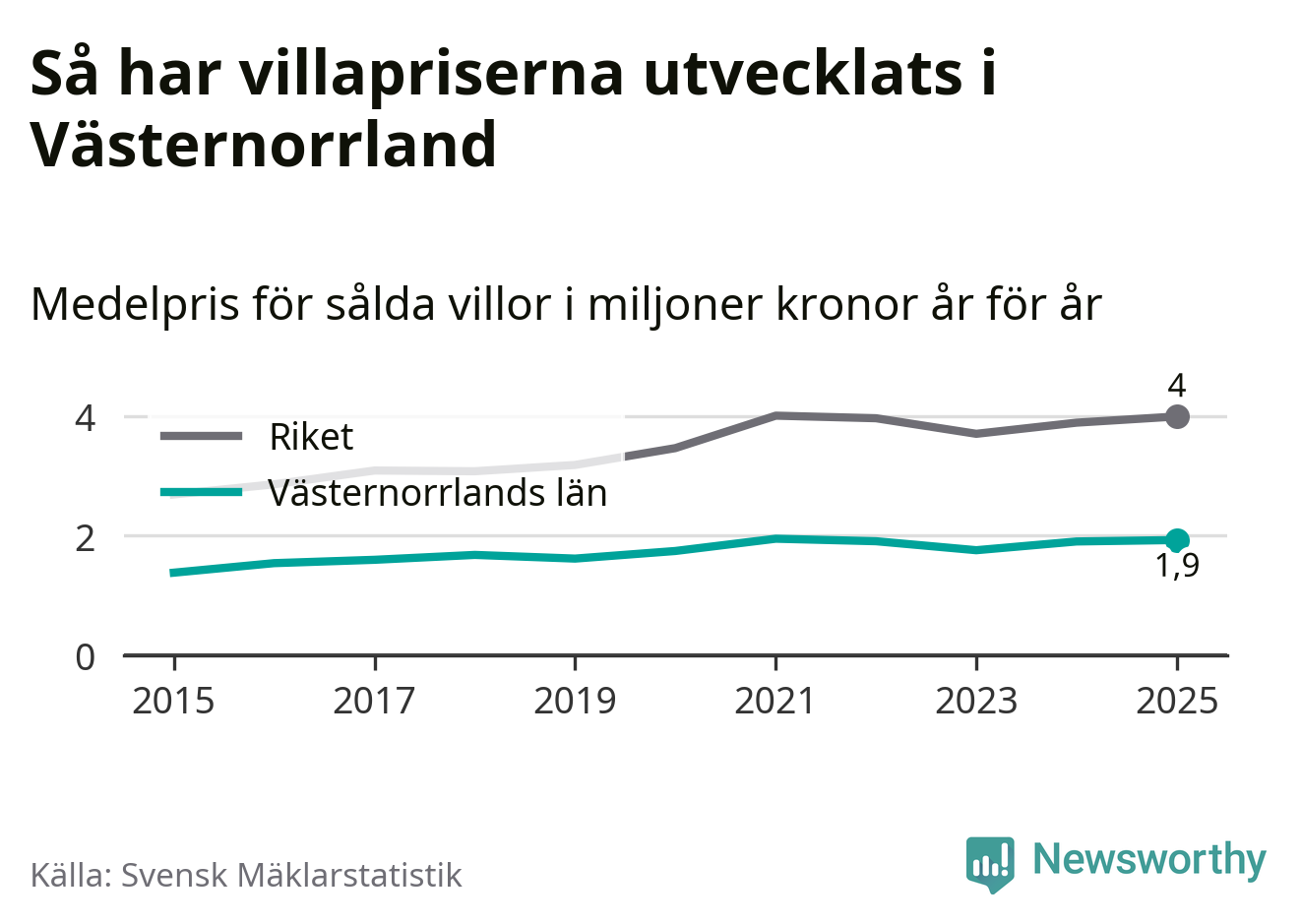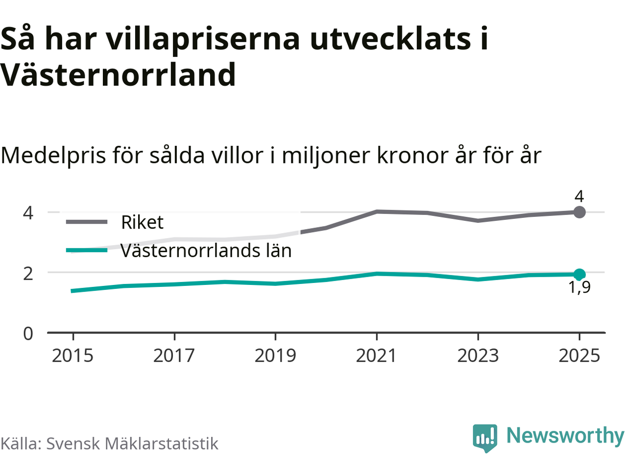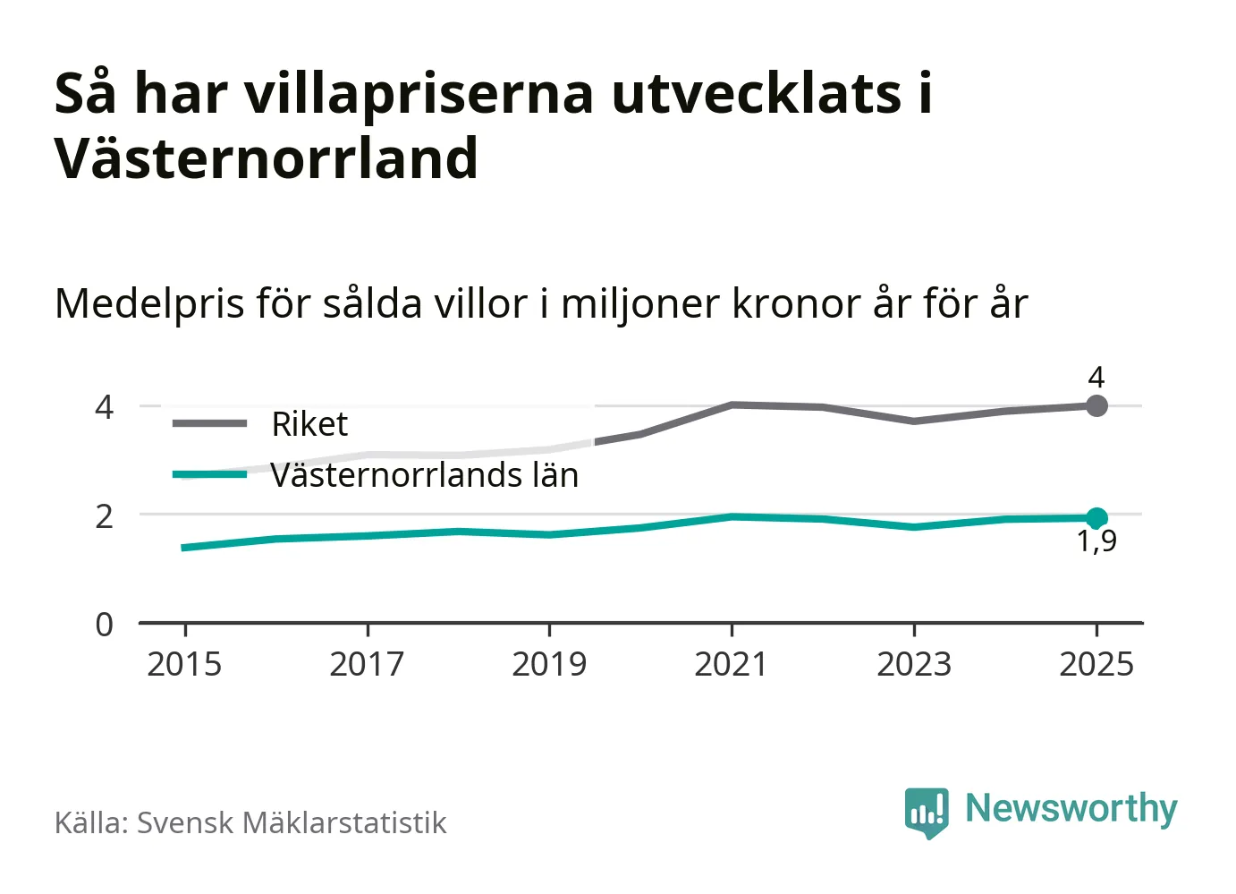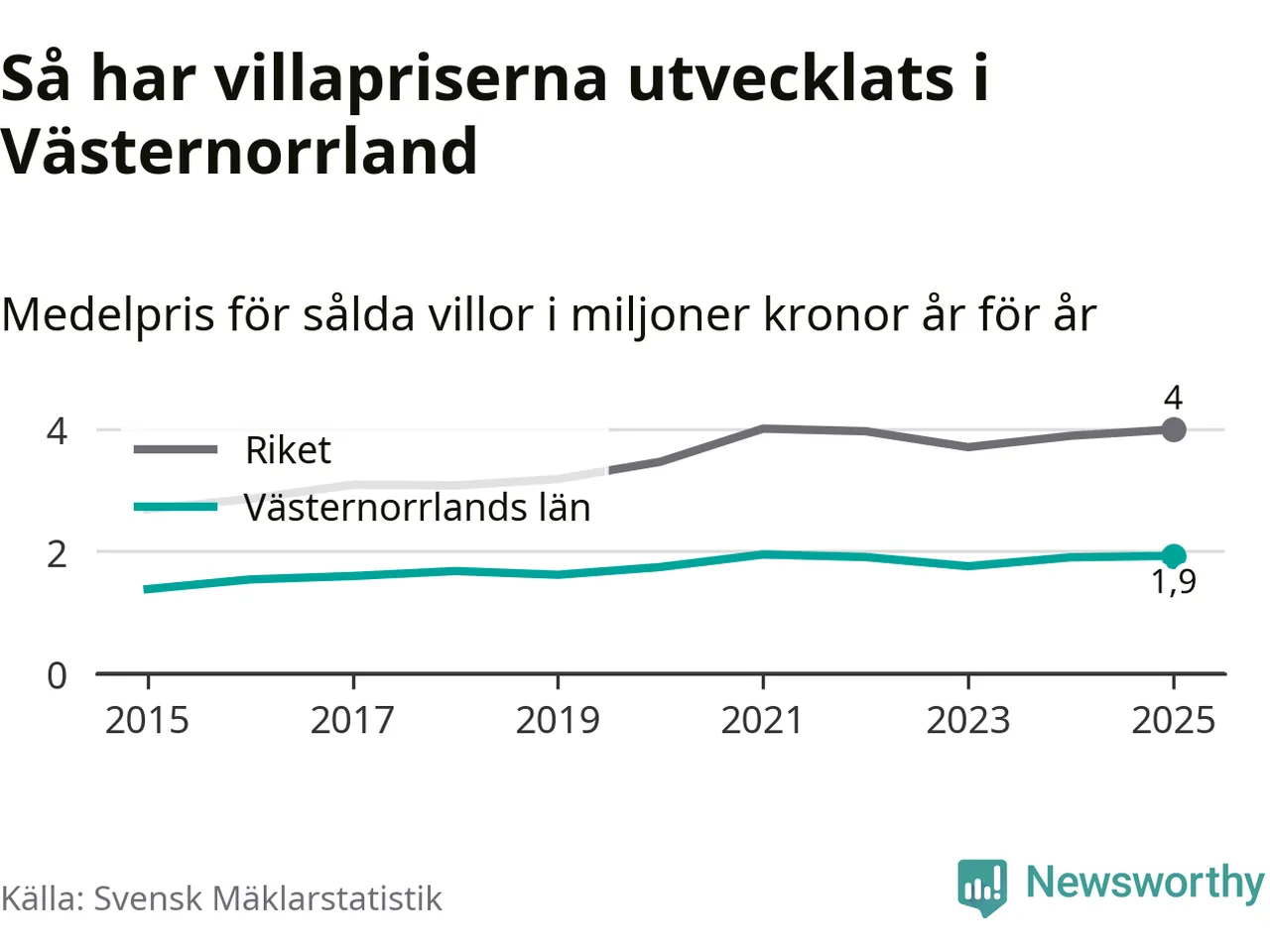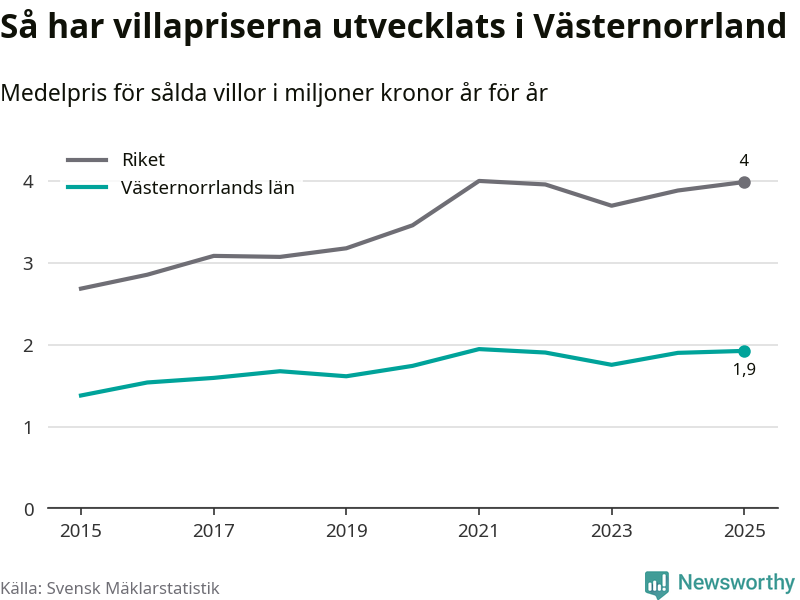 1,9 miljoner kronor är medelpriset för de villor som såldes i Västernorrlands län under året, eller 16 010 kronor per kvadratmeter. Det innebär en prisökning med en procent på ett år och är andra året i rad som priserna ökar i länet.