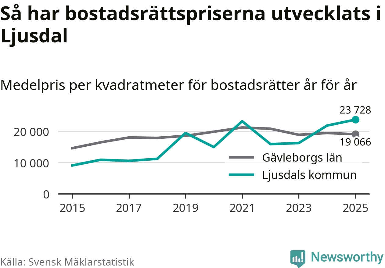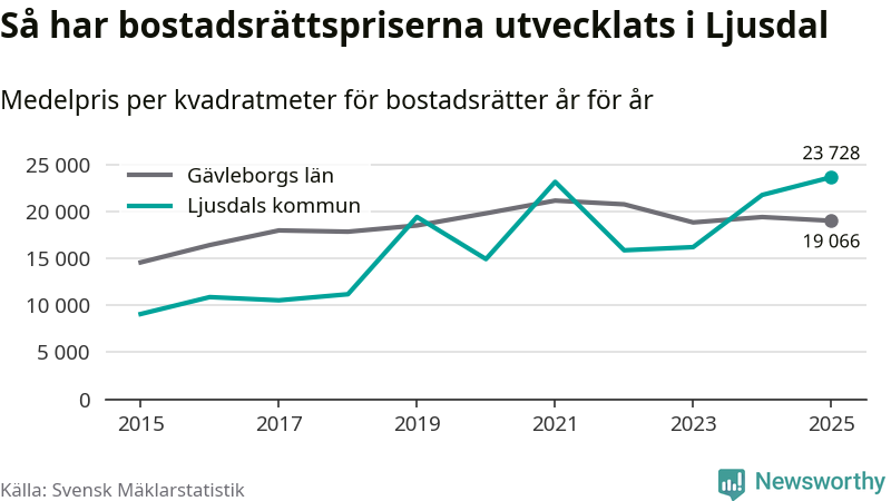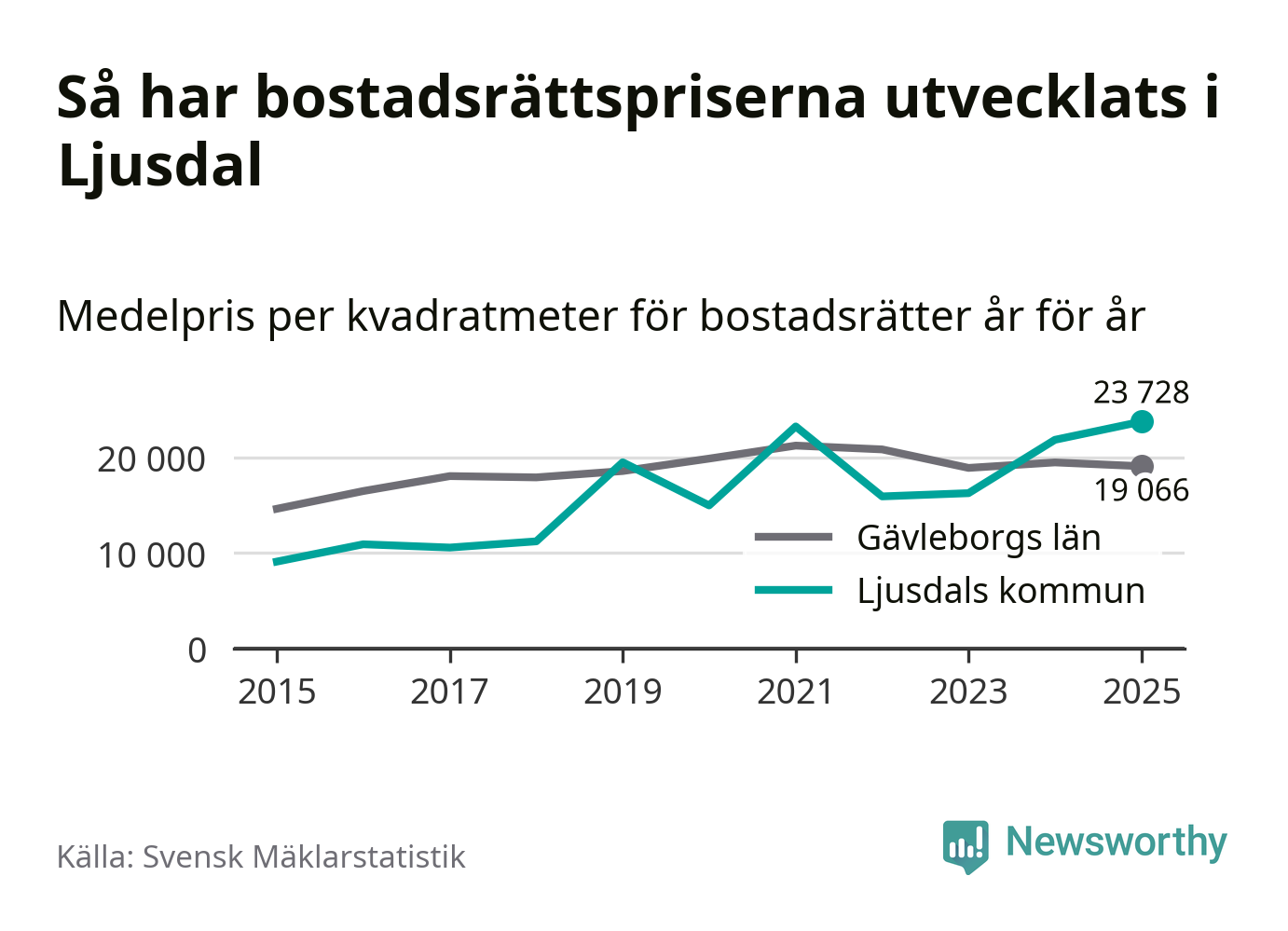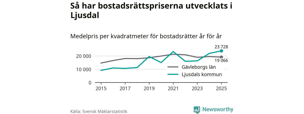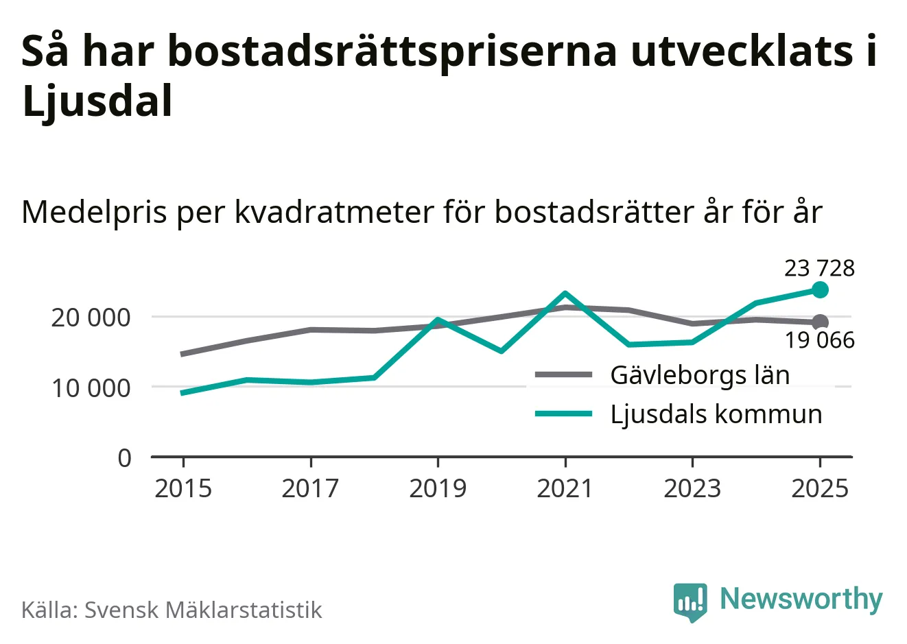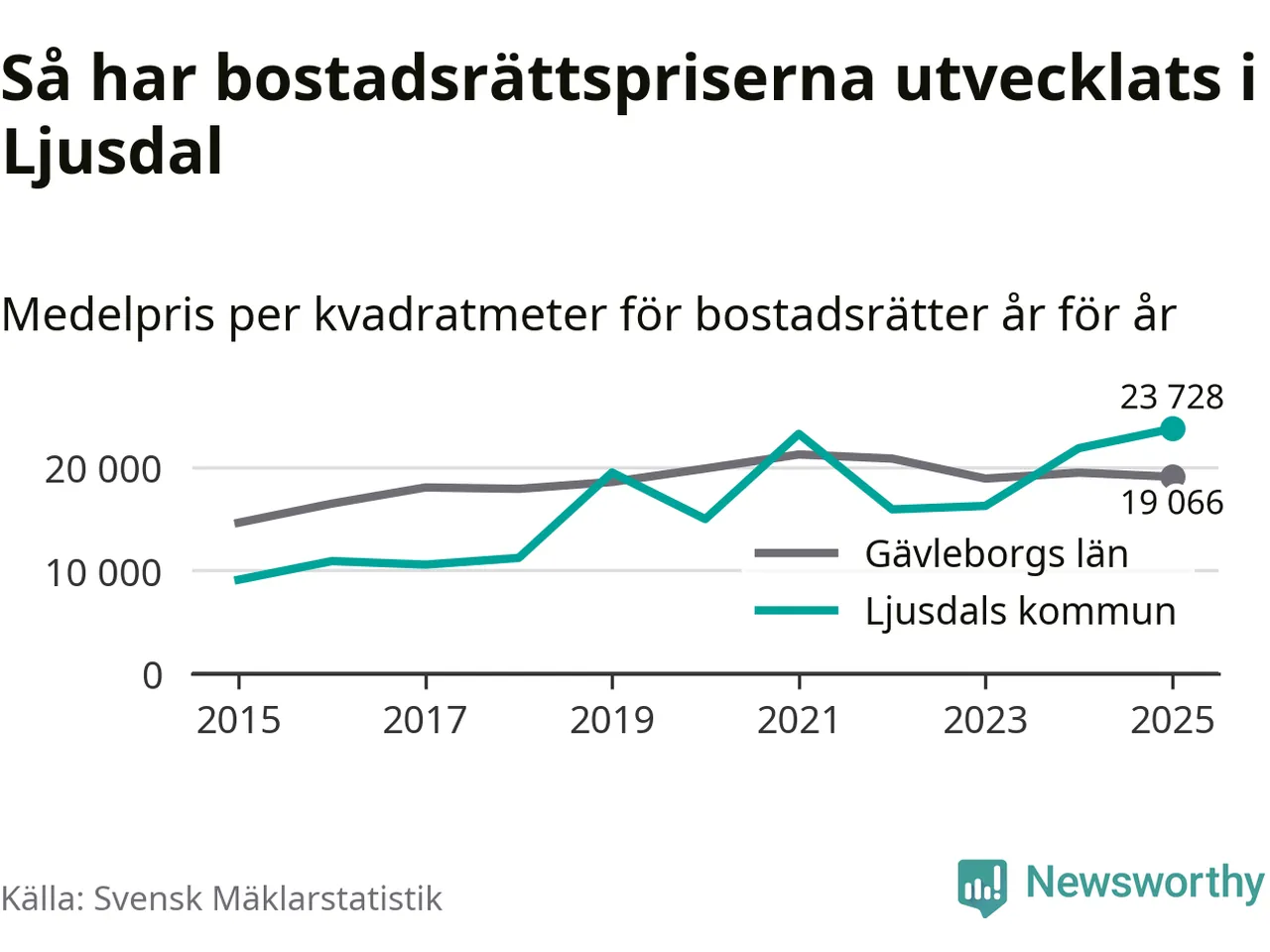 Det såldes totalt 56 bostadsrätter i Ljusdals kommun under året. Genomsnittspriset per kvadratmeter landade på 23 728 kronor. Det är en ökning med nio procent i kommunen på ett år och den högsta årsnivån på över ett decennium. Bryter man upp siffrorna per kvartal har dock ännu högre bostadsrättspriser noterats i Ljusdal vintern 2021/22.