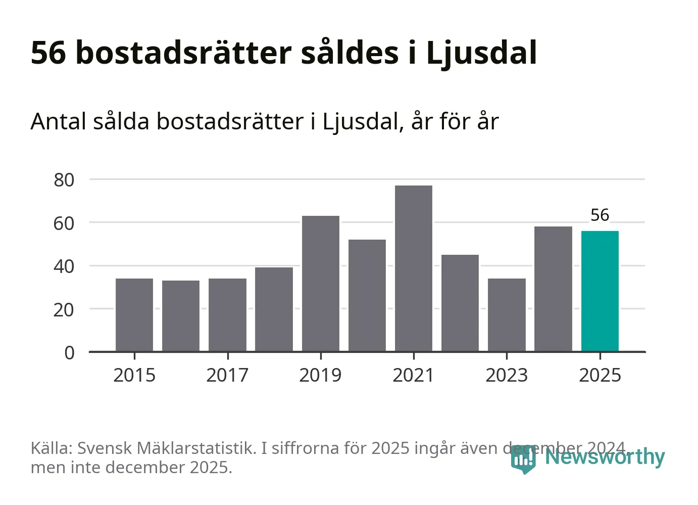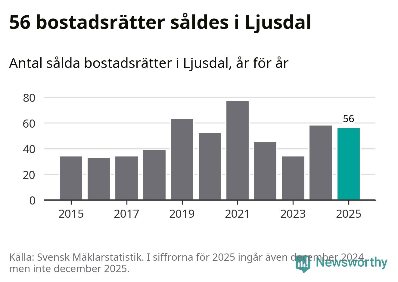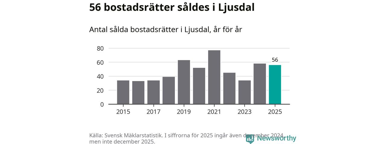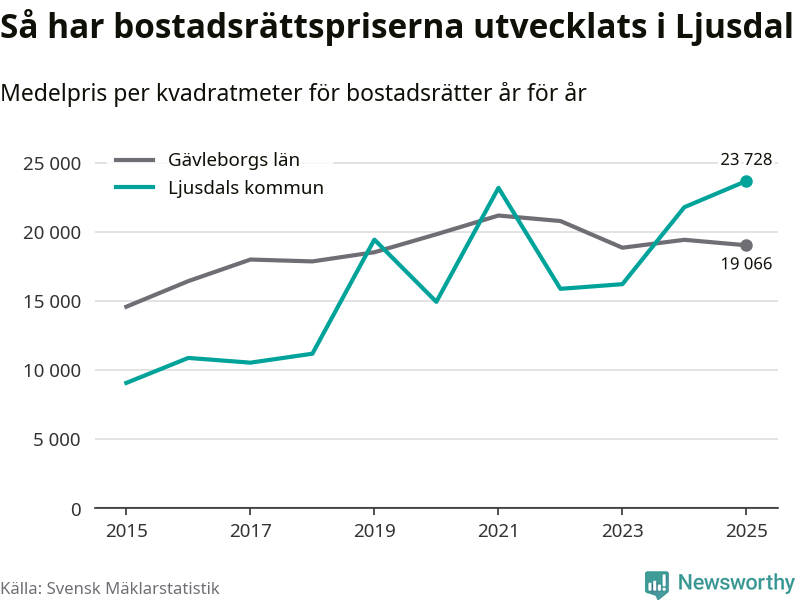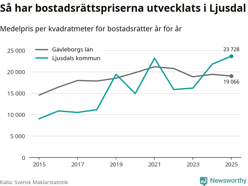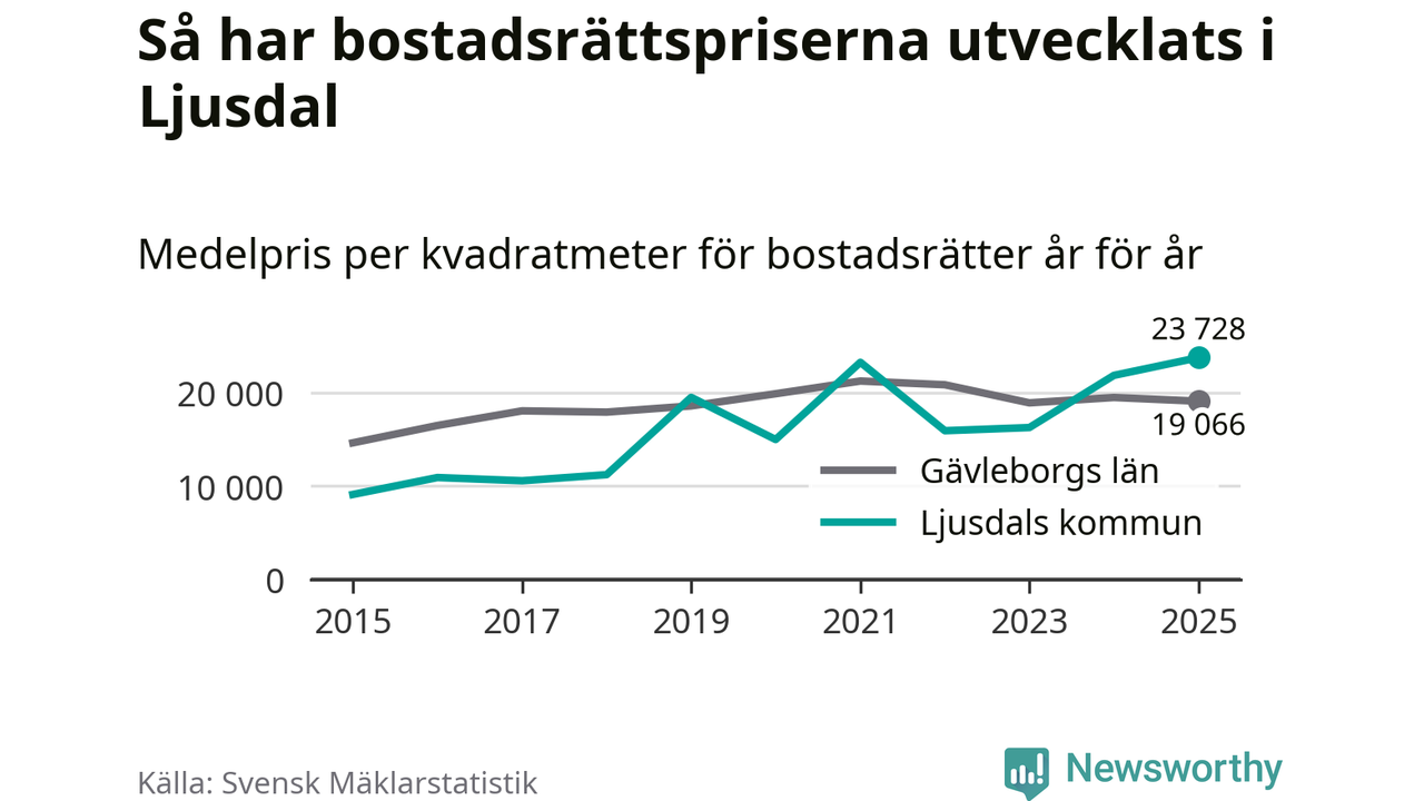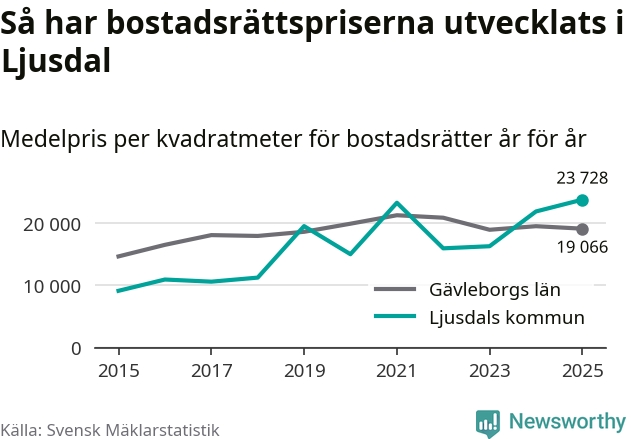 Det såldes totalt 56 bostadsrätter i Ljusdals kommun under året. Genomsnittspriset per kvadratmeter landade på 23 728 kronor. Det är en ökning med nio procent i kommunen på ett år och den högsta årsnivån på över ett decennium. Bryter man upp siffrorna per kvartal har dock ännu högre bostadsrättspriser noterats i Ljusdal vintern 2021/22.