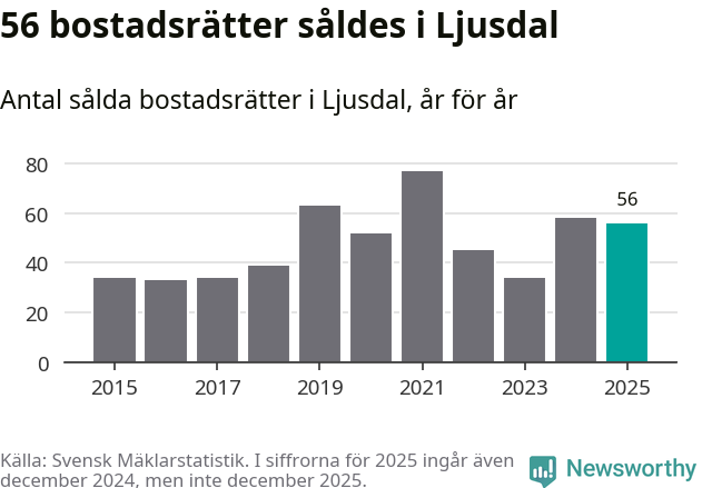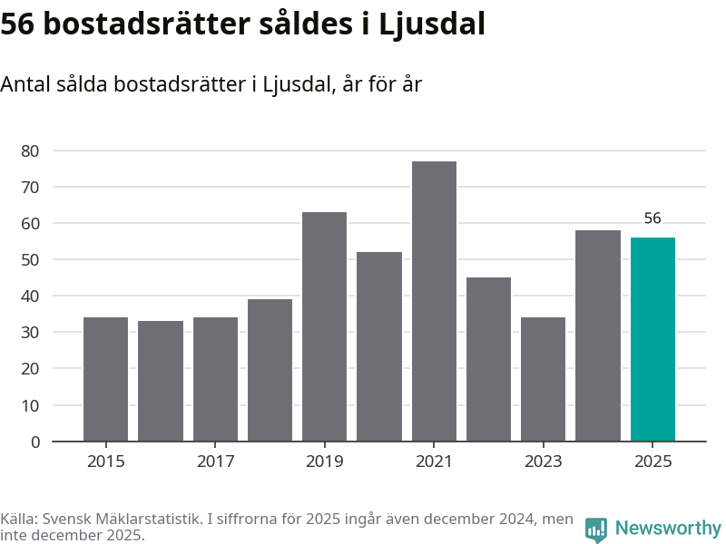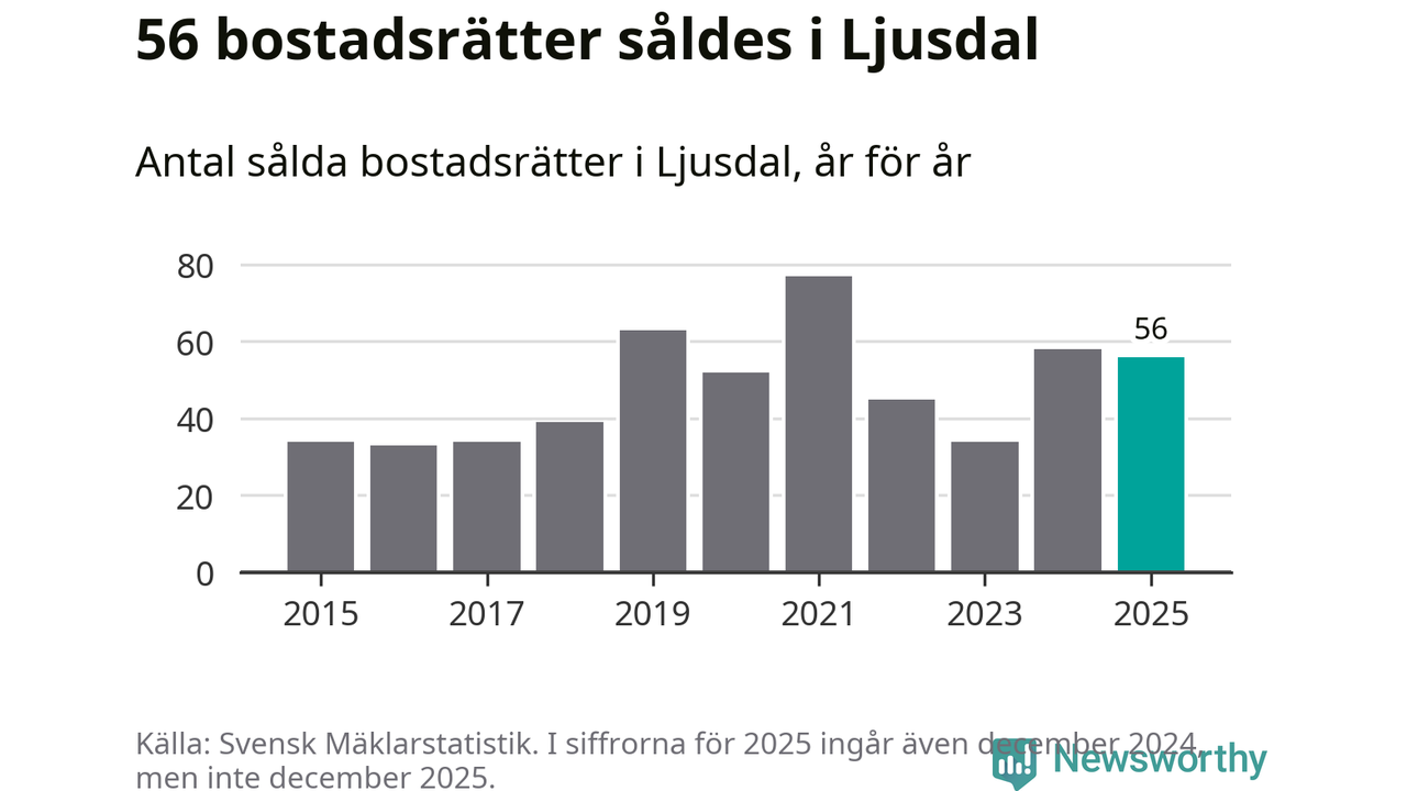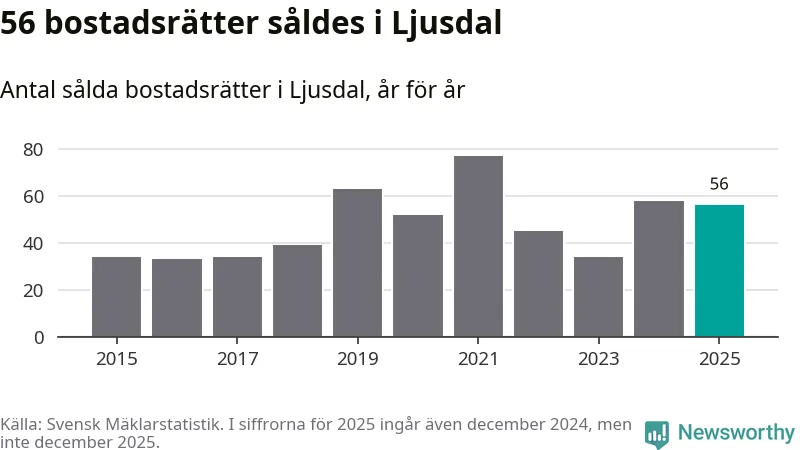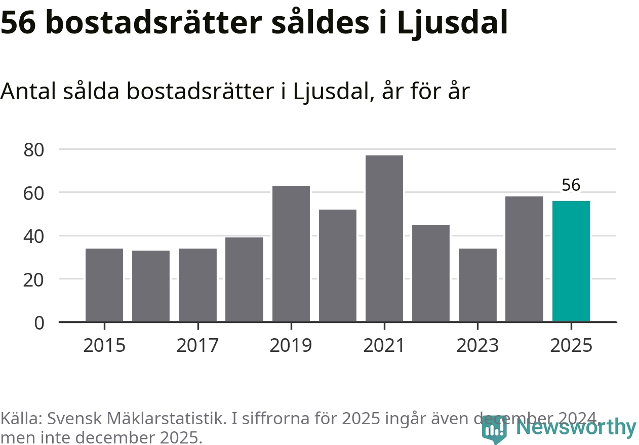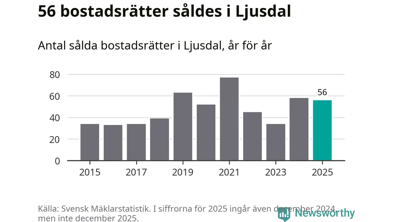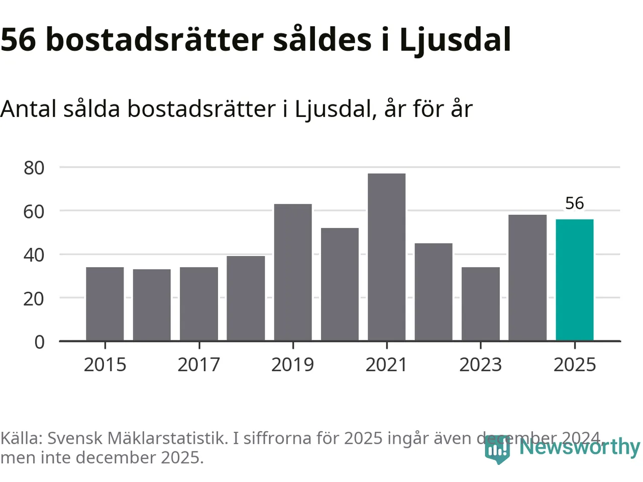 Det såldes totalt 56 bostadsrätter i Ljusdals kommun under året. Genomsnittspriset per kvadratmeter landade på 23 728 kronor. Det är en ökning med nio procent i kommunen på ett år och den högsta årsnivån på över ett decennium. Bryter man upp siffrorna per kvartal har dock ännu högre bostadsrättspriser noterats i Ljusdal vintern 2021/22.