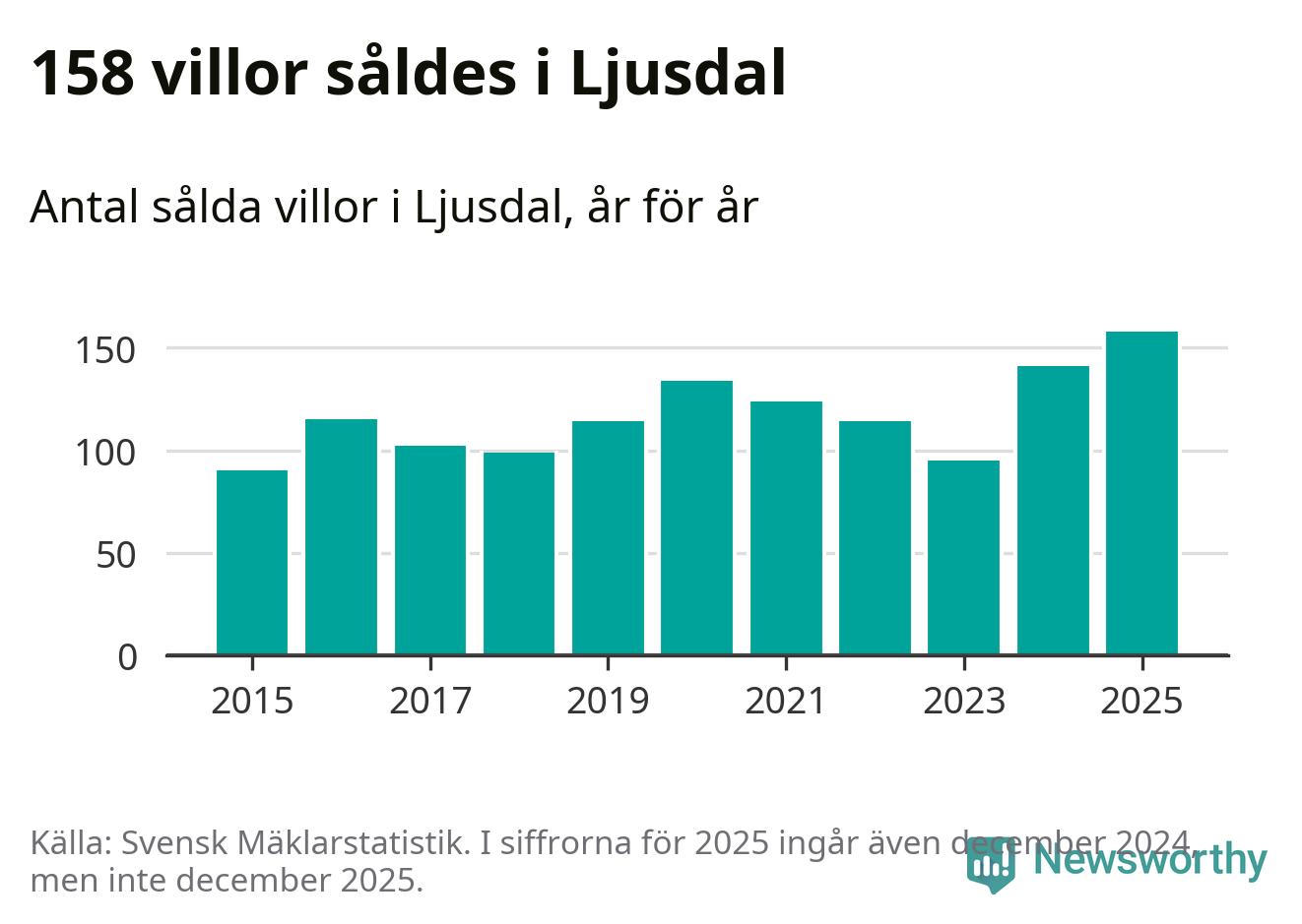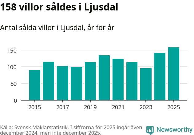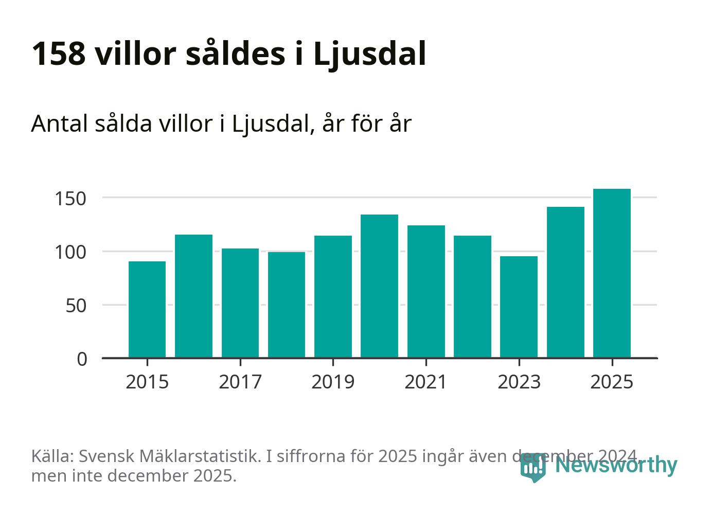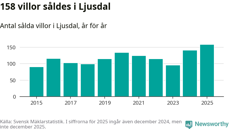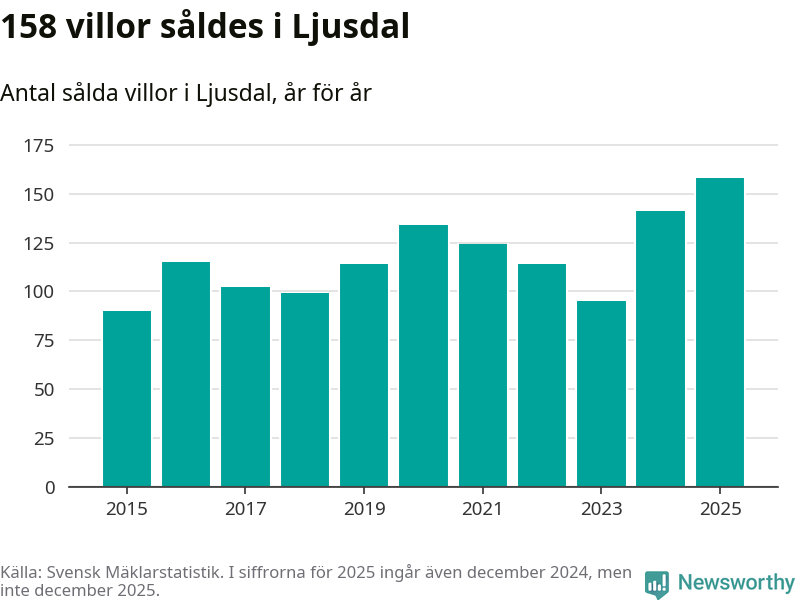 Antalet sålda villor ökade också. Totalt såldes 158 villor, att jämföra med 141 under 2024. Det är fler än något annat år sedan 2015.