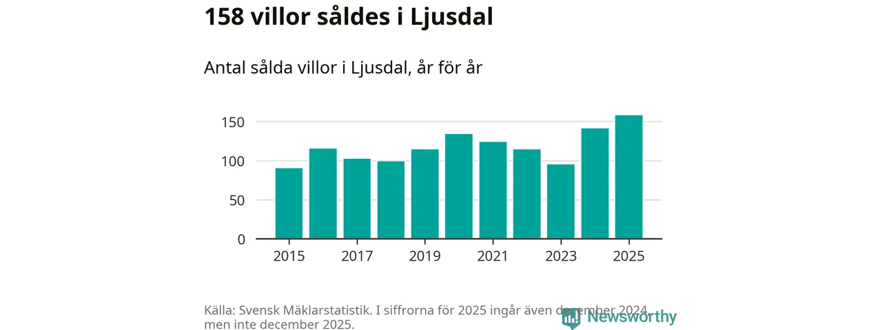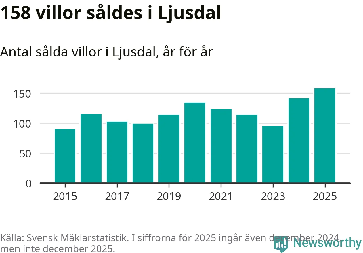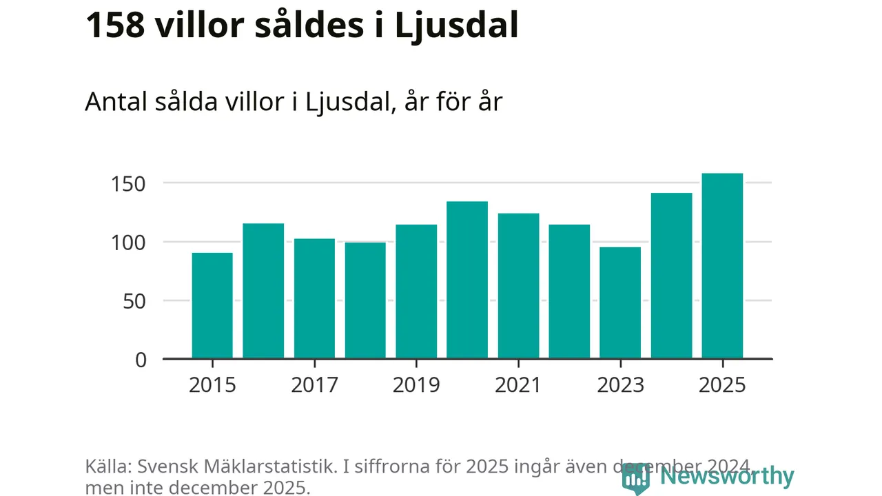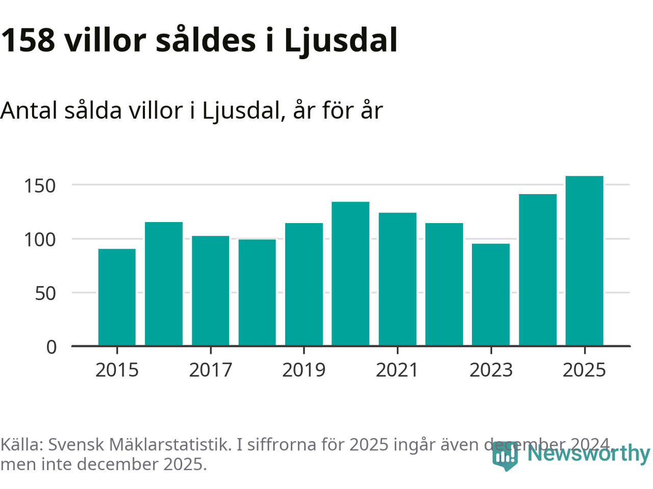 Antalet sålda villor ökade också. Totalt såldes 158 villor, att jämföra med 141 under 2024. Det är fler än något annat år sedan 2015.