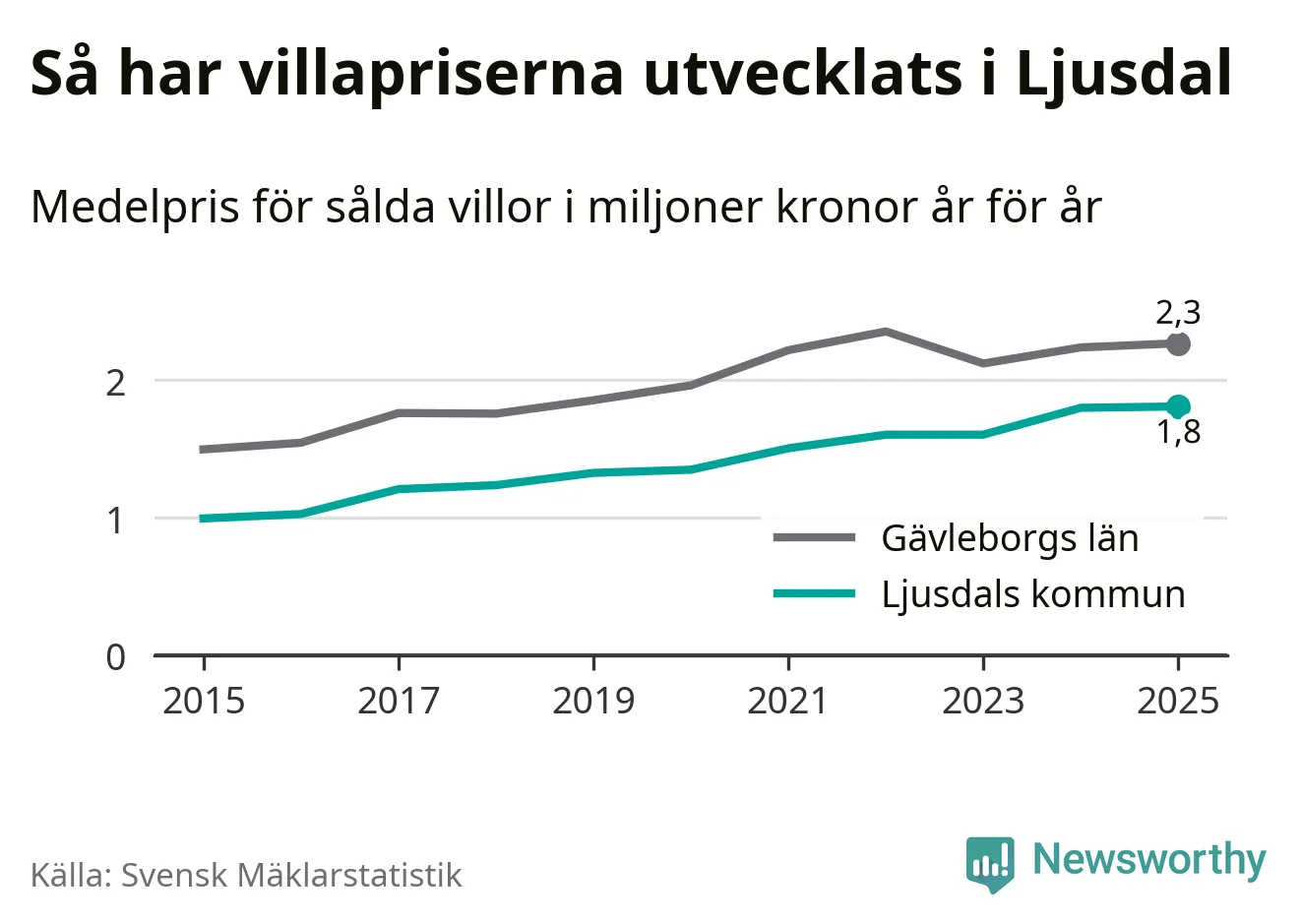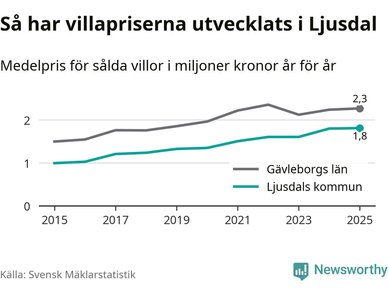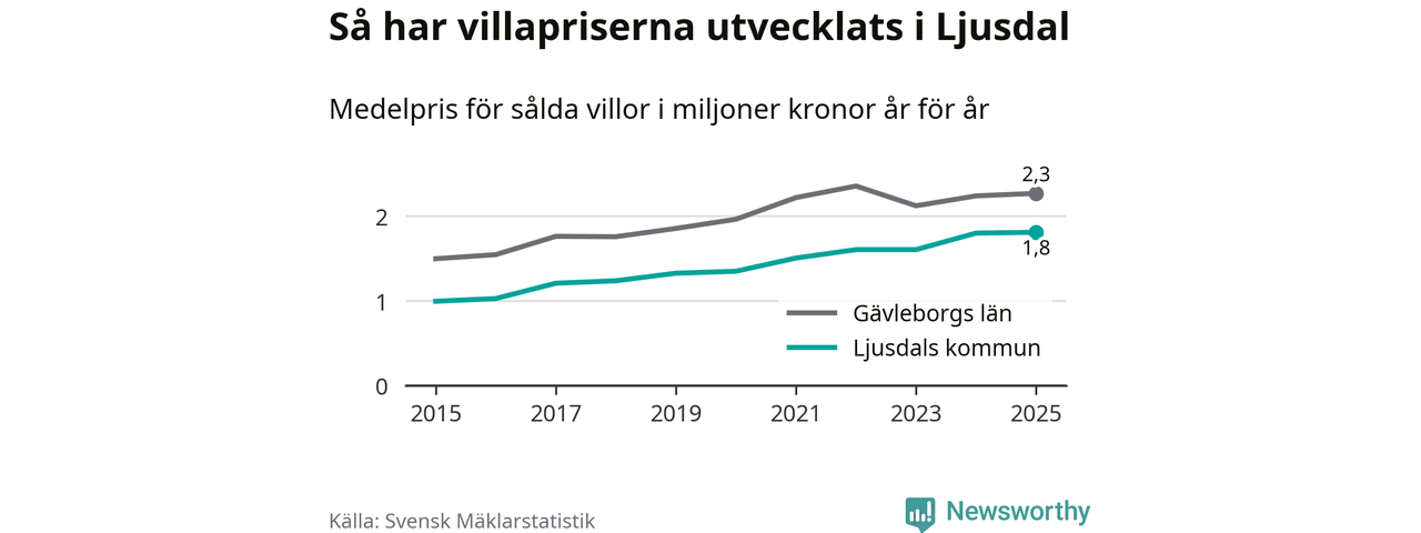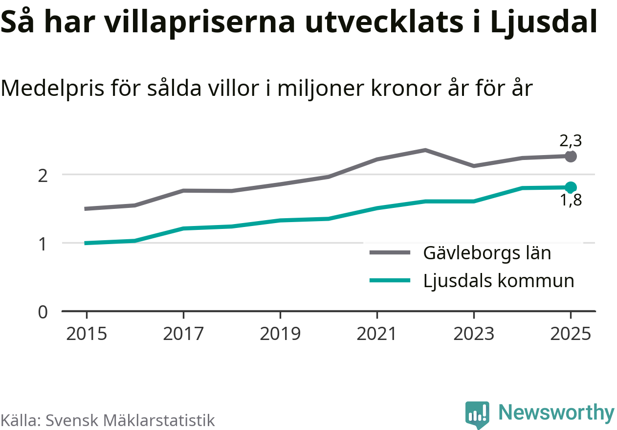 1,8 miljoner kronor är medelpriset för de villor som såldes i Ljusdals kommun under året, eller 15 822 kronor per kvadratmeter. Priserna ökade med 0,6 procent, vilket är det högsta årssnittet på åtminstone tio år. Bryter man upp siffrorna per kvartal har dock ännu högre villapriser noterats i Ljusdal vintern 2022/23.