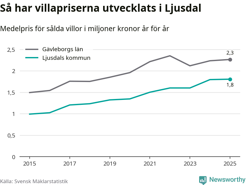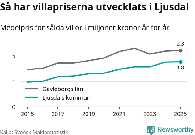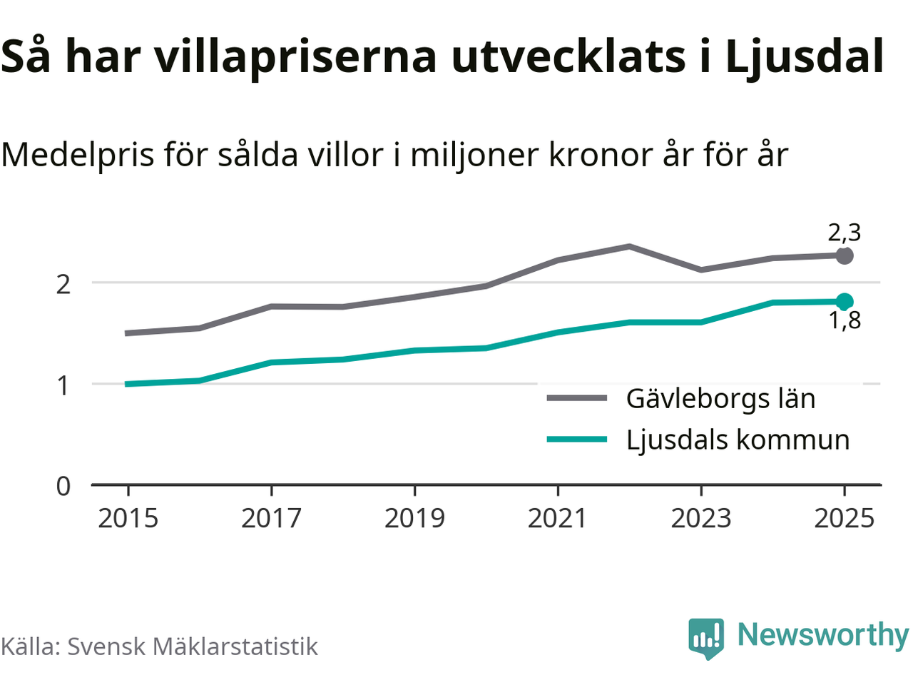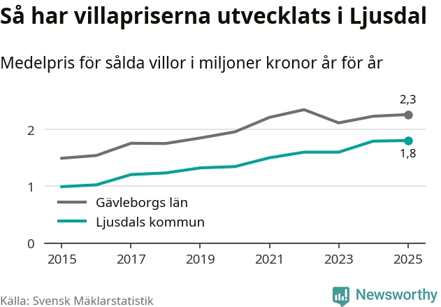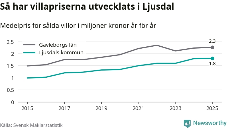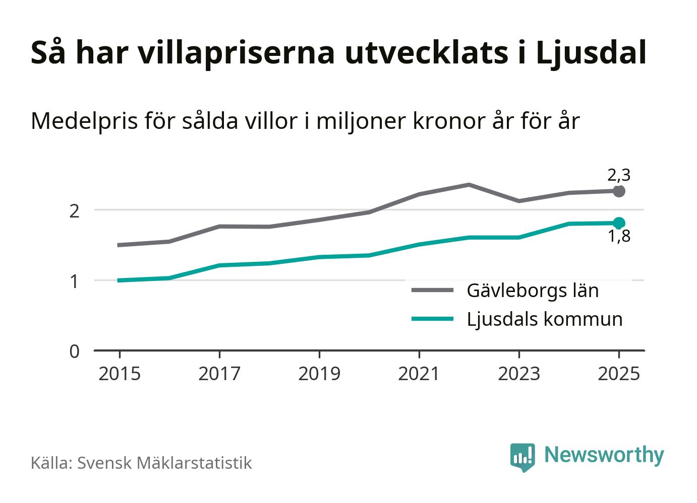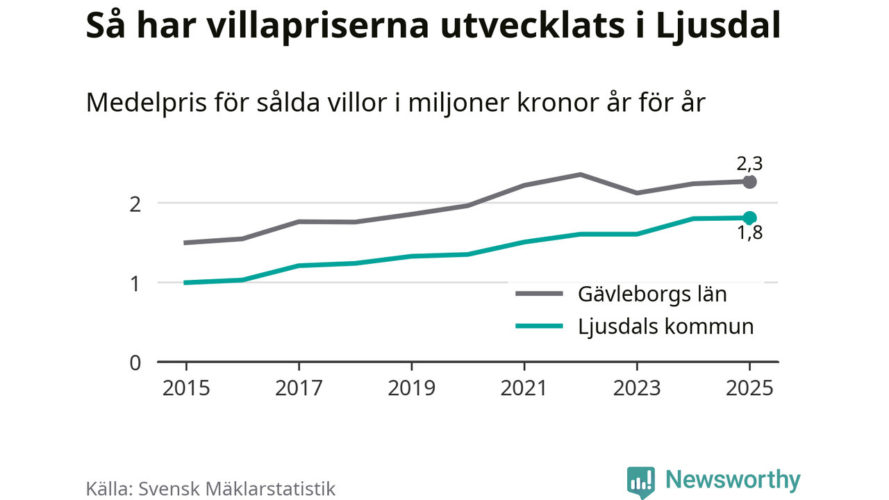 1,8 miljoner kronor är medelpriset för de villor som såldes i Ljusdals kommun under året, eller 15 822 kronor per kvadratmeter. Priserna ökade med 0,6 procent, vilket är det högsta årssnittet på åtminstone tio år. Bryter man upp siffrorna per kvartal har dock ännu högre villapriser noterats i Ljusdal vintern 2022/23.