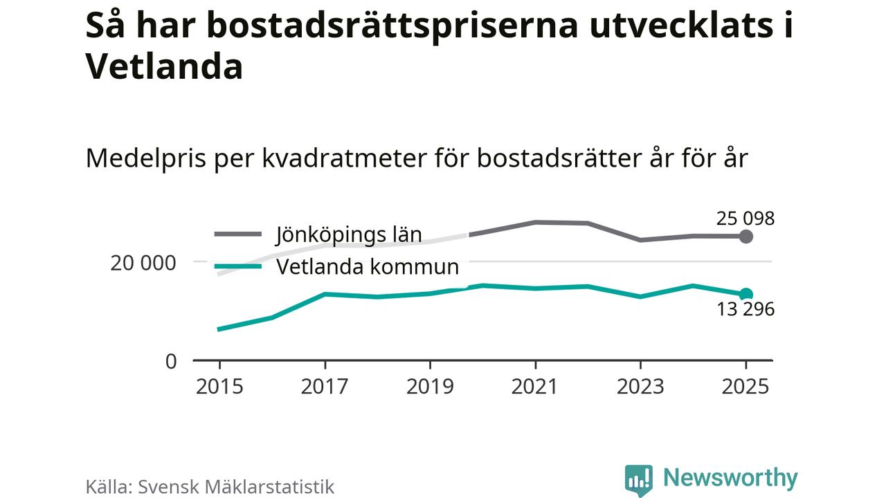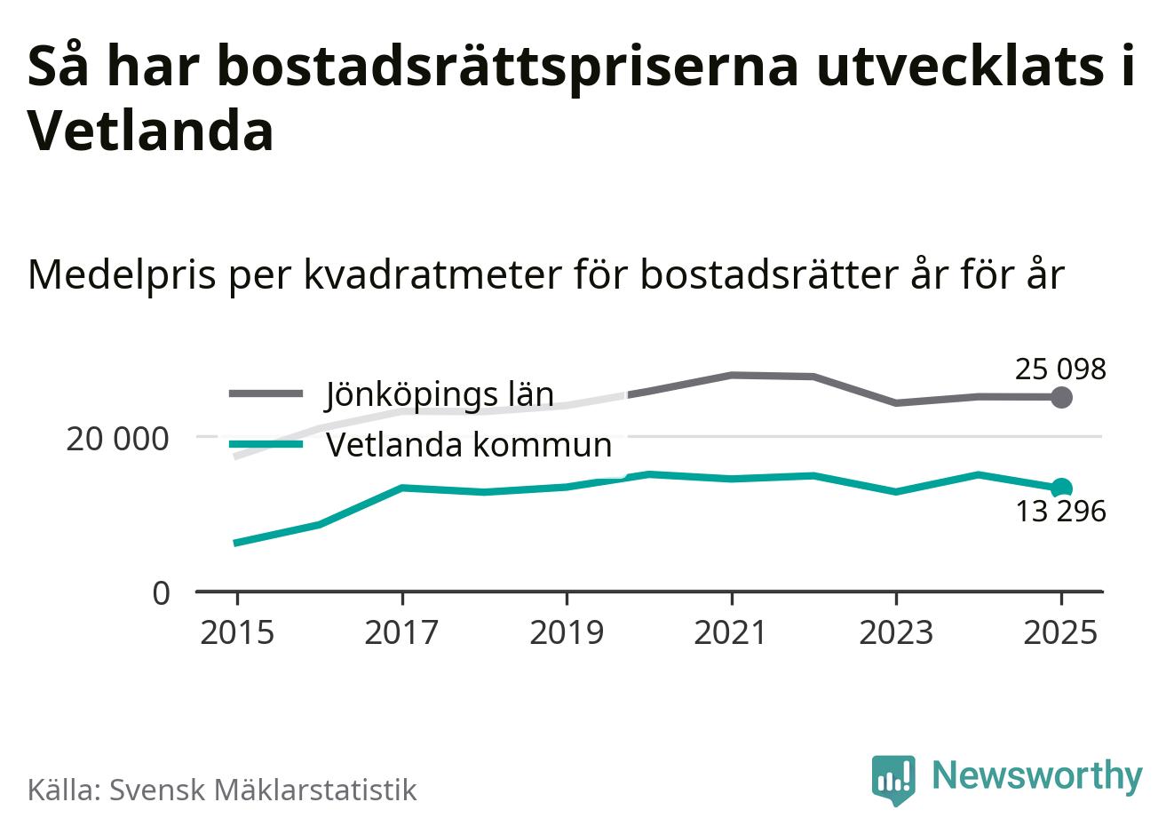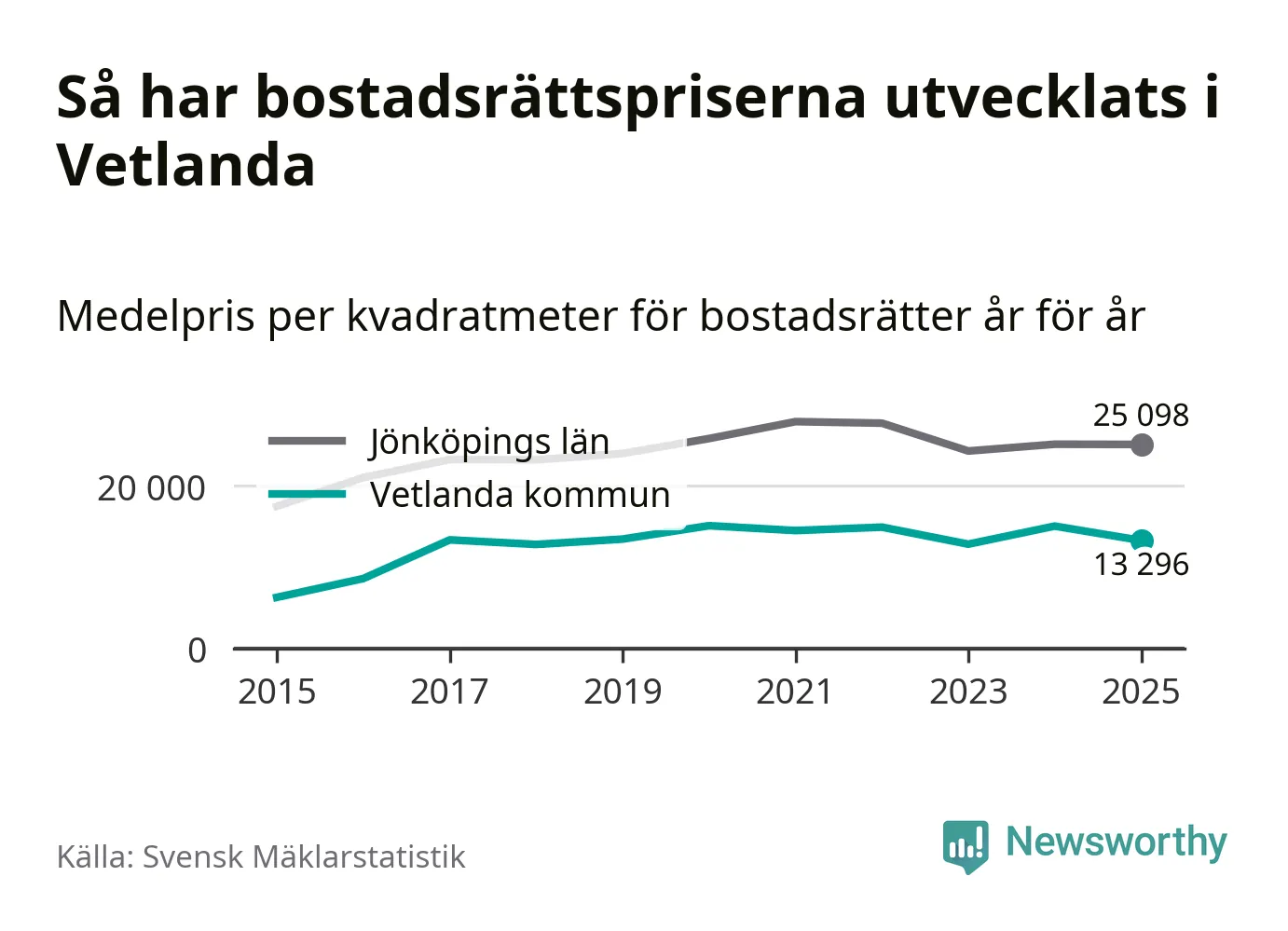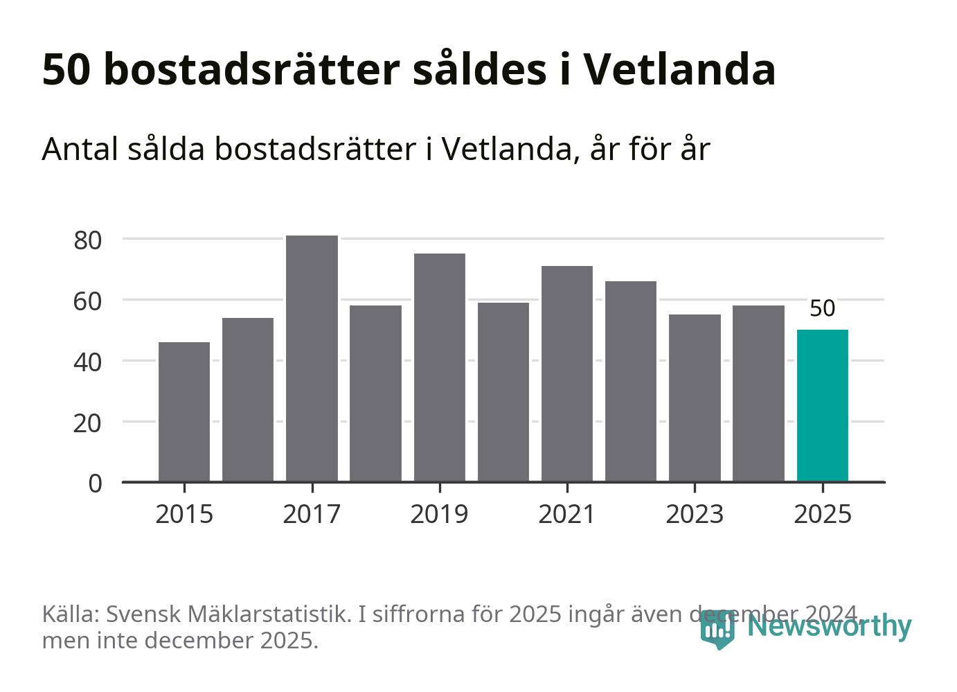 Det såldes totalt 50 bostadsrätter i Vetlanda kommun under året. Genomsnittspriset per kvadratmeter landade på 13 296 kronor. Det är en minskning med tolv procent i kommunen på ett år.