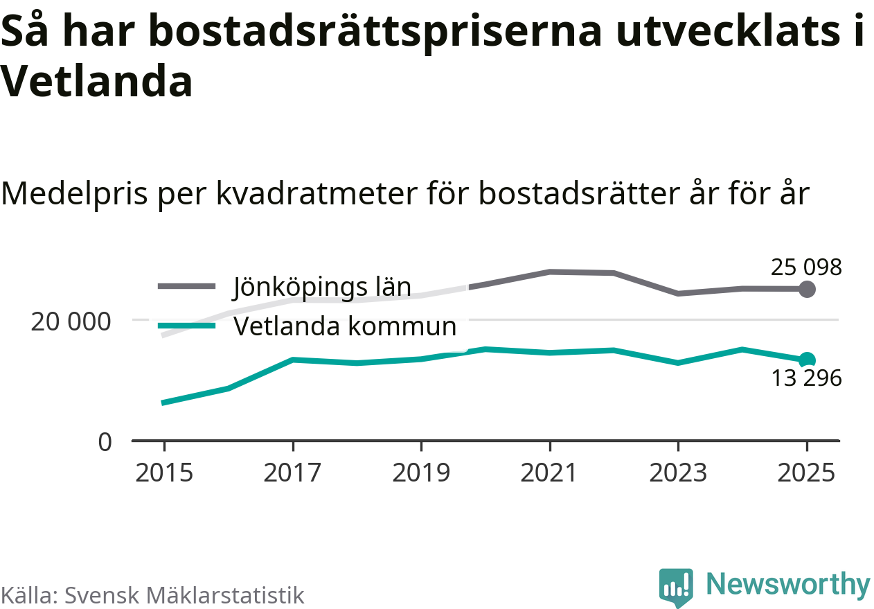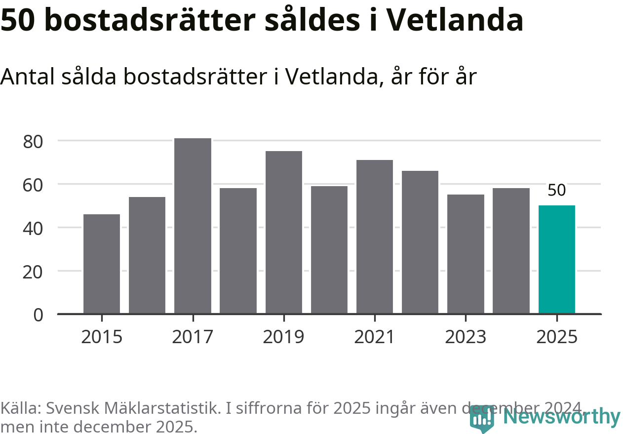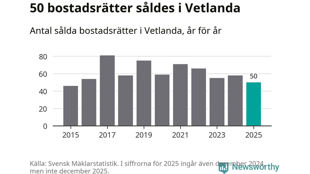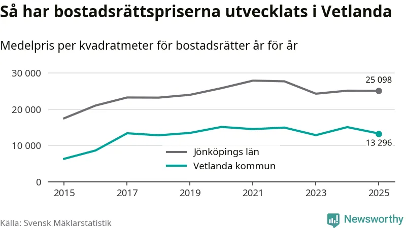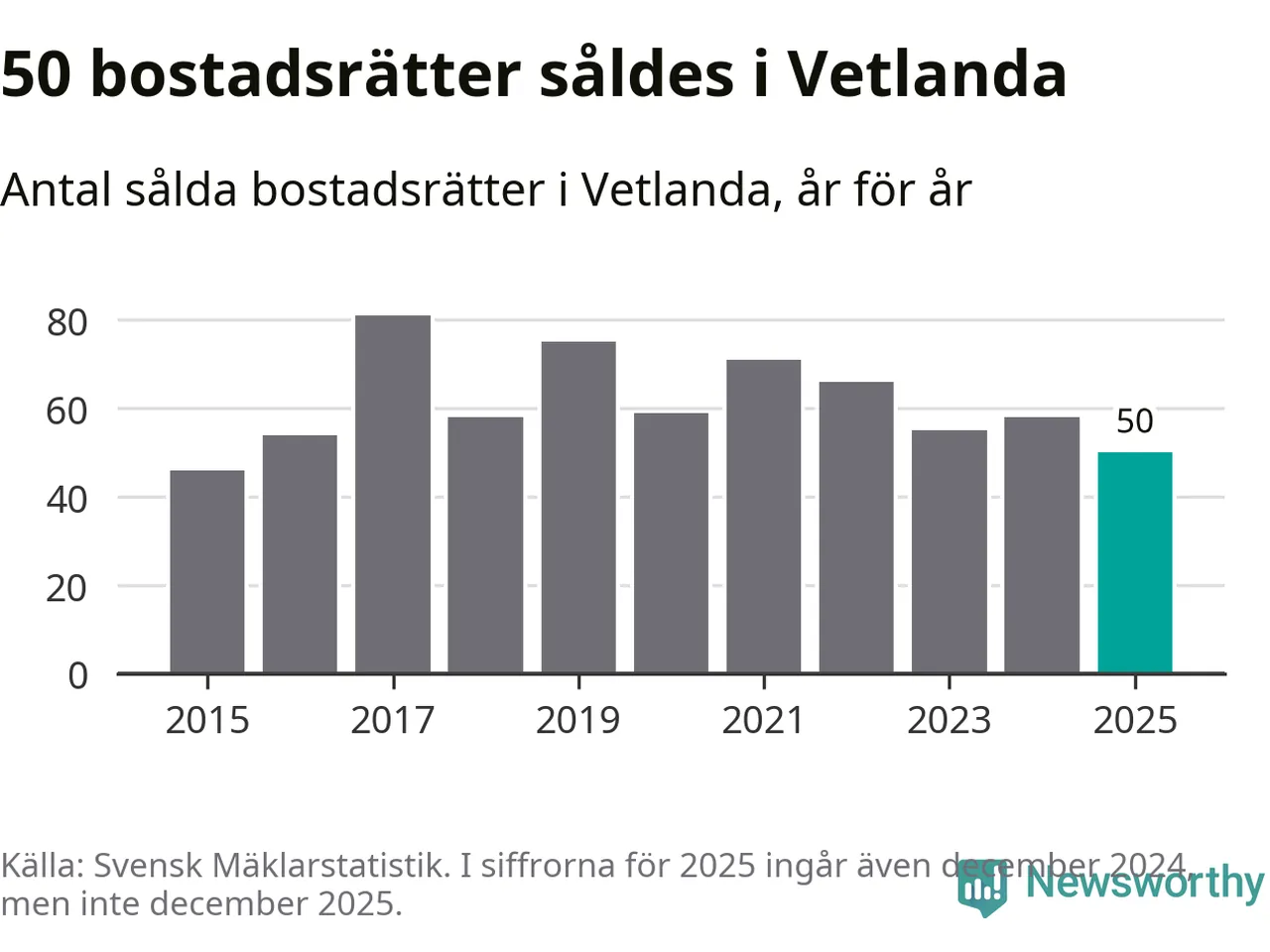 Det såldes totalt 50 bostadsrätter i Vetlanda kommun under året. Genomsnittspriset per kvadratmeter landade på 13 296 kronor. Det är en minskning med tolv procent i kommunen på ett år.
