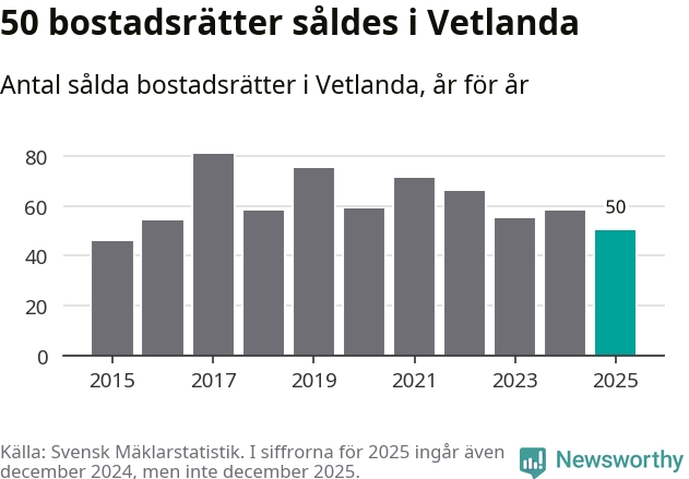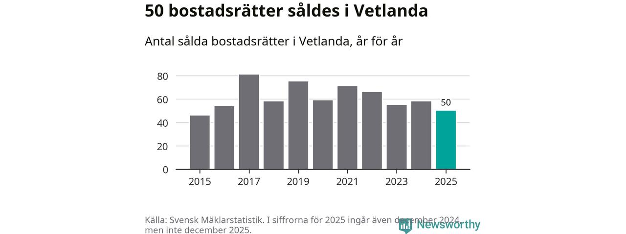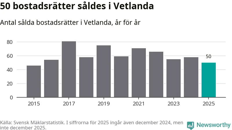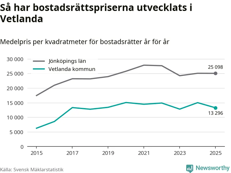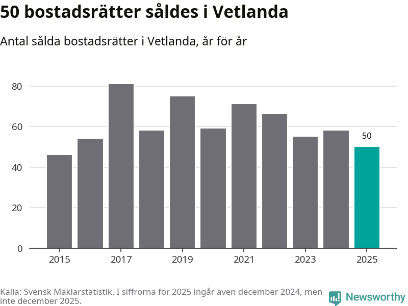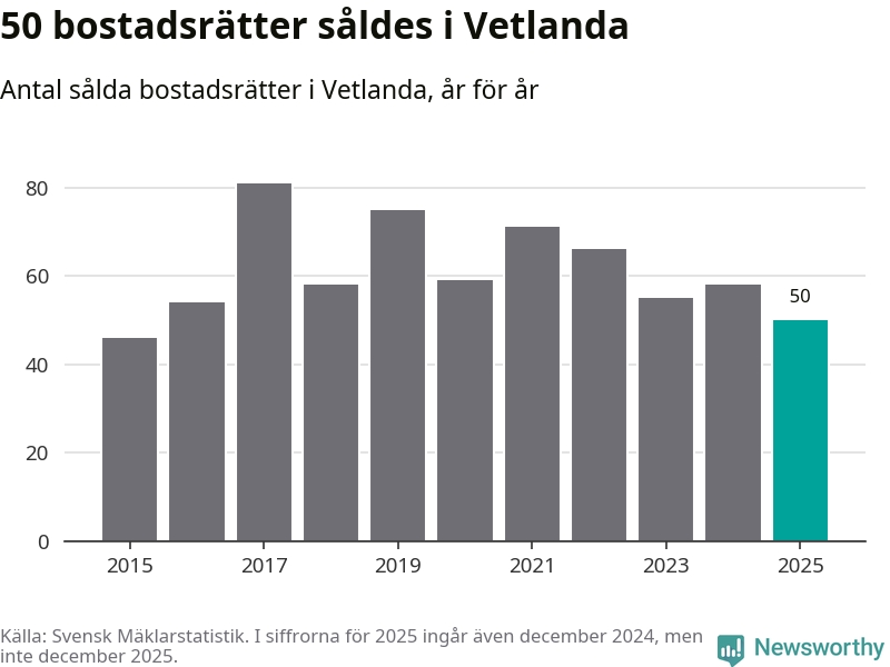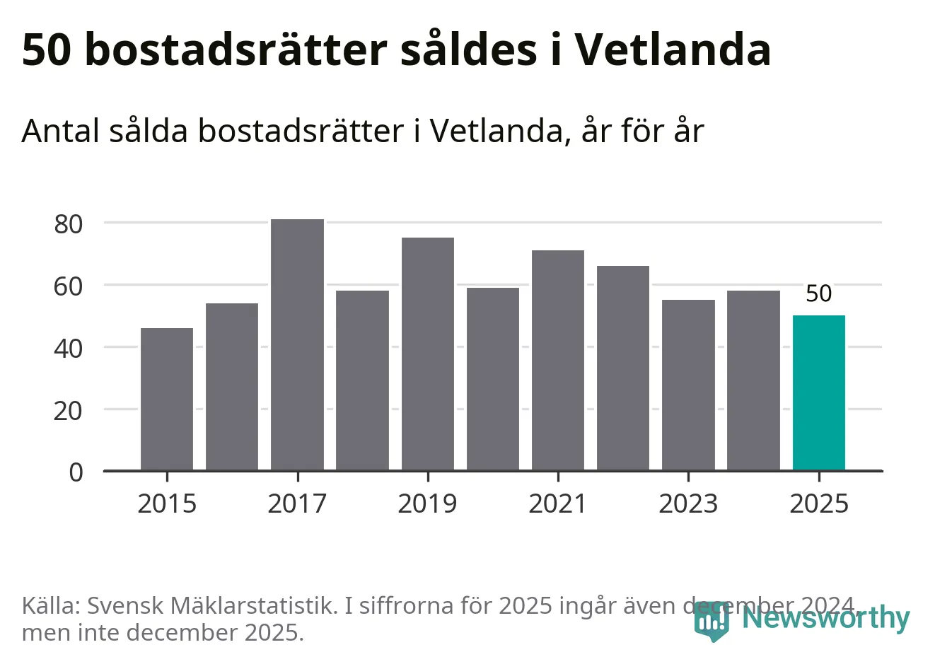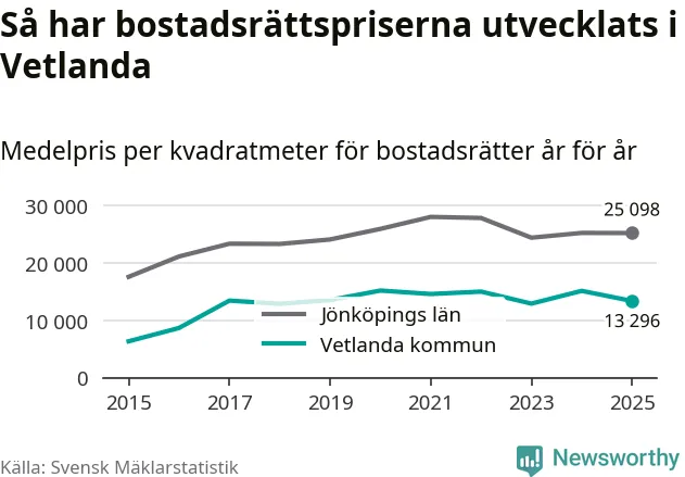 Det såldes totalt 50 bostadsrätter i Vetlanda kommun under året. Genomsnittspriset per kvadratmeter landade på 13 296 kronor. Det är en minskning med tolv procent i kommunen på ett år.