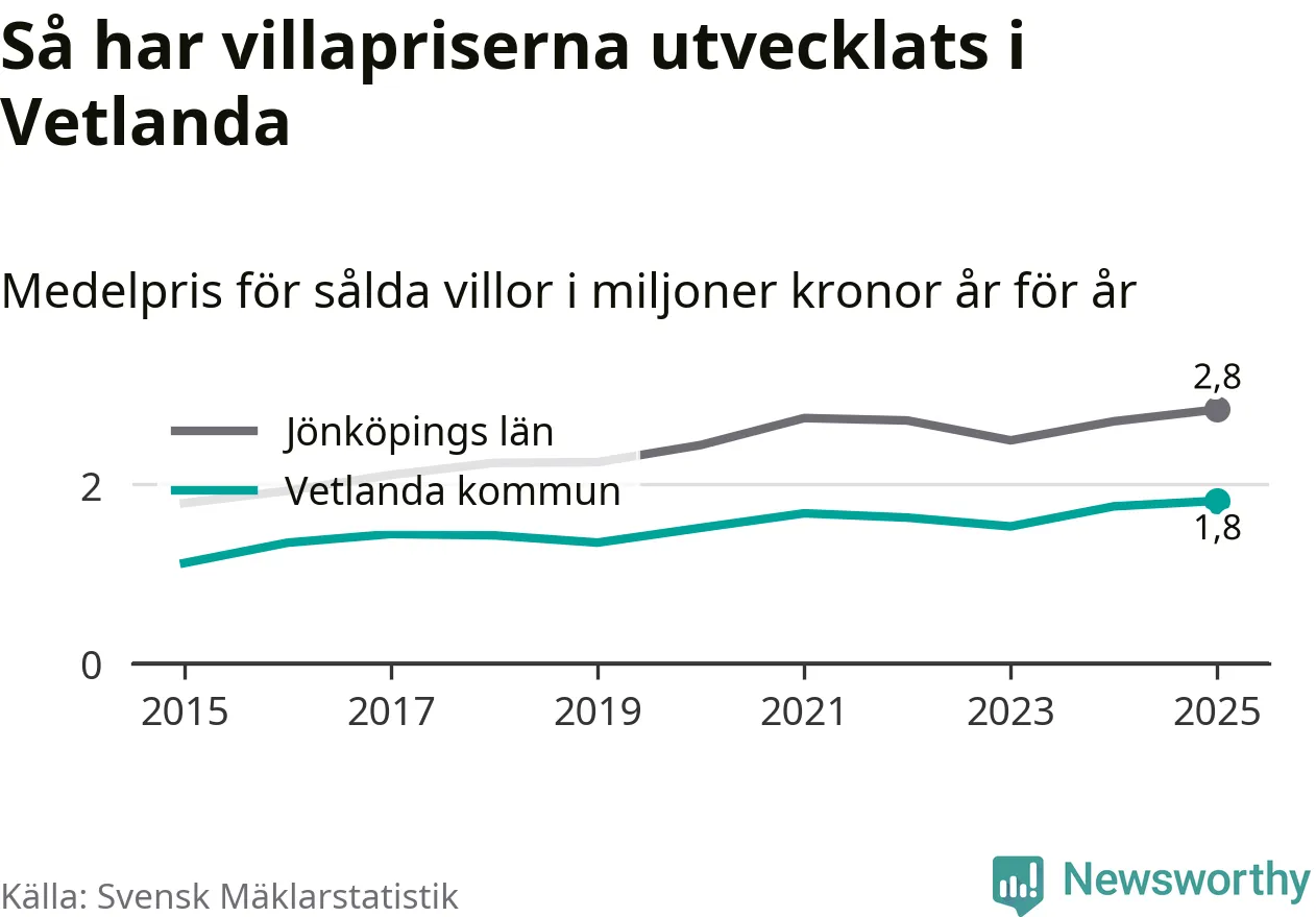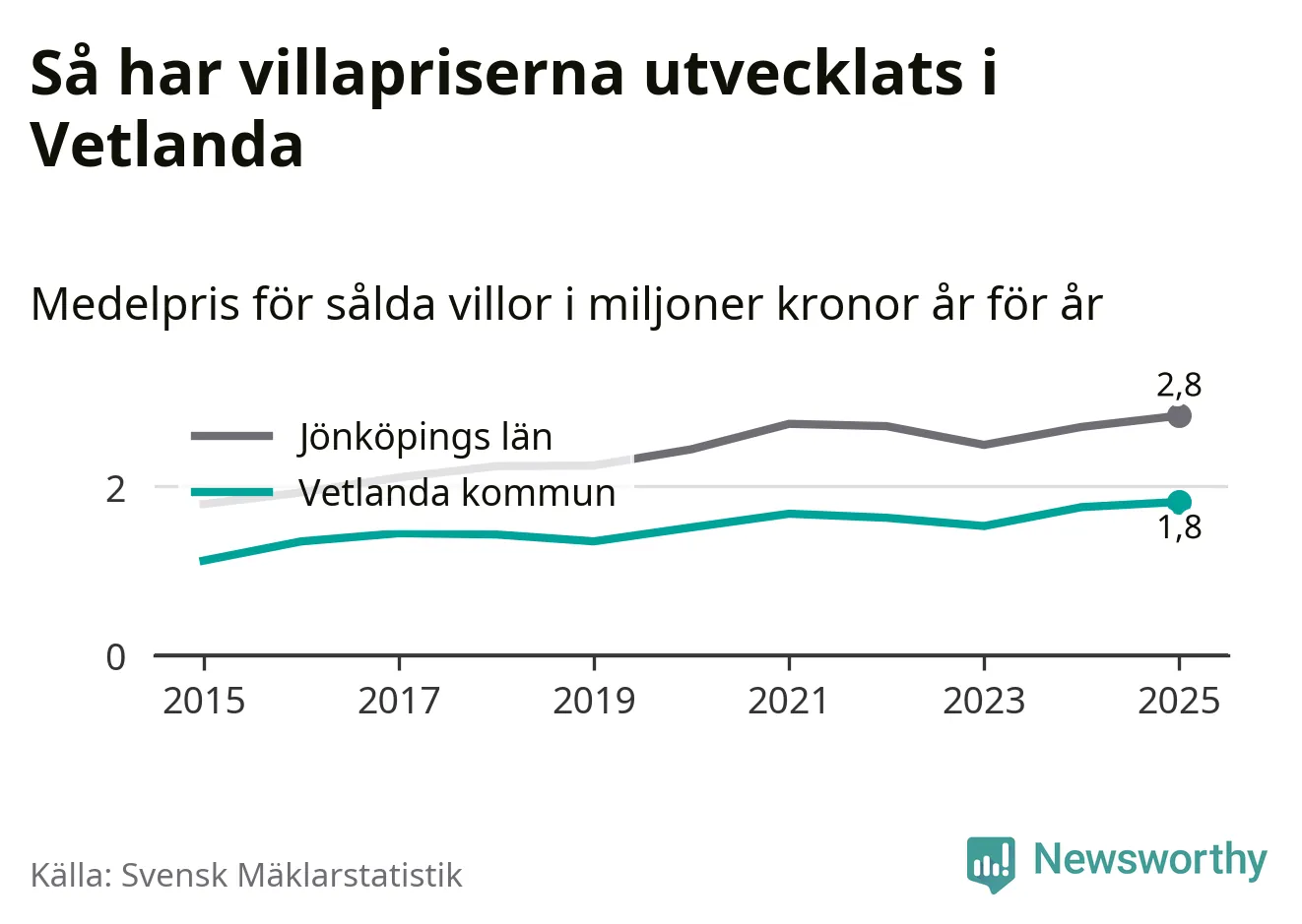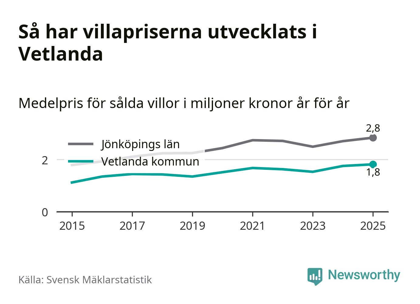 1,8 miljoner kronor är medelpriset för de villor som såldes i Vetlanda kommun under året, eller 13 957 kronor per kvadratmeter. Det innebär en prisökning med fyra procent på ett år. Det är det högsta årssnittet på åtminstone tio år.