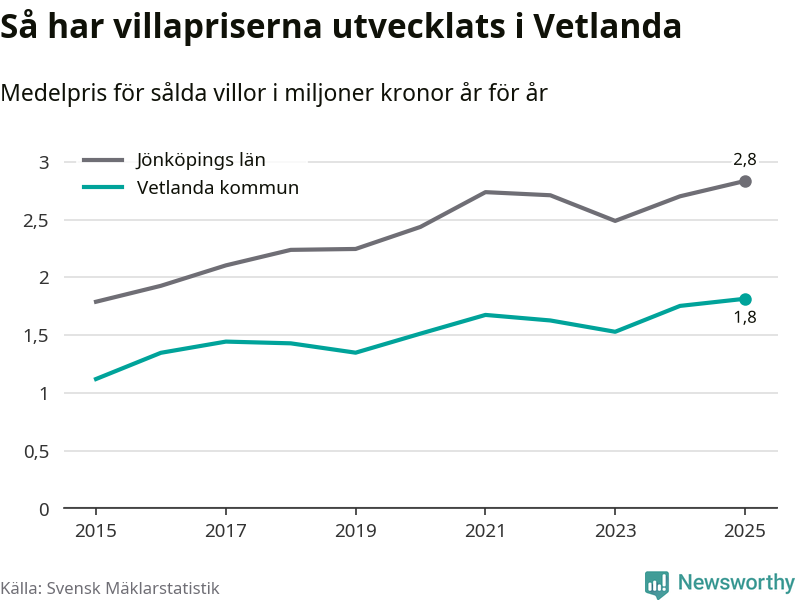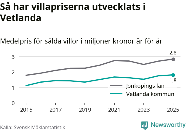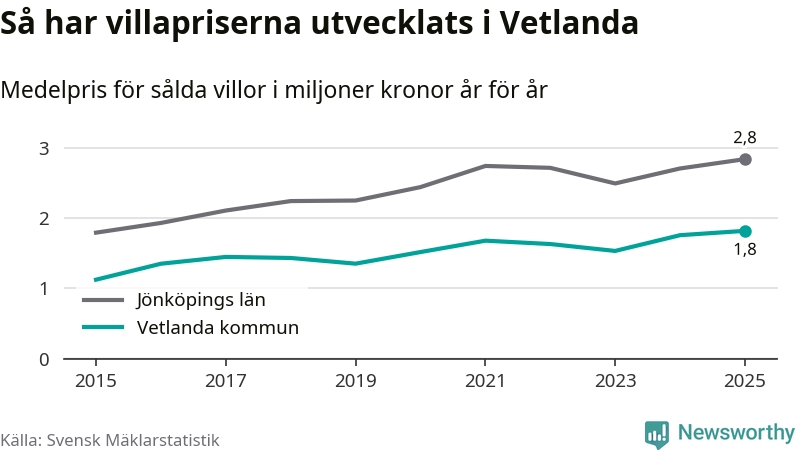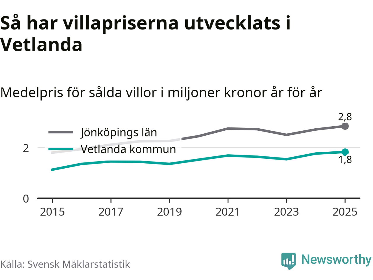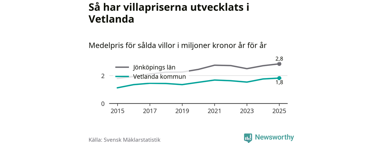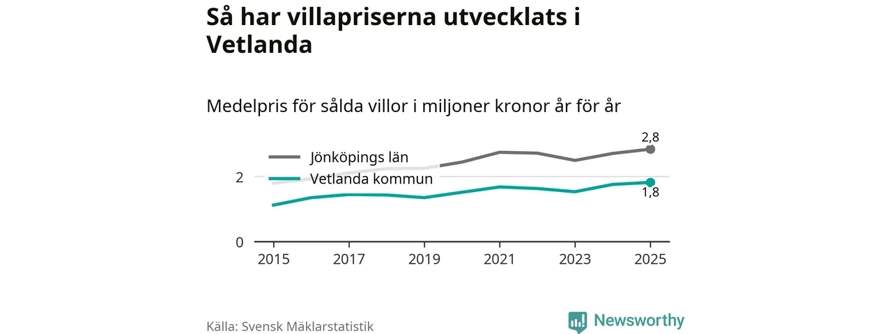 1,8 miljoner kronor är medelpriset för de villor som såldes i Vetlanda kommun under året, eller 13 957 kronor per kvadratmeter. Det innebär en prisökning med fyra procent på ett år. Det är det högsta årssnittet på åtminstone tio år.