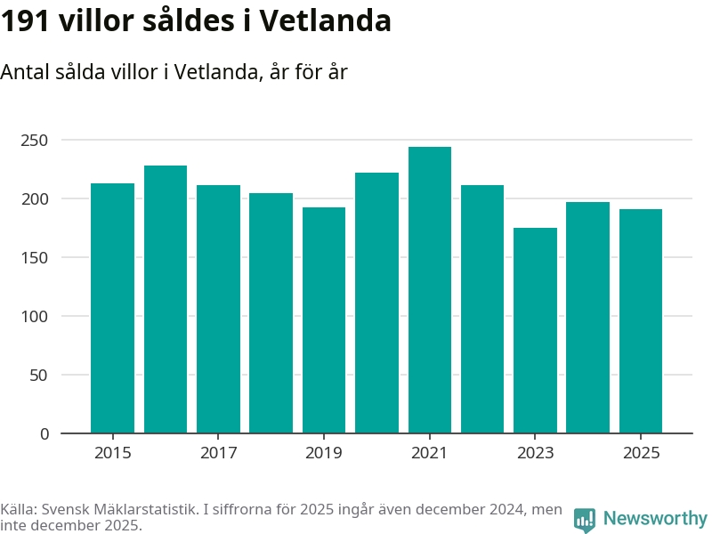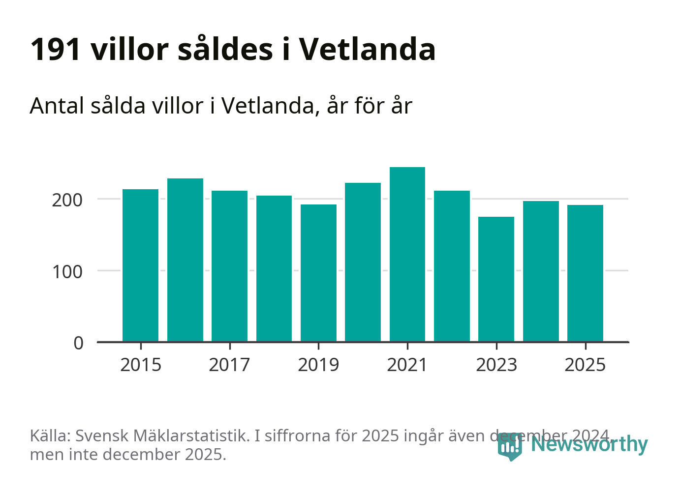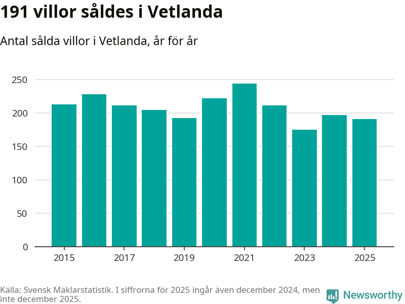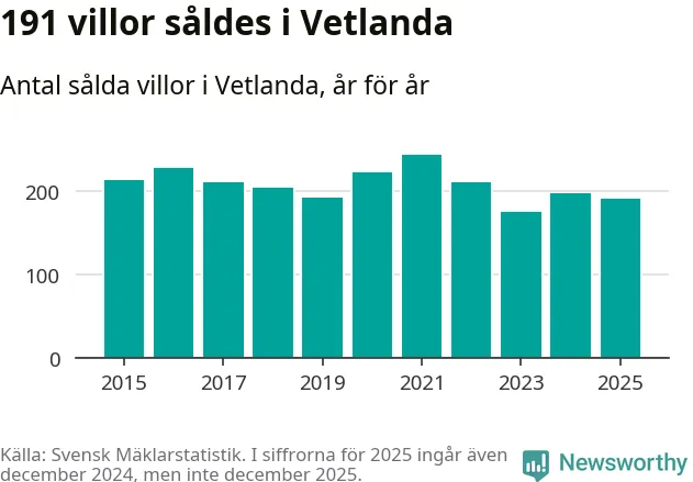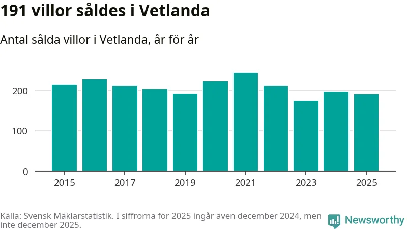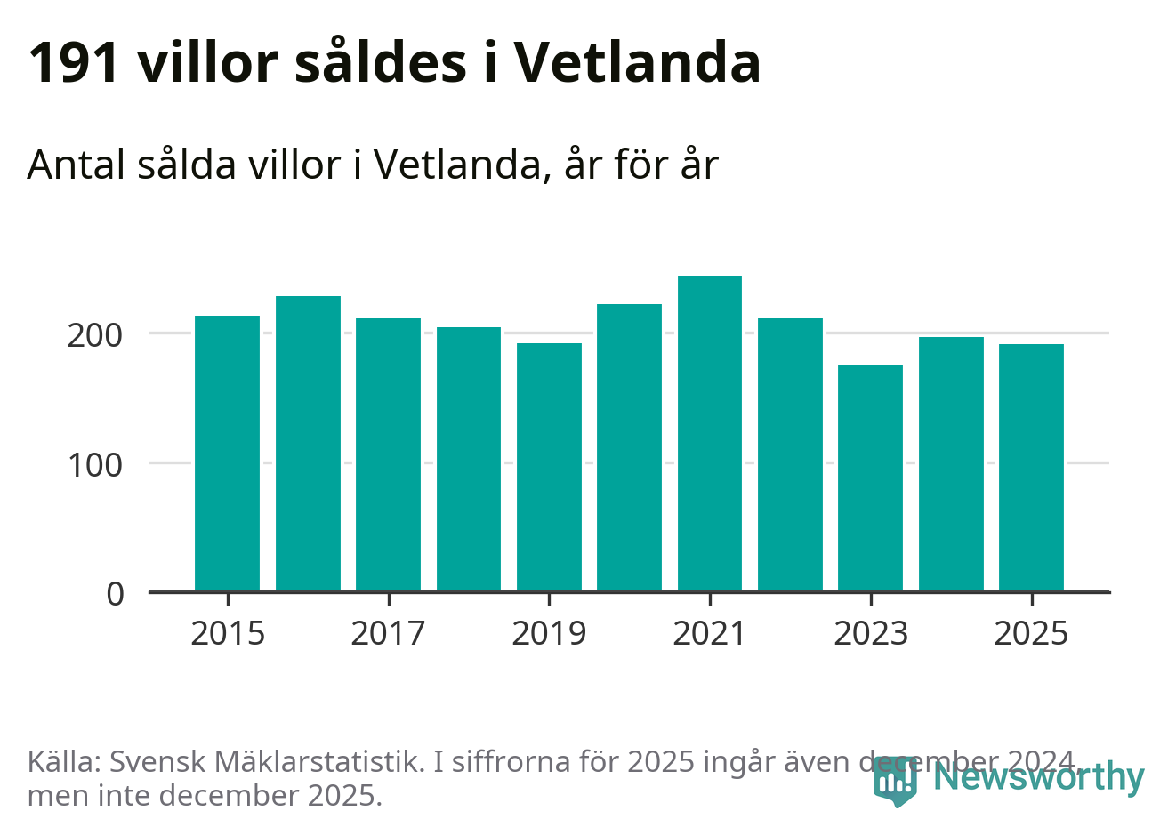Däremot minskade antalet sålda villor. Totalt såldes 191 villor, att jämföra med 197 under 2024.