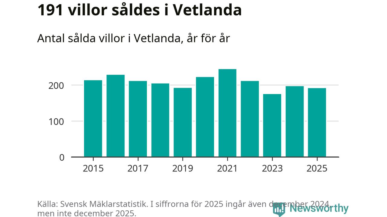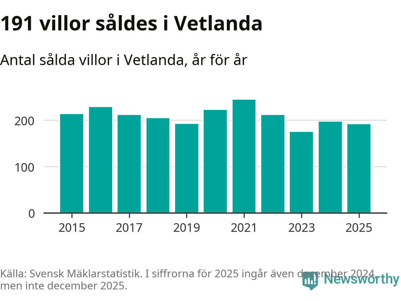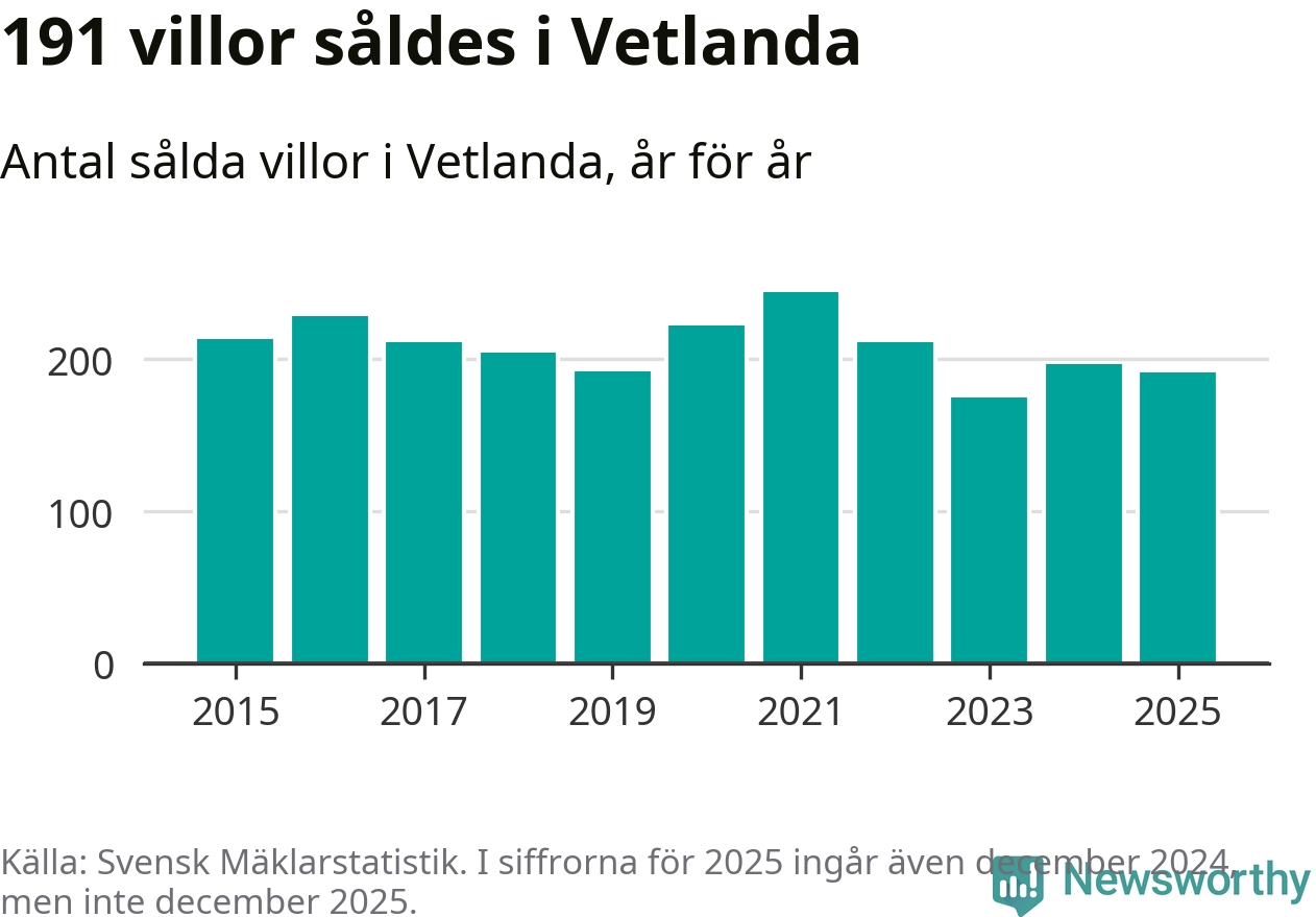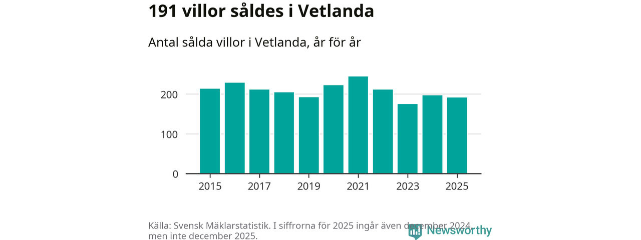 Däremot minskade antalet sålda villor. Totalt såldes 191 villor, att jämföra med 197 under 2024.