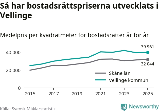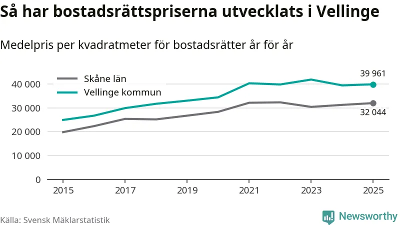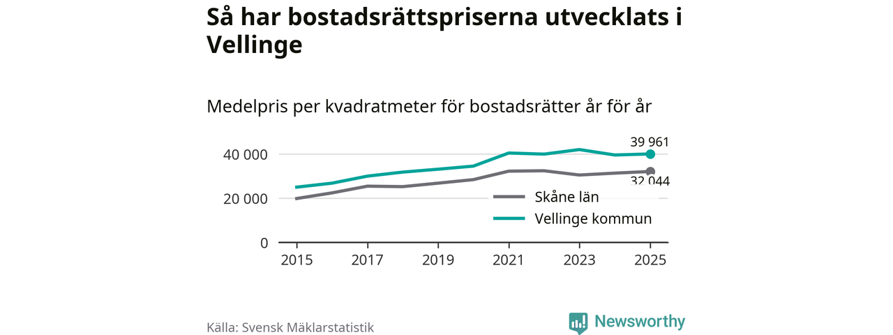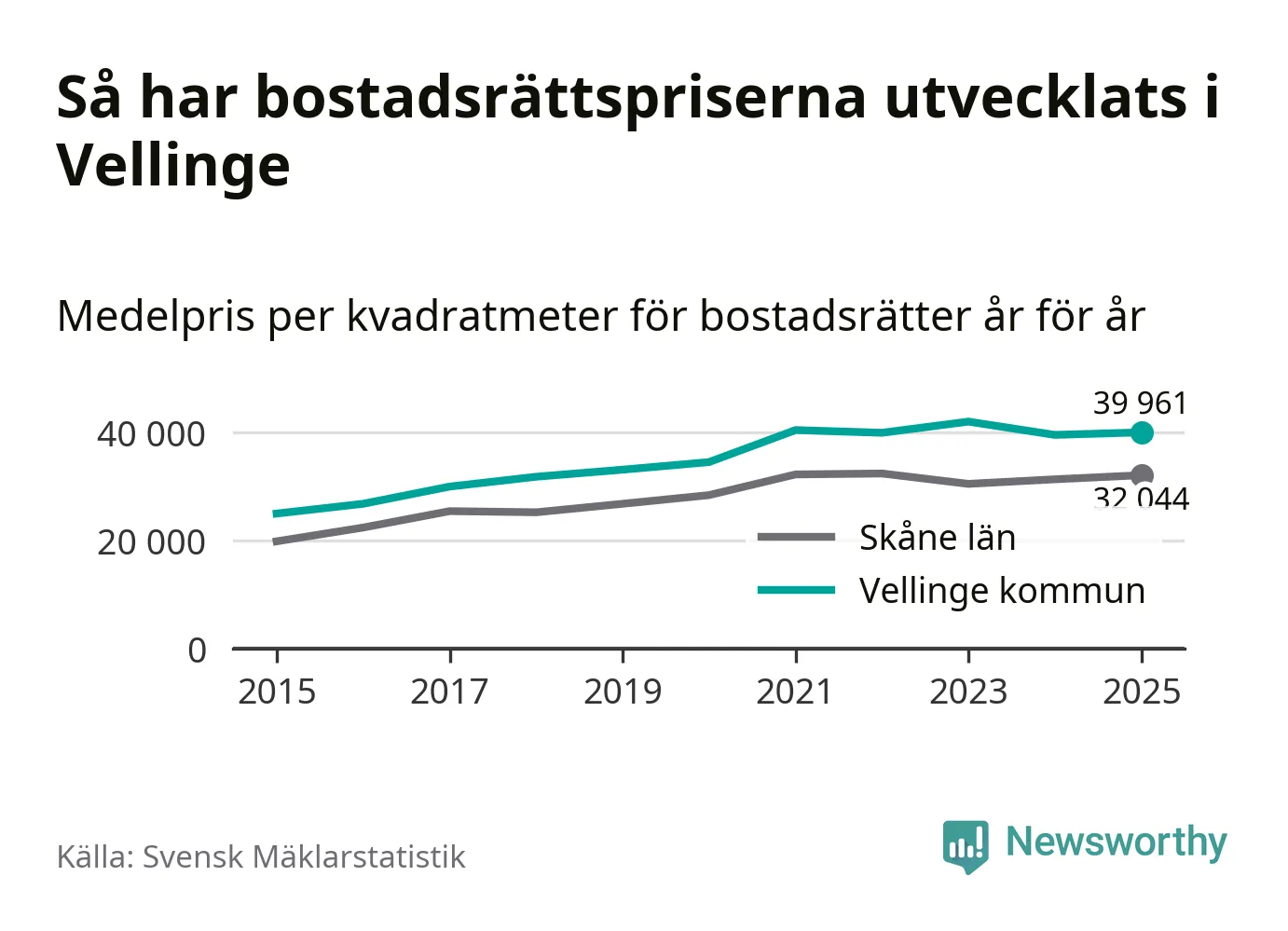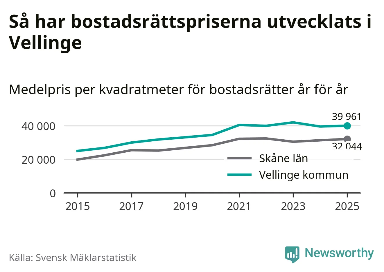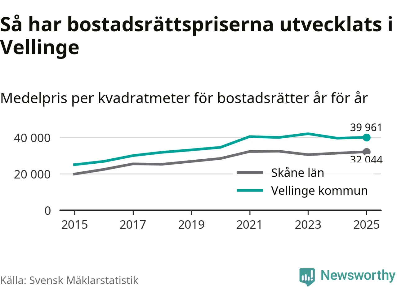 Det såldes totalt 210 bostadsrätter i Vellinge kommun under året. Genomsnittspriset per kvadratmeter landade på 39 961 kronor. Det är en ökning med en procent i kommunen på ett år.