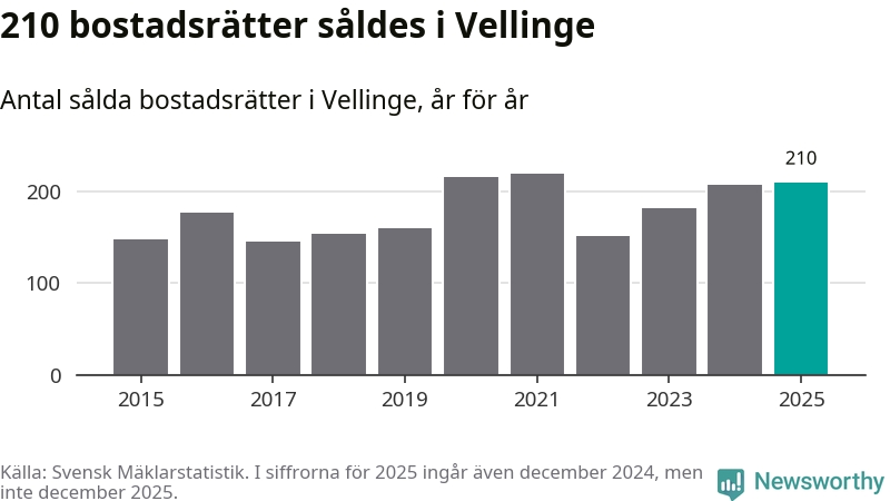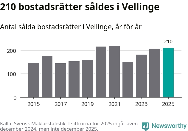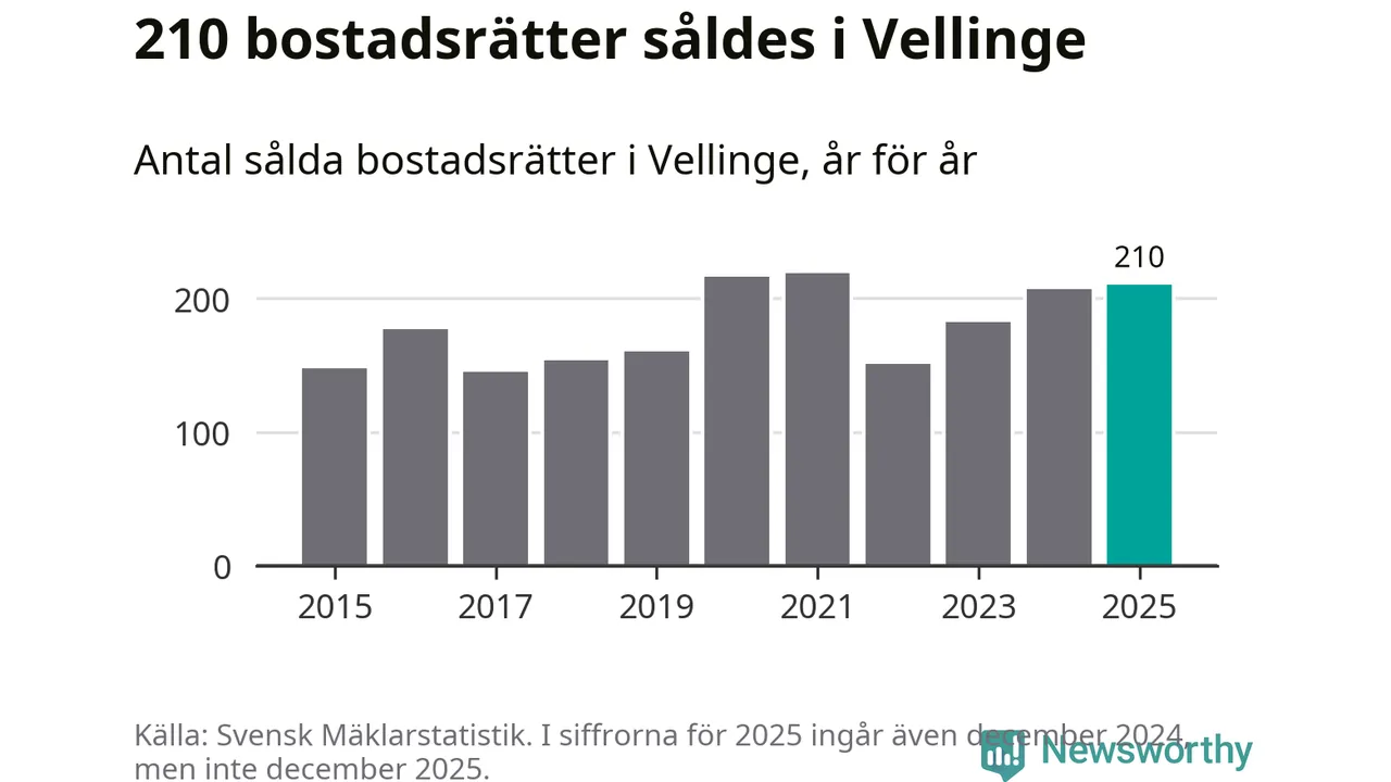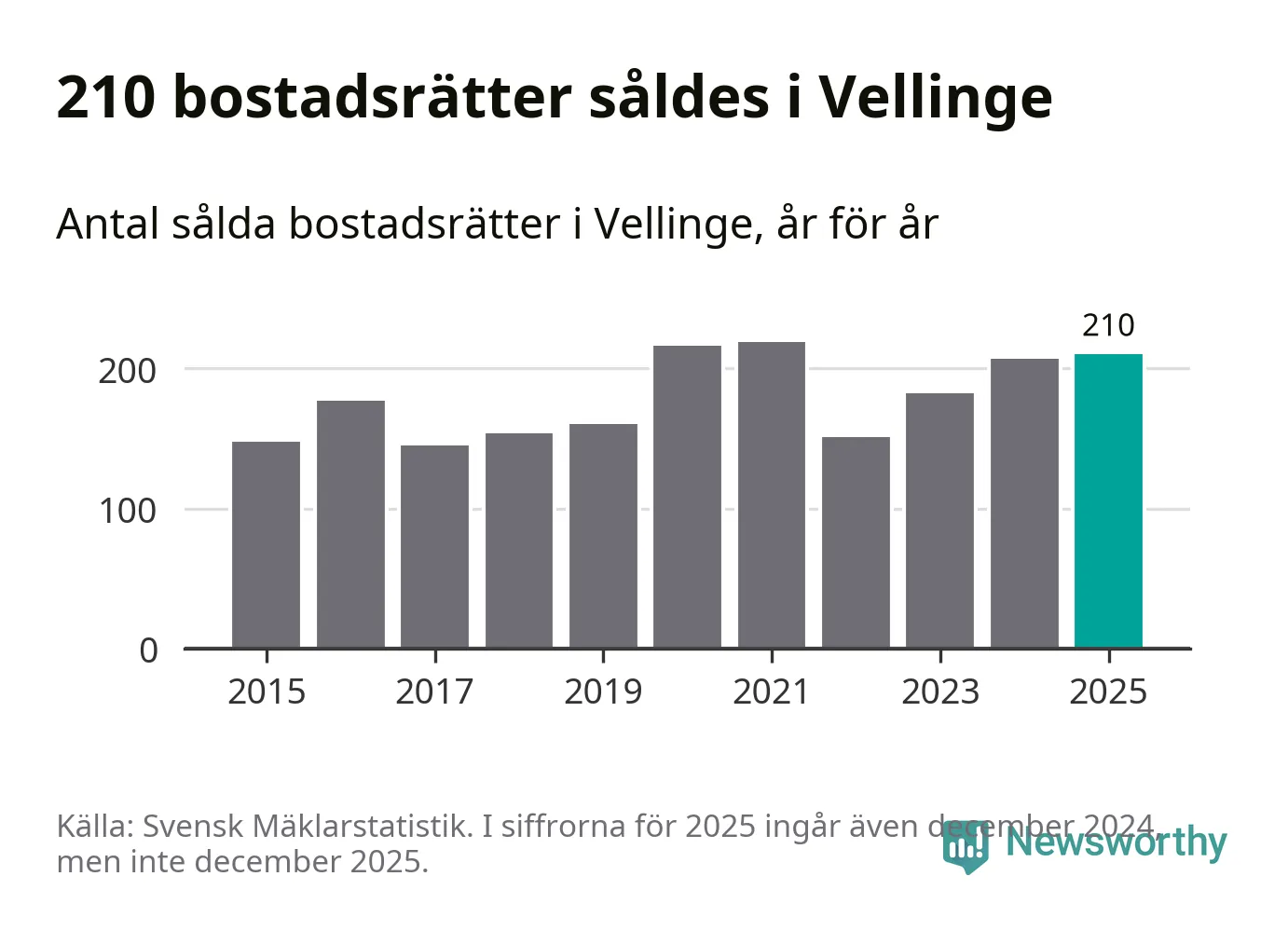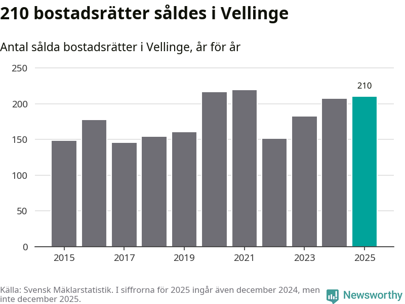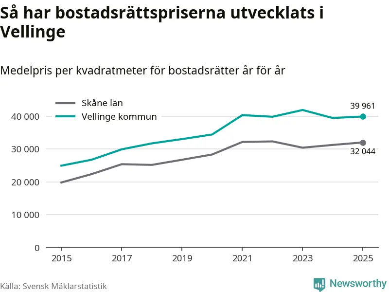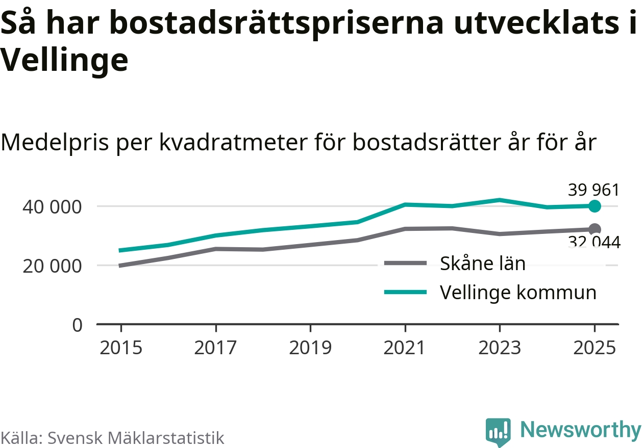 Det såldes totalt 210 bostadsrätter i Vellinge kommun under året. Genomsnittspriset per kvadratmeter landade på 39 961 kronor. Det är en ökning med en procent i kommunen på ett år.