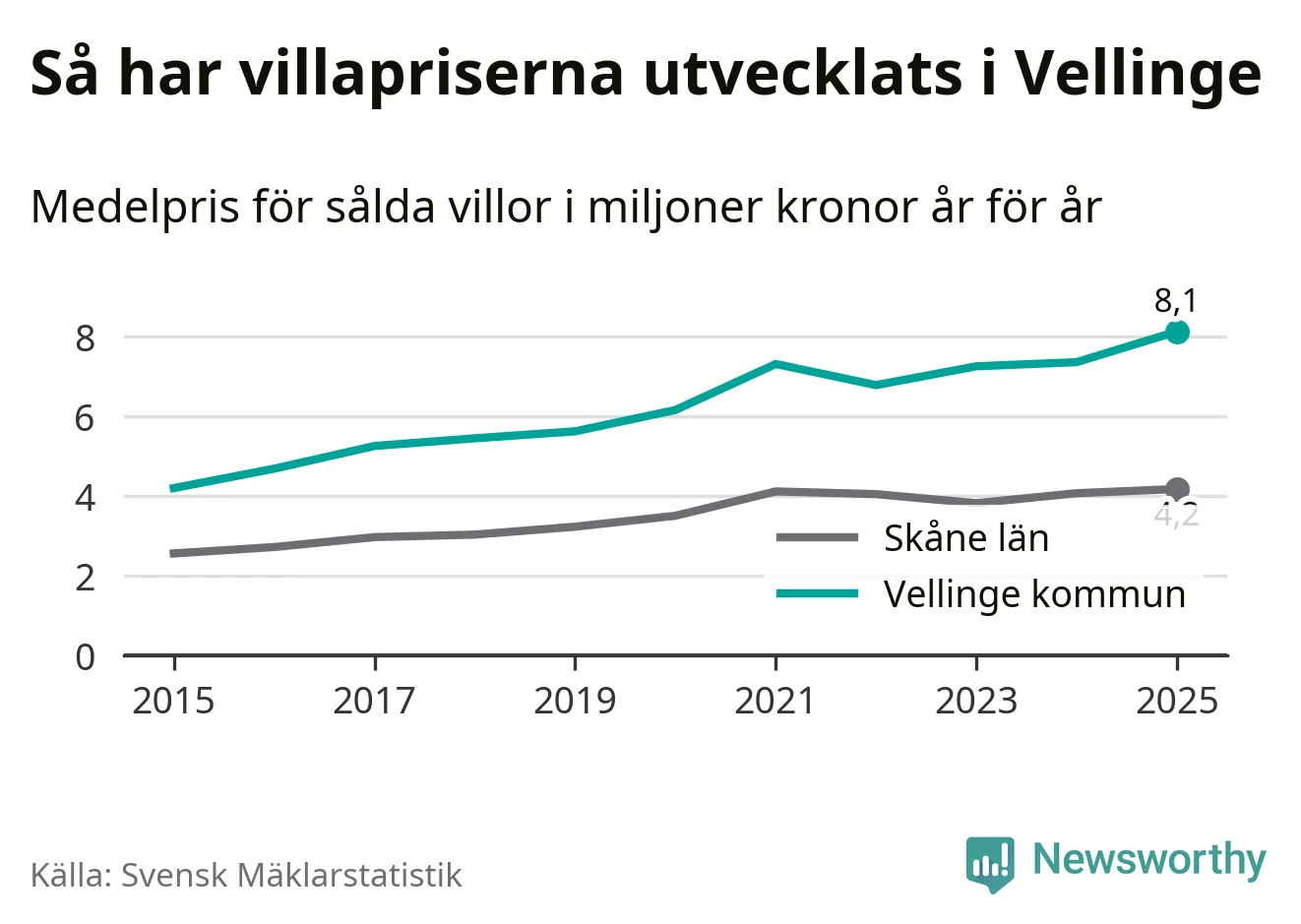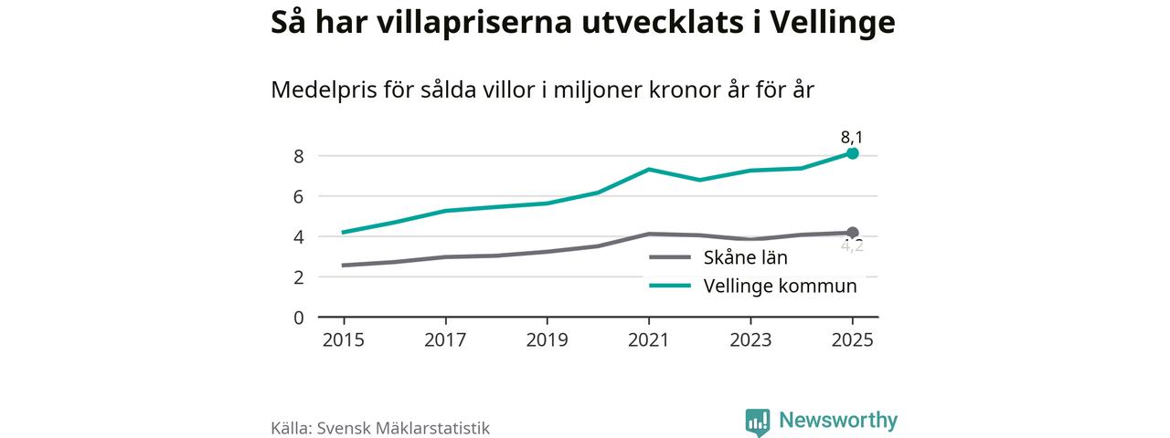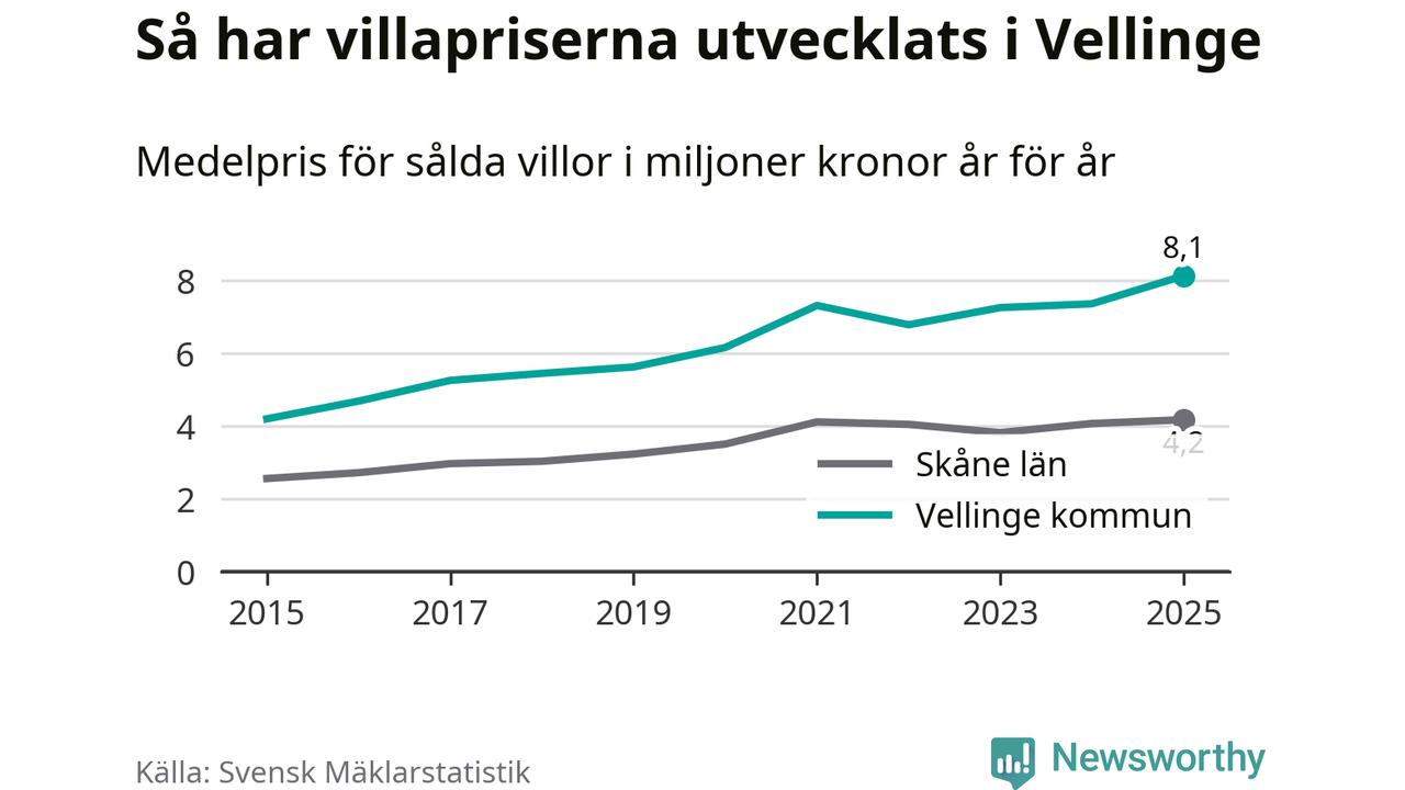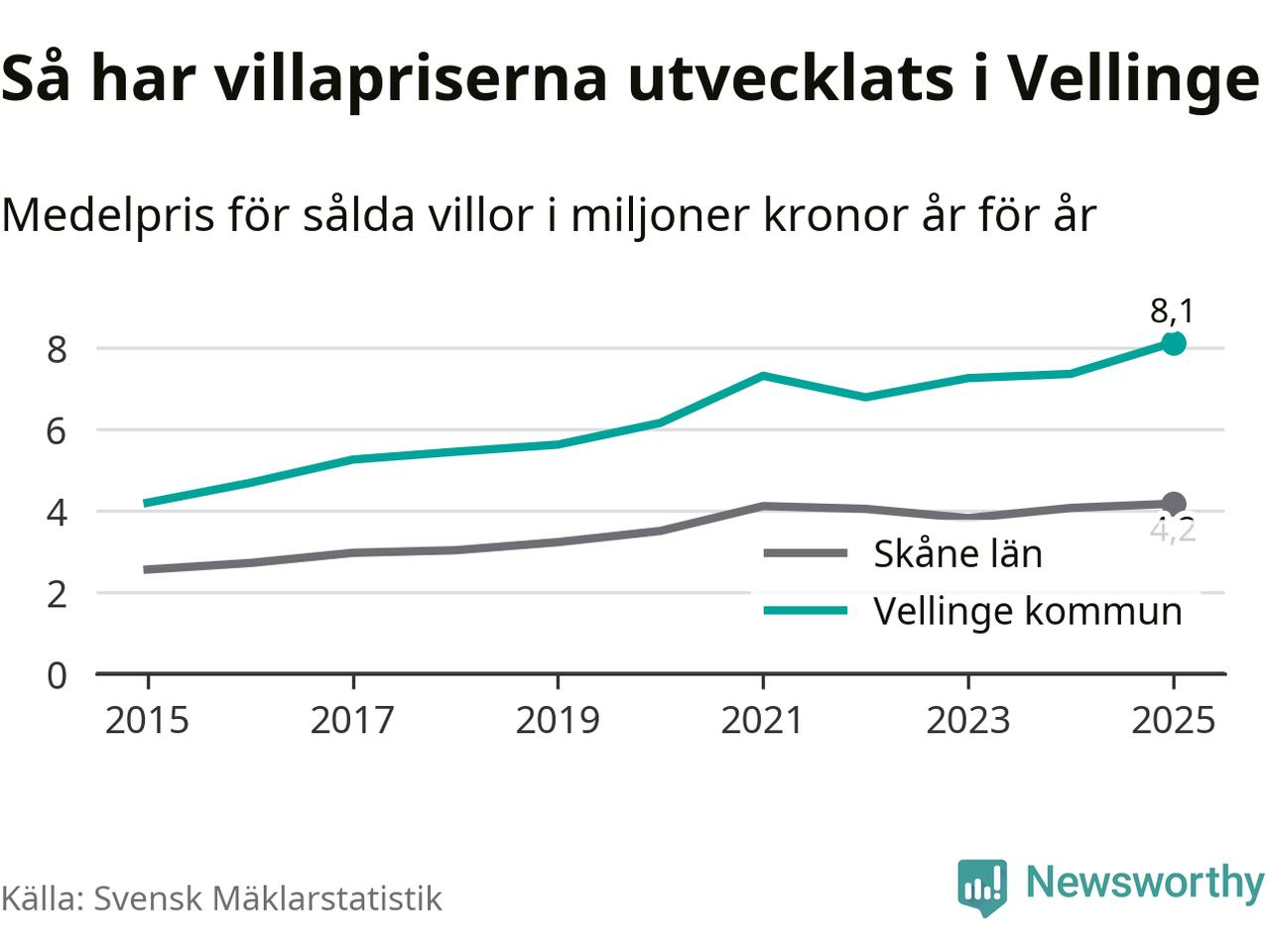 8,1 miljoner kronor är medelpriset för de villor som såldes i Vellinge kommun under året, eller 57 271 kronor per kvadratmeter. Det innebär en prisökning med tio procent på ett år. Det är det högsta årssnittet på åtminstone tio år.