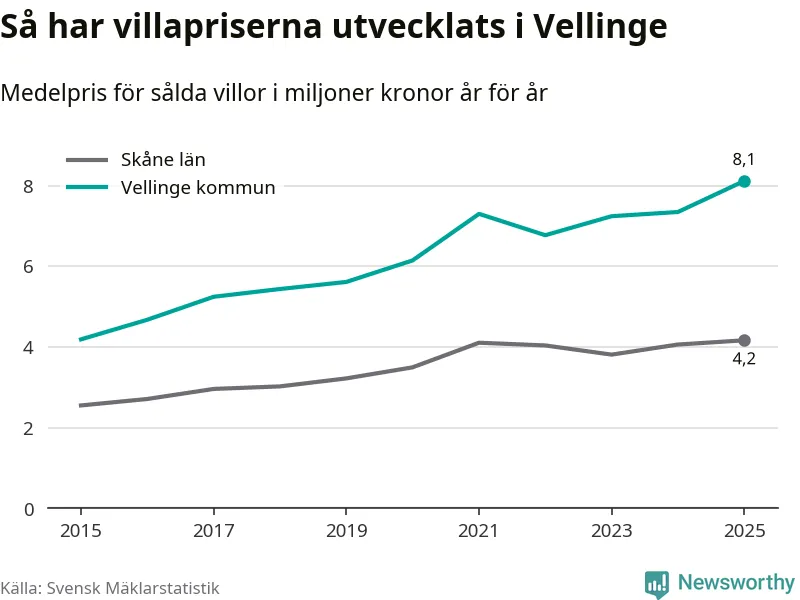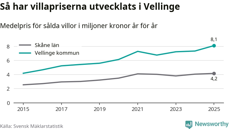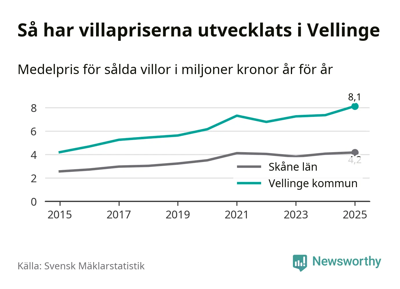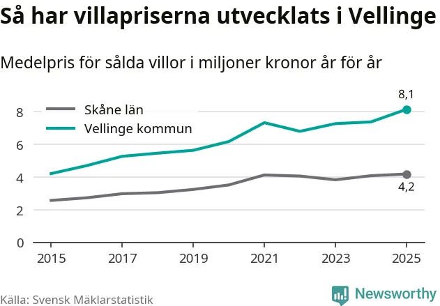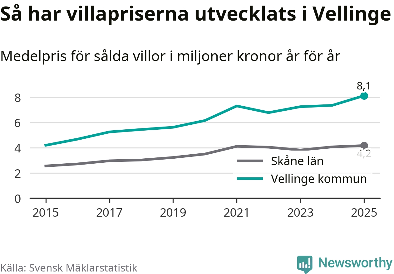8,1 miljoner kronor är medelpriset för de villor som såldes i Vellinge kommun under året, eller 57 271 kronor per kvadratmeter. Det innebär en prisökning med tio procent på ett år. Det är det högsta årssnittet på åtminstone tio år.