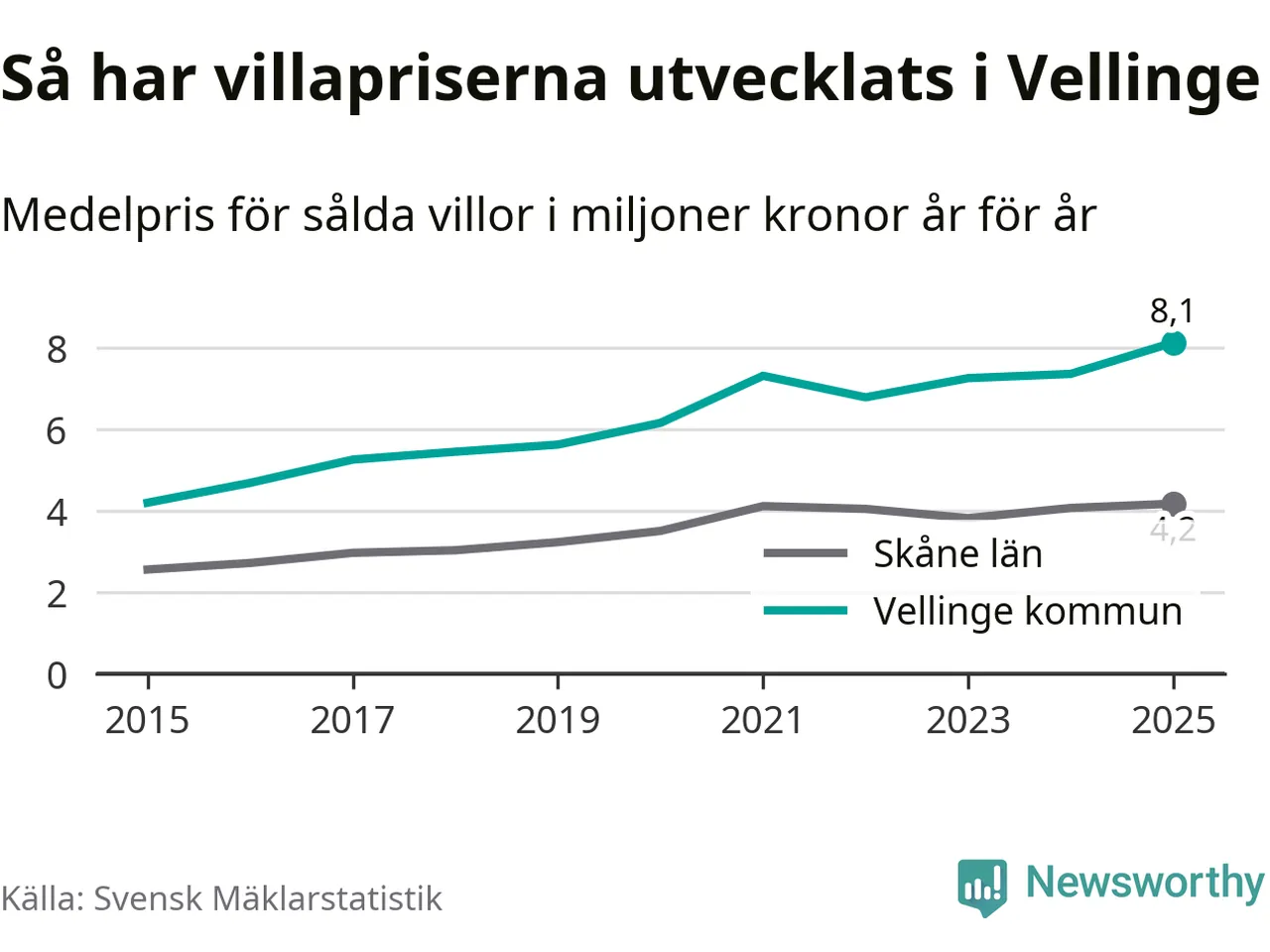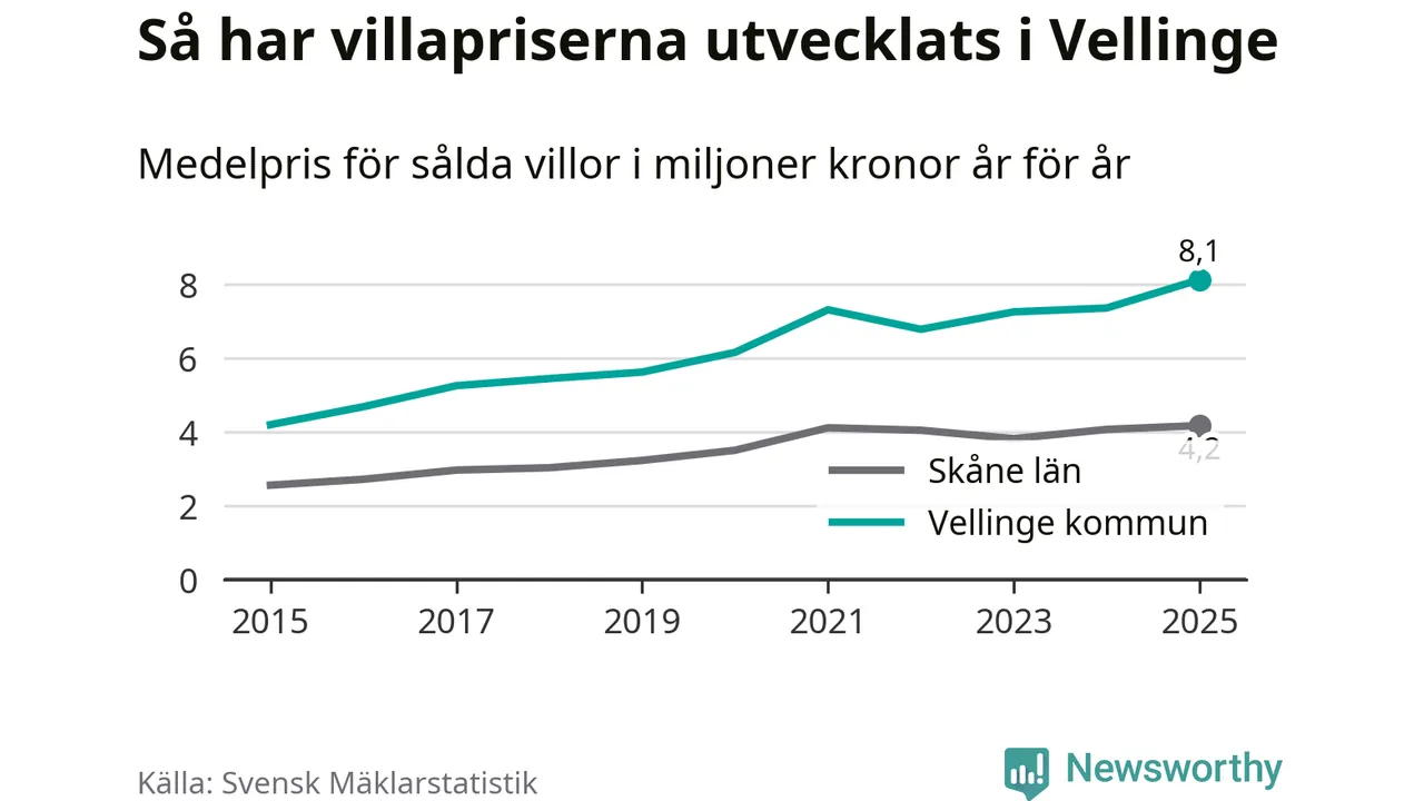 Bostadsmarknaden i Sverige närmar sig nivån före räntesmockan 2022. I Vellinge nådde priserna på villor en ny rekordnivå.