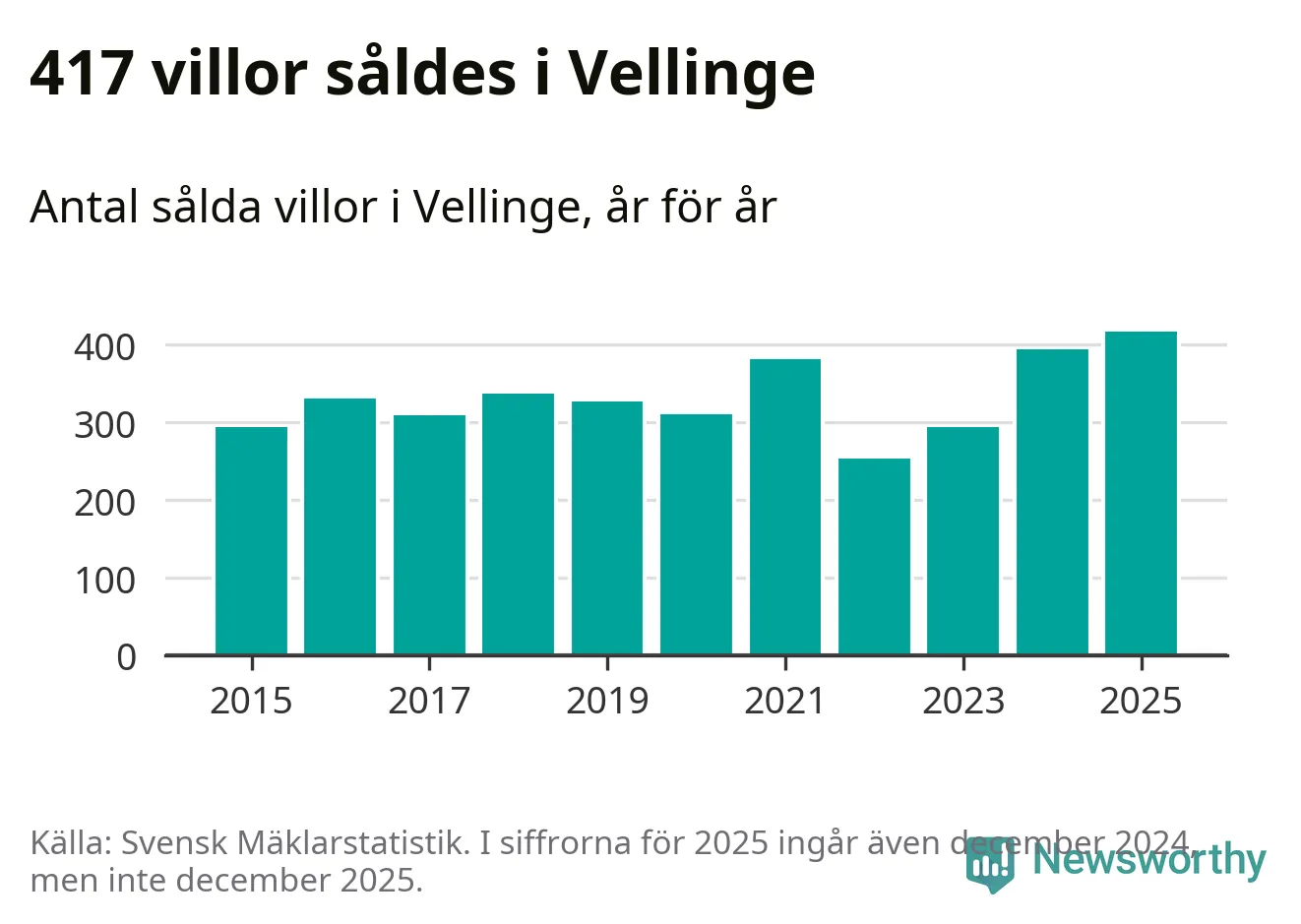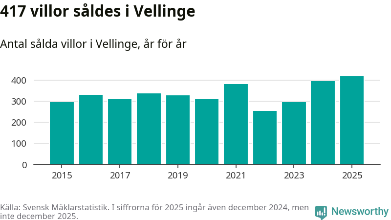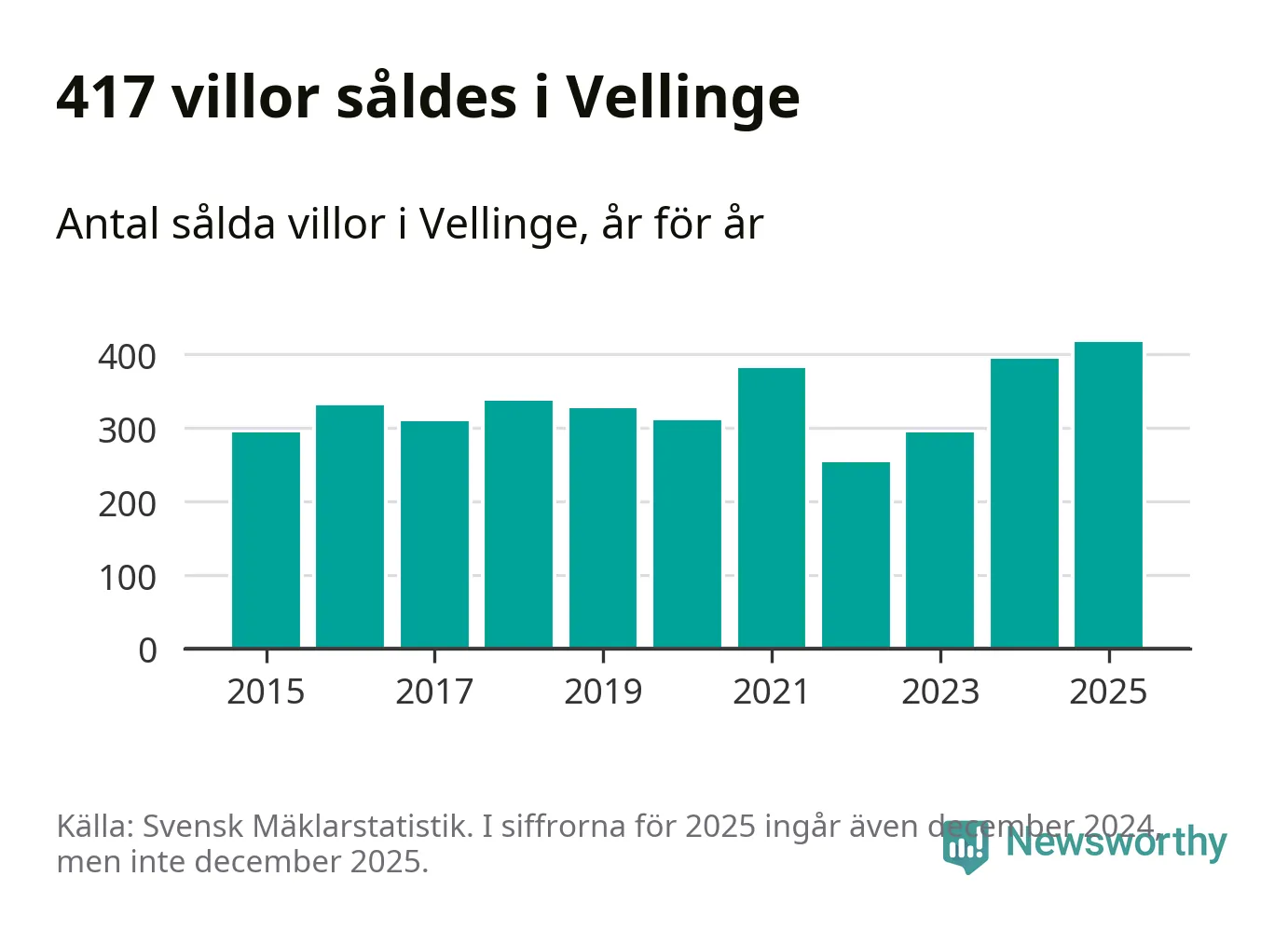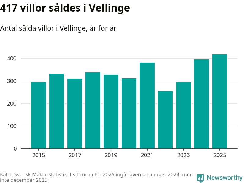 Antalet sålda villor ökade också. Totalt såldes 417 villor, att jämföra med 394 under 2024. Det är fler än något annat år sedan 2015.