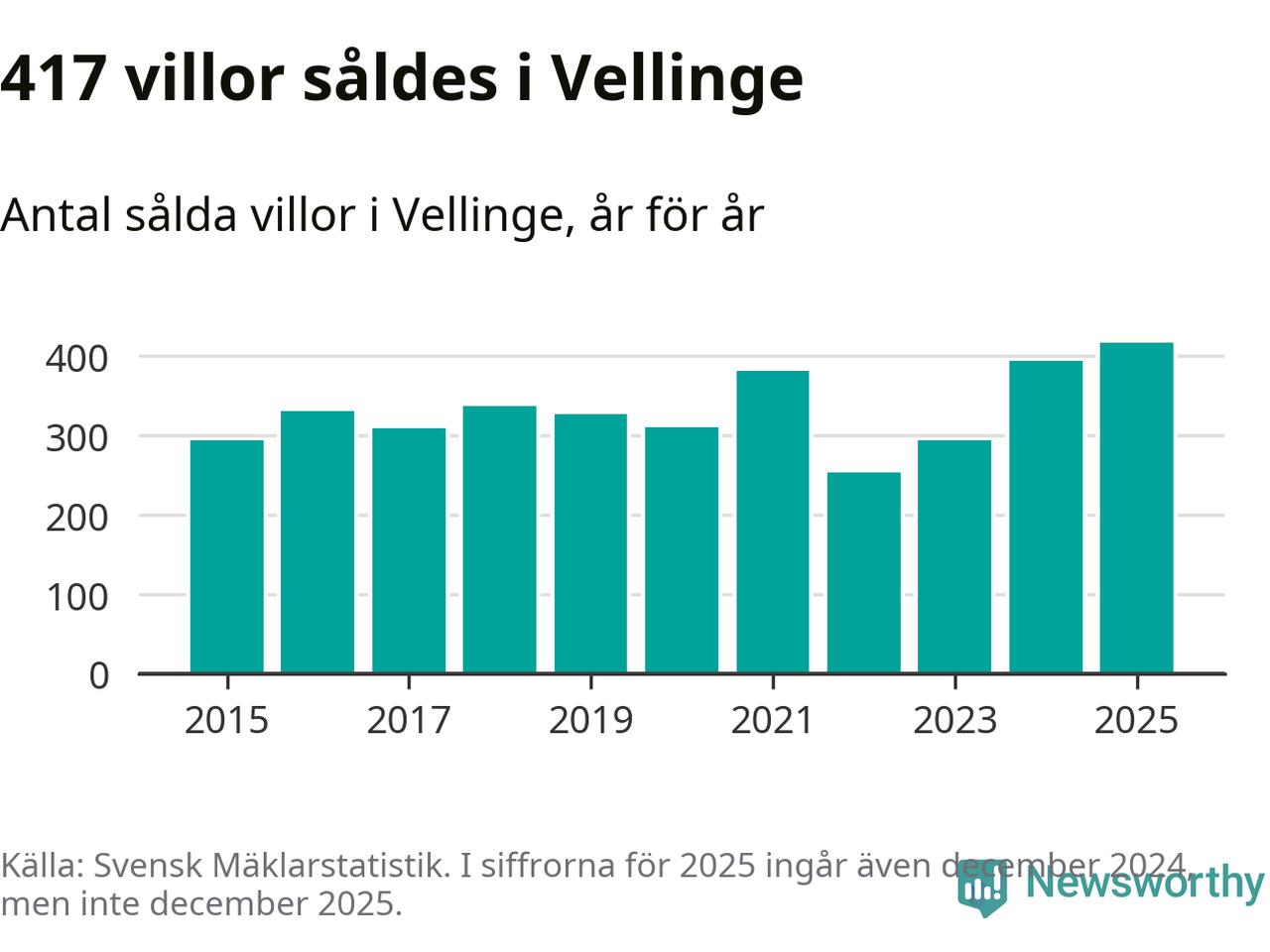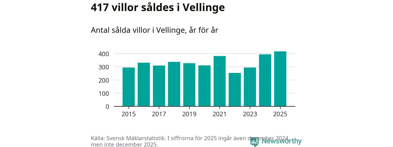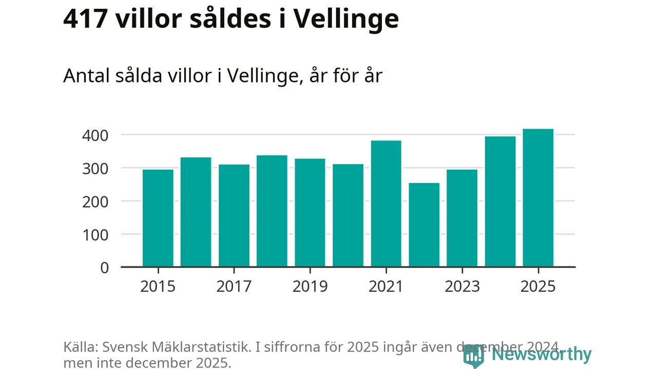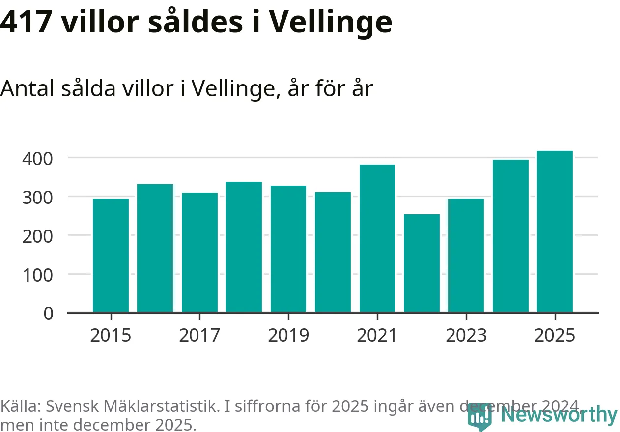 Antalet sålda villor ökade också. Totalt såldes 417 villor, att jämföra med 394 under 2024. Det är fler än något annat år sedan 2015.