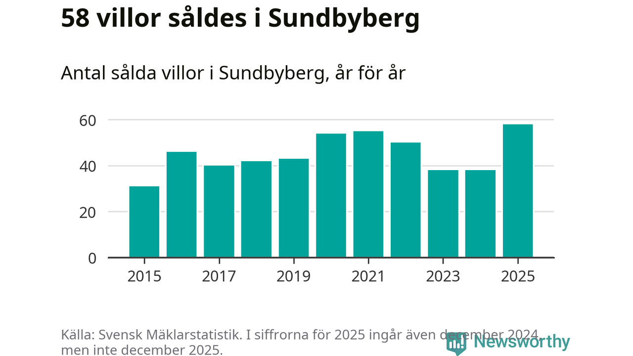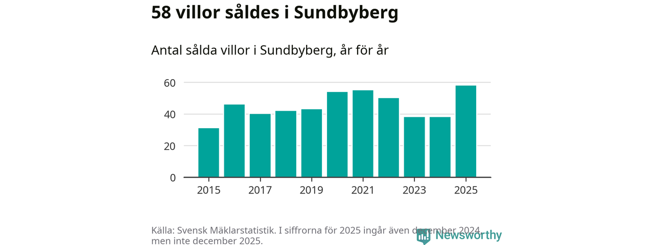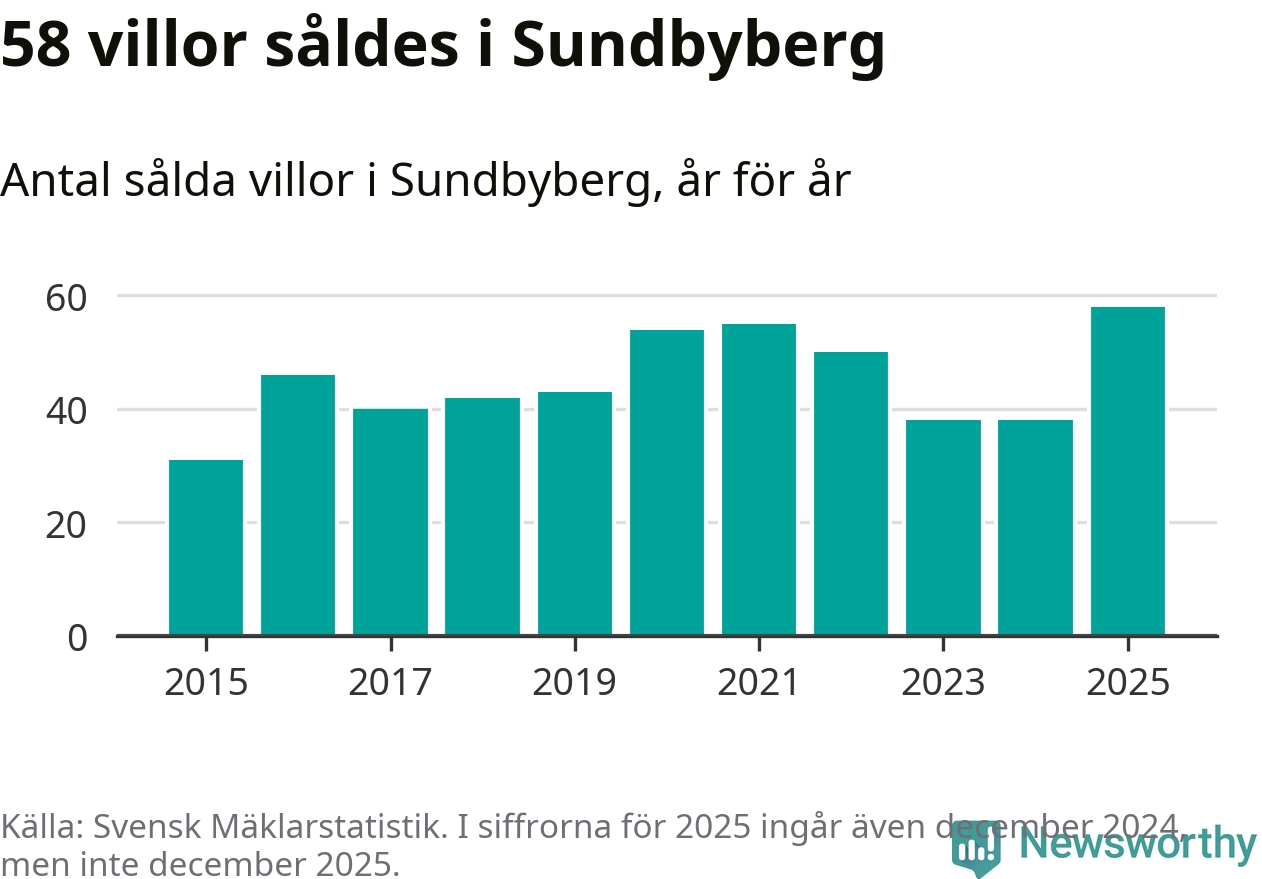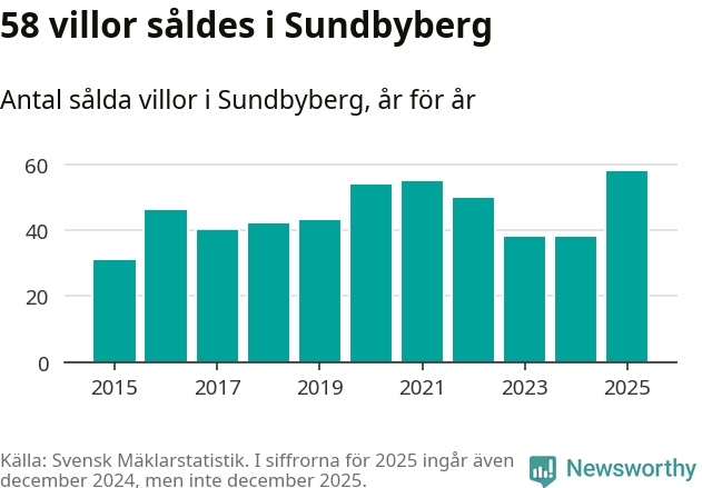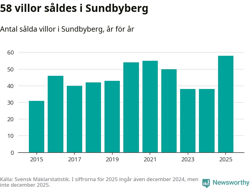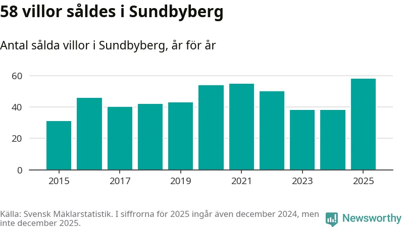 Antalet sålda villor ökade också. Totalt såldes 58 villor, att jämföra med 38 under 2024. Det är fler än något annat år sedan 2015.