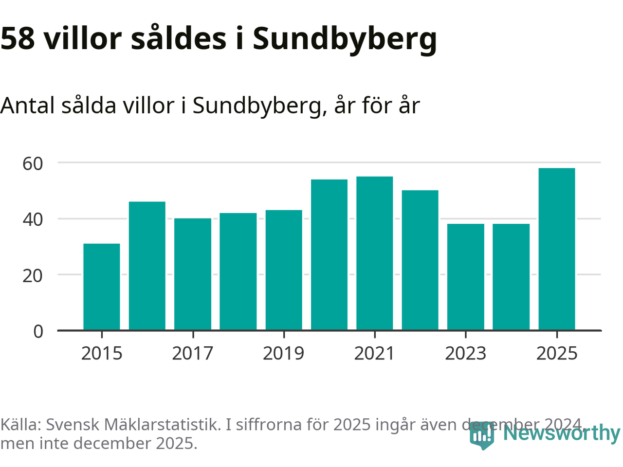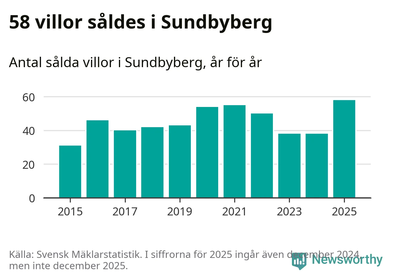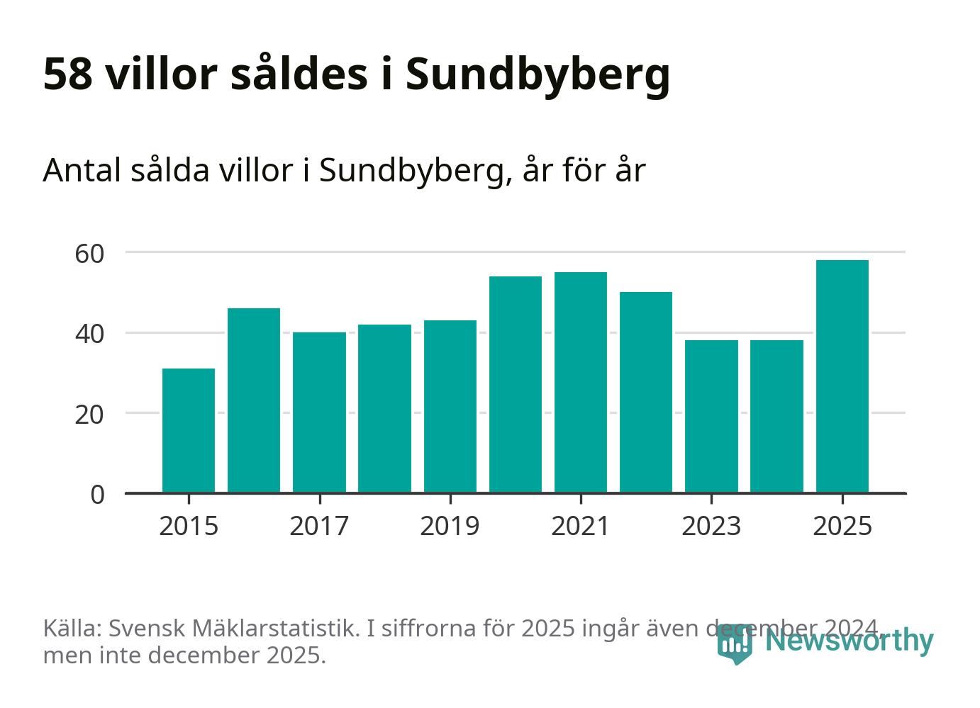 Antalet sålda villor ökade också. Totalt såldes 58 villor, att jämföra med 38 under 2024. Det är fler än något annat år sedan 2015.