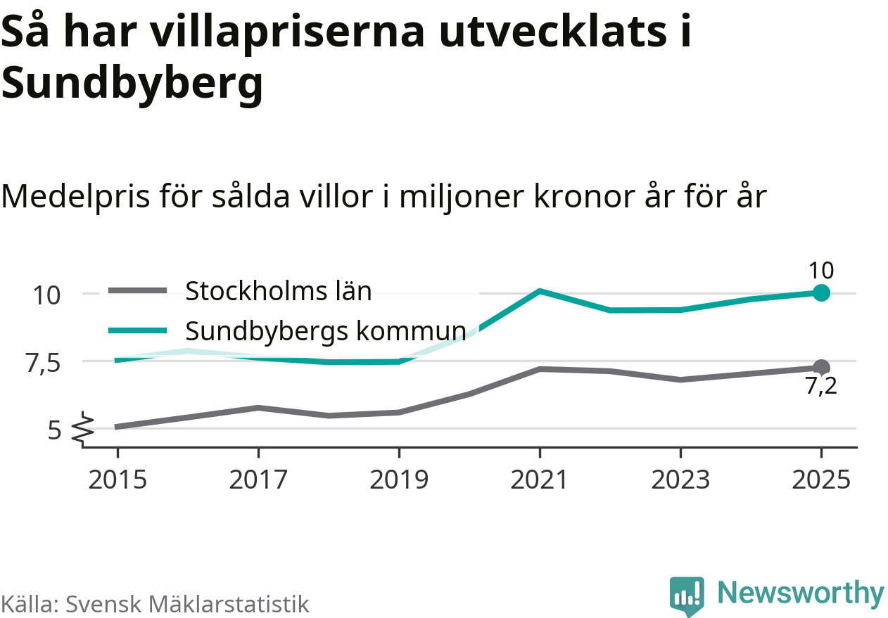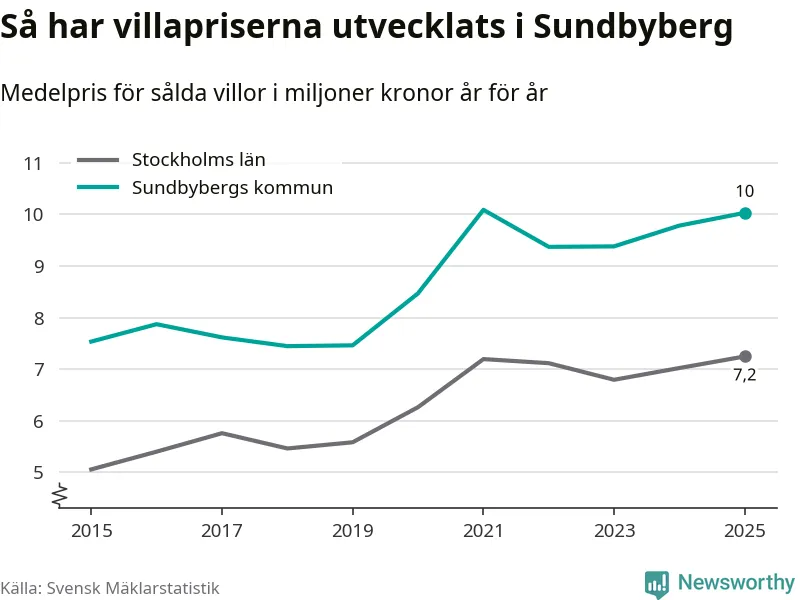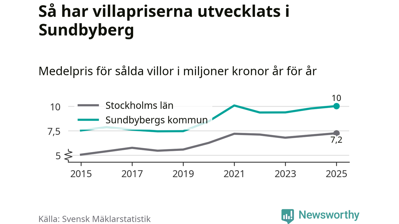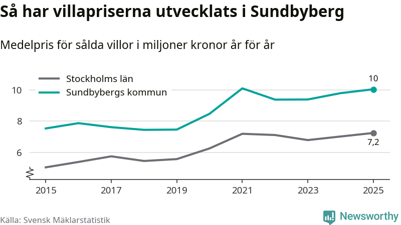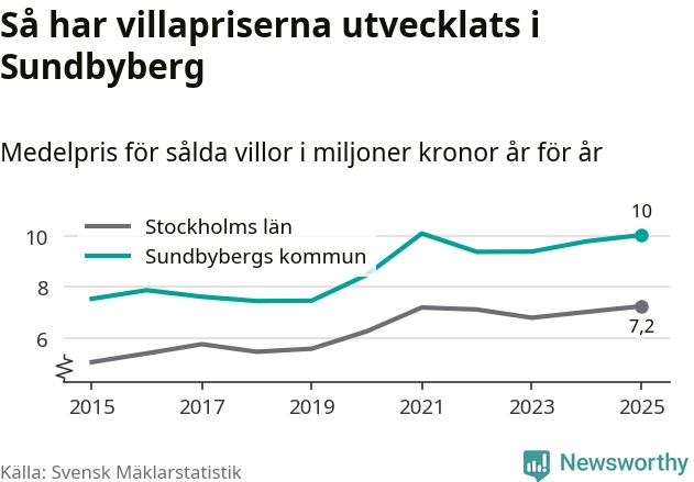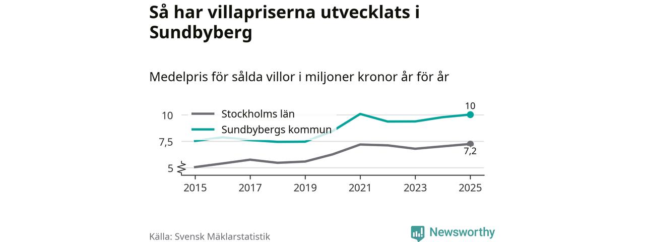 Tio miljoner kronor är medelpriset för de villor som såldes i Sundbybergs kommun under året, eller 70 321 kronor per kvadratmeter. Det innebär en prisökning med tre procent på ett år och är tredje året i rad som priserna ökar i kommunen.