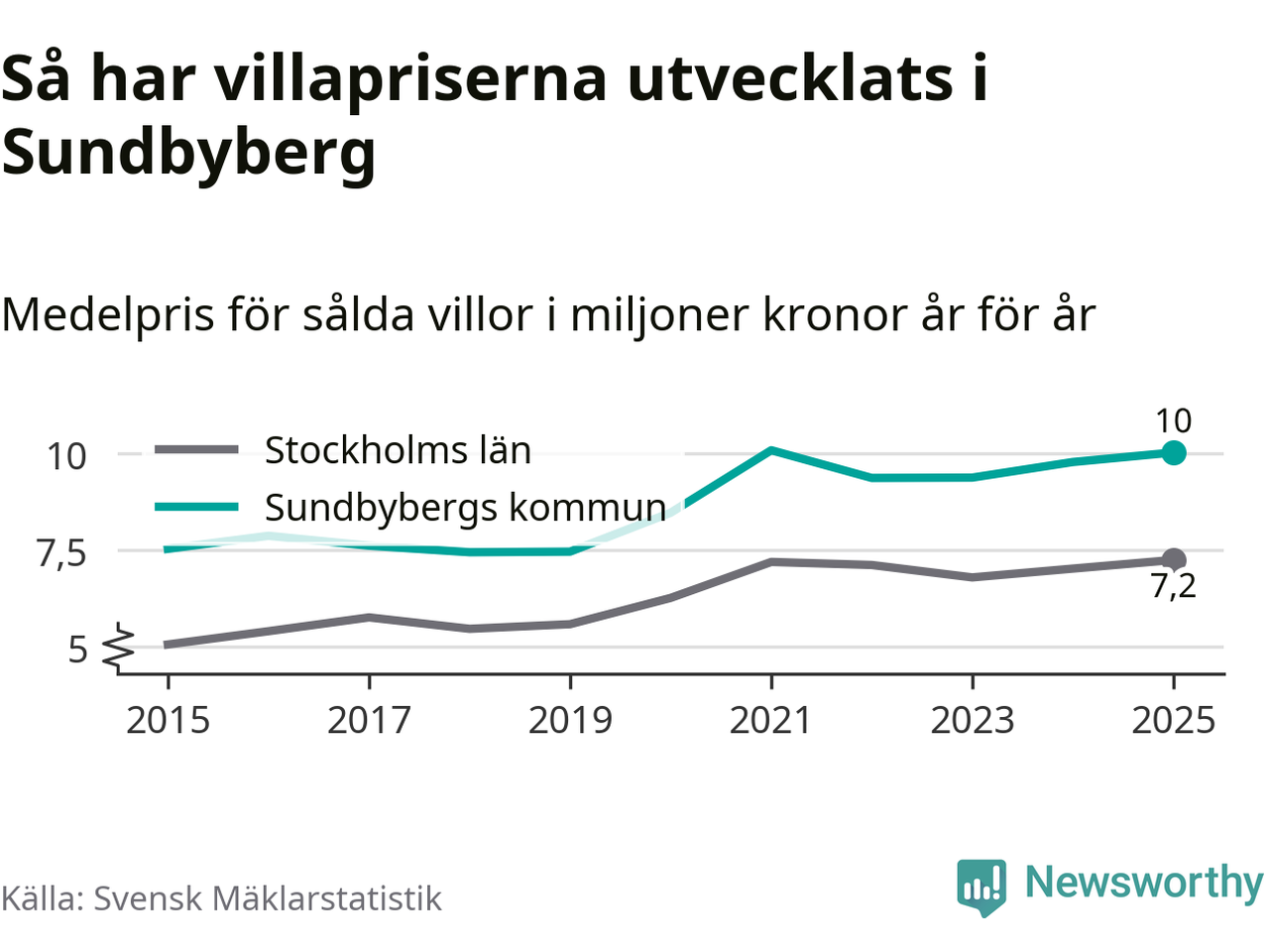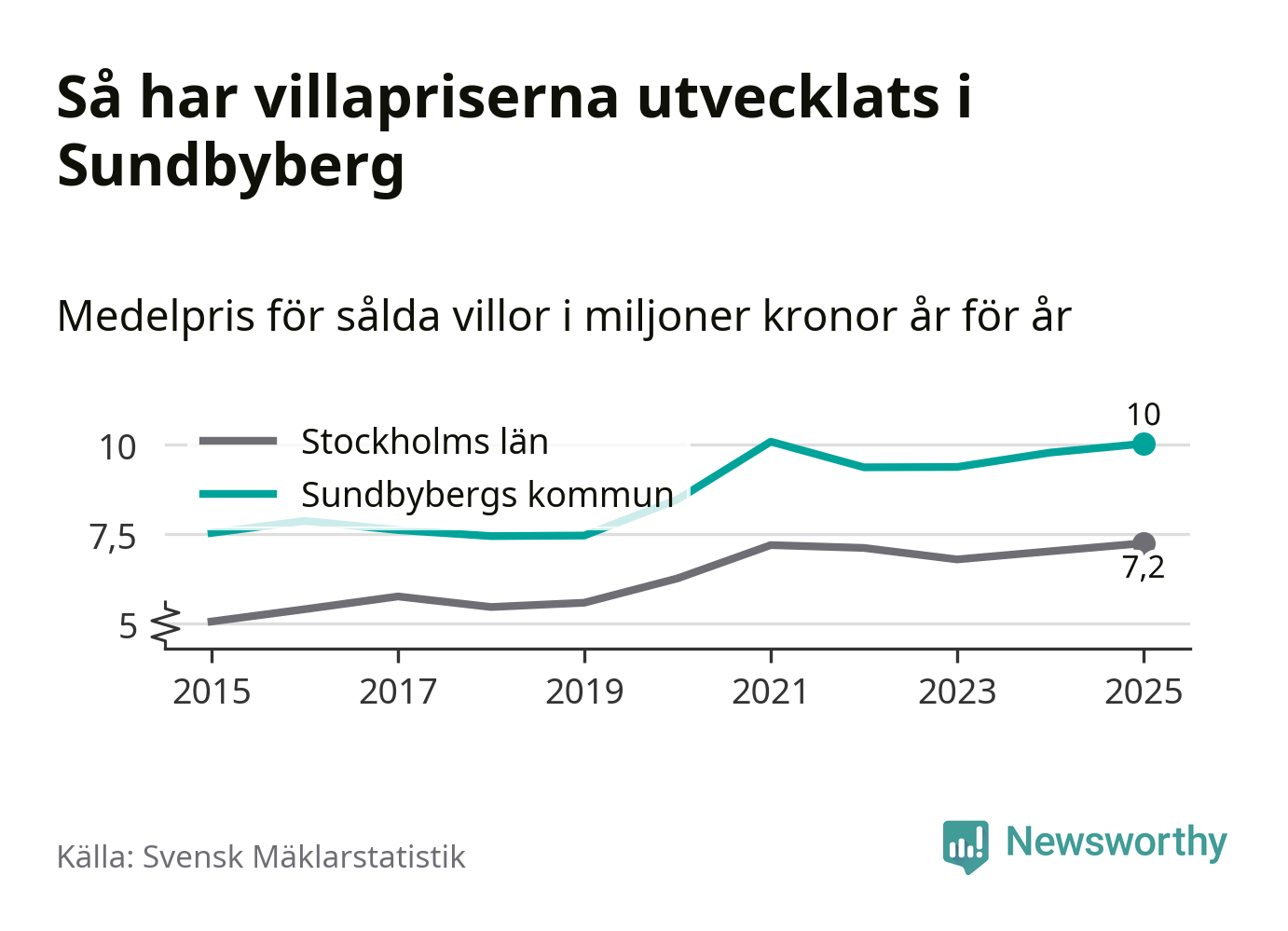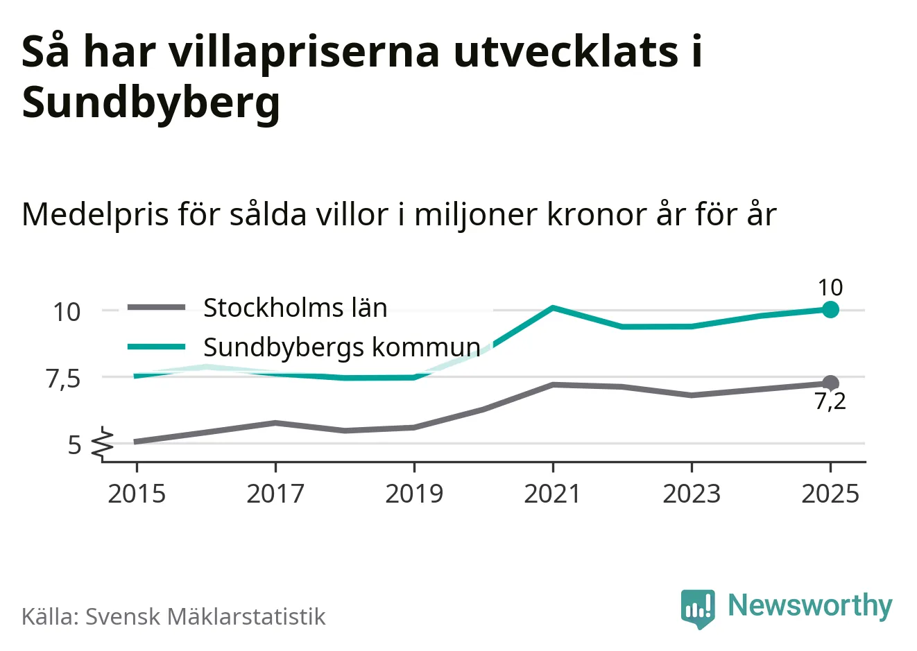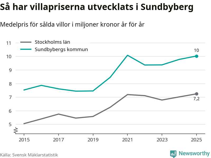 Tio miljoner kronor är medelpriset för de villor som såldes i Sundbybergs kommun under året, eller 70 321 kronor per kvadratmeter. Det innebär en prisökning med tre procent på ett år och är tredje året i rad som priserna ökar i kommunen.