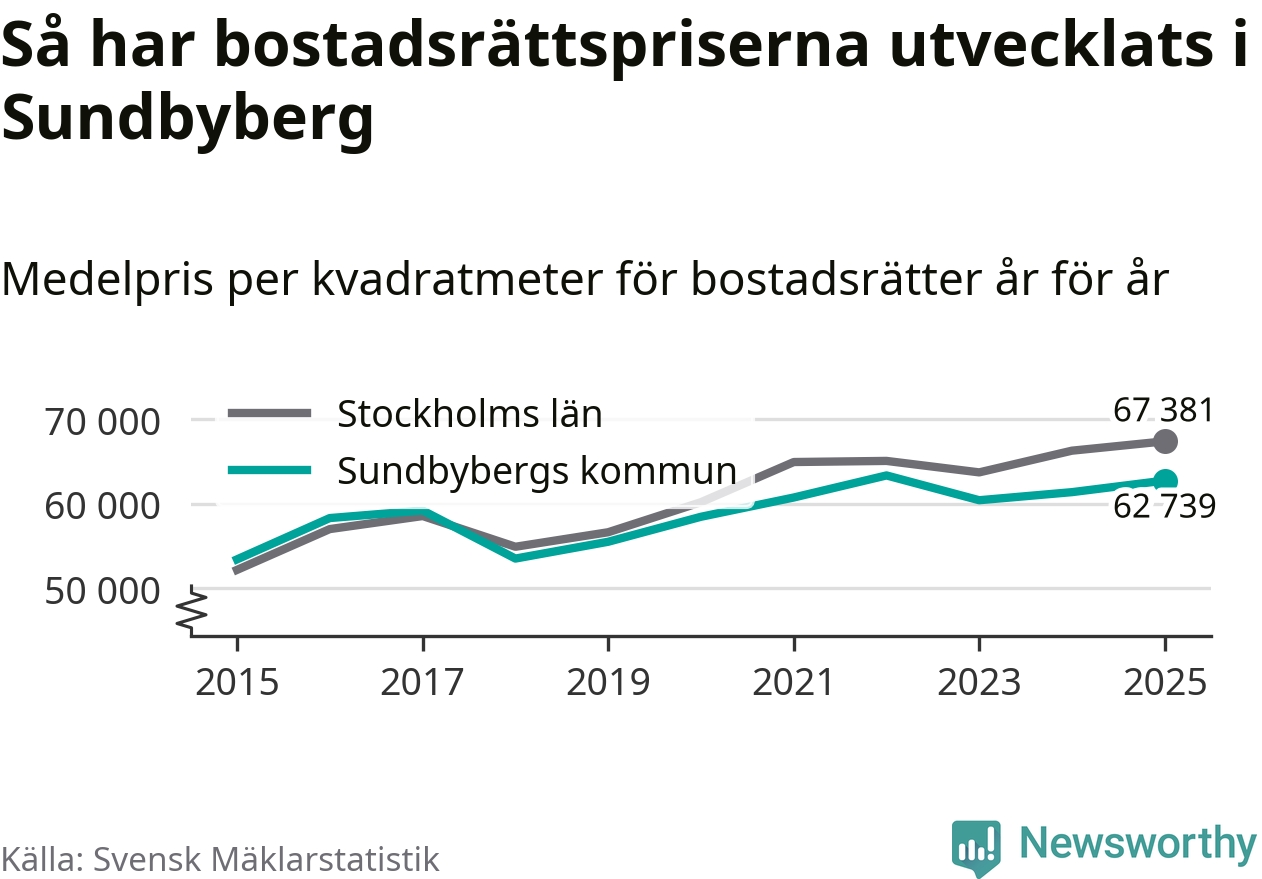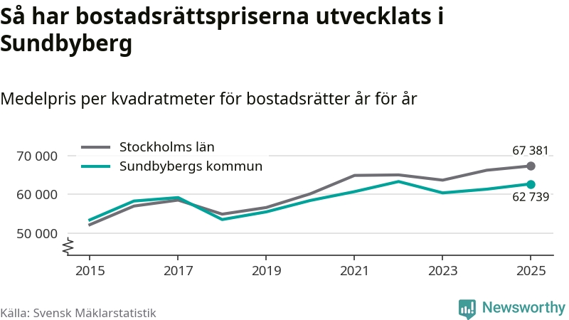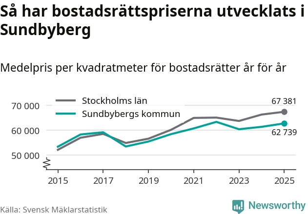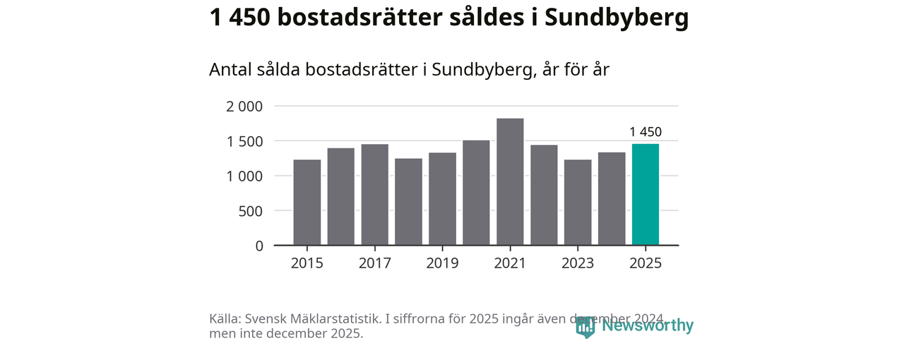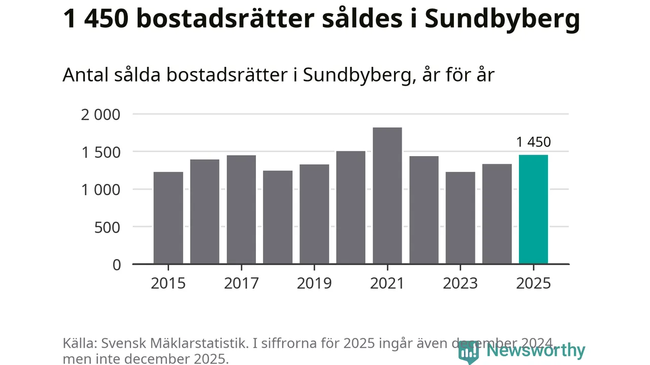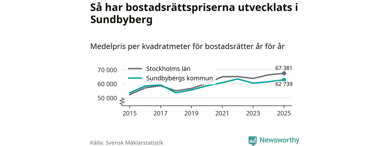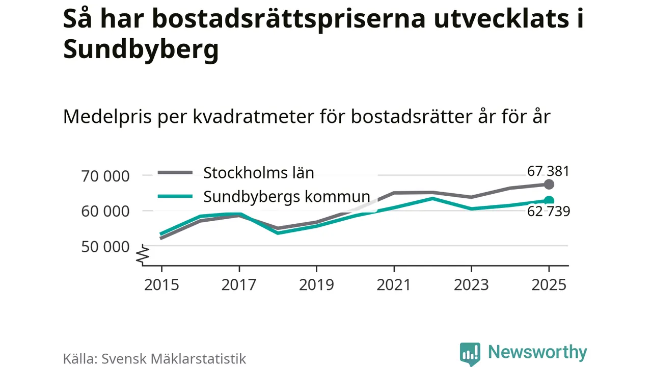 Det såldes totalt 1 450 bostadsrätter i Sundbybergs kommun under året. Genomsnittspriset per kvadratmeter landade på 62 739 kronor. Det är en ökning med två procent i kommunen på ett år.