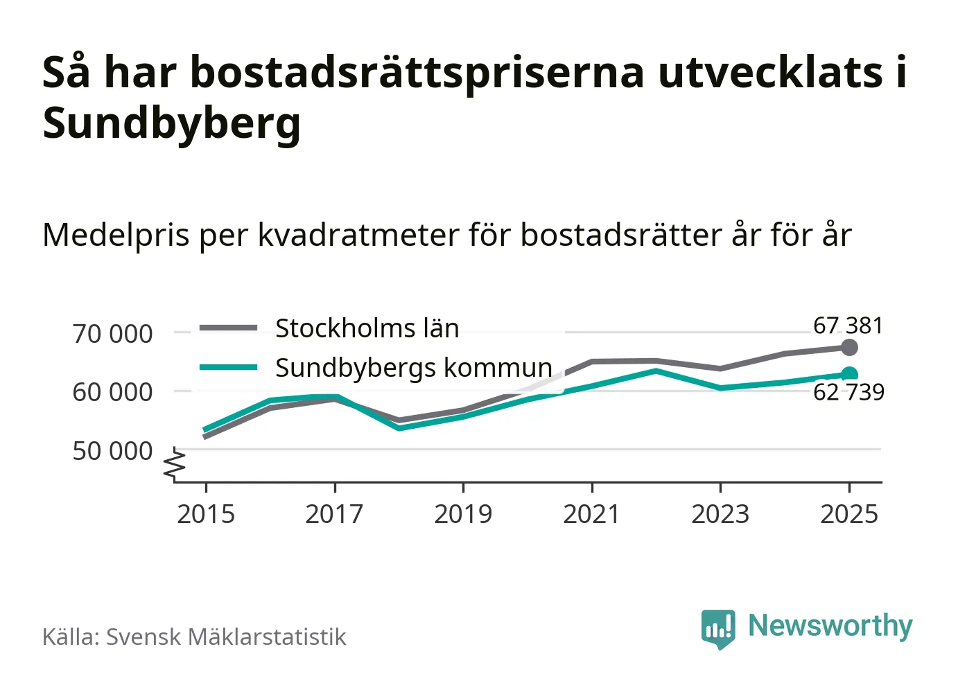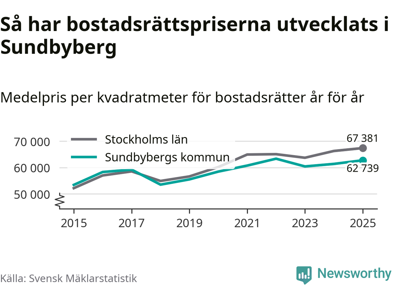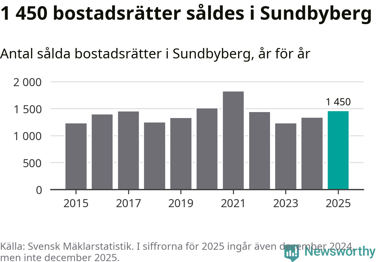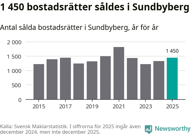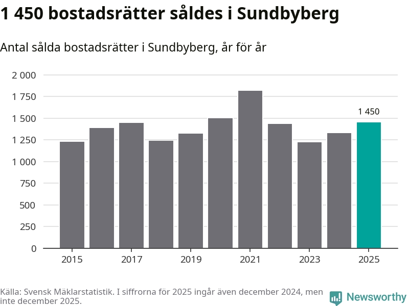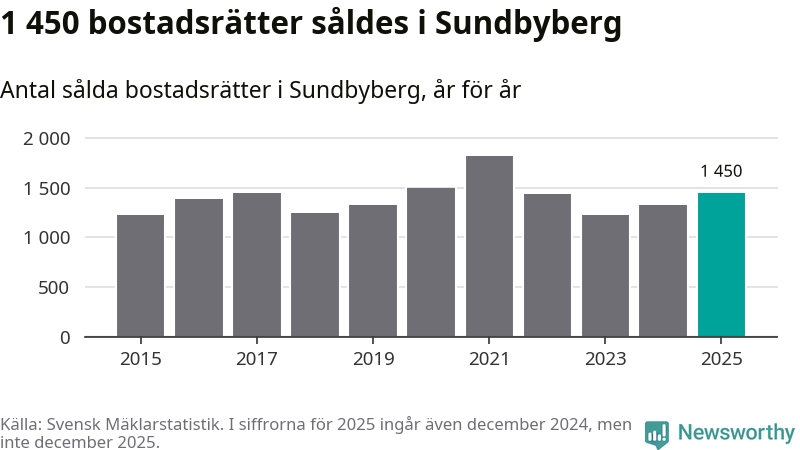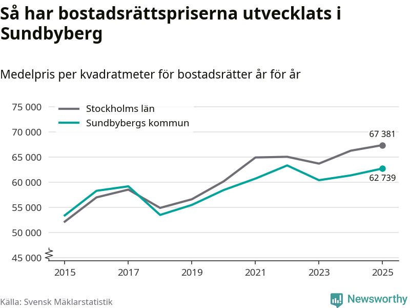 Det såldes totalt 1 450 bostadsrätter i Sundbybergs kommun under året. Genomsnittspriset per kvadratmeter landade på 62 739 kronor. Det är en ökning med två procent i kommunen på ett år.