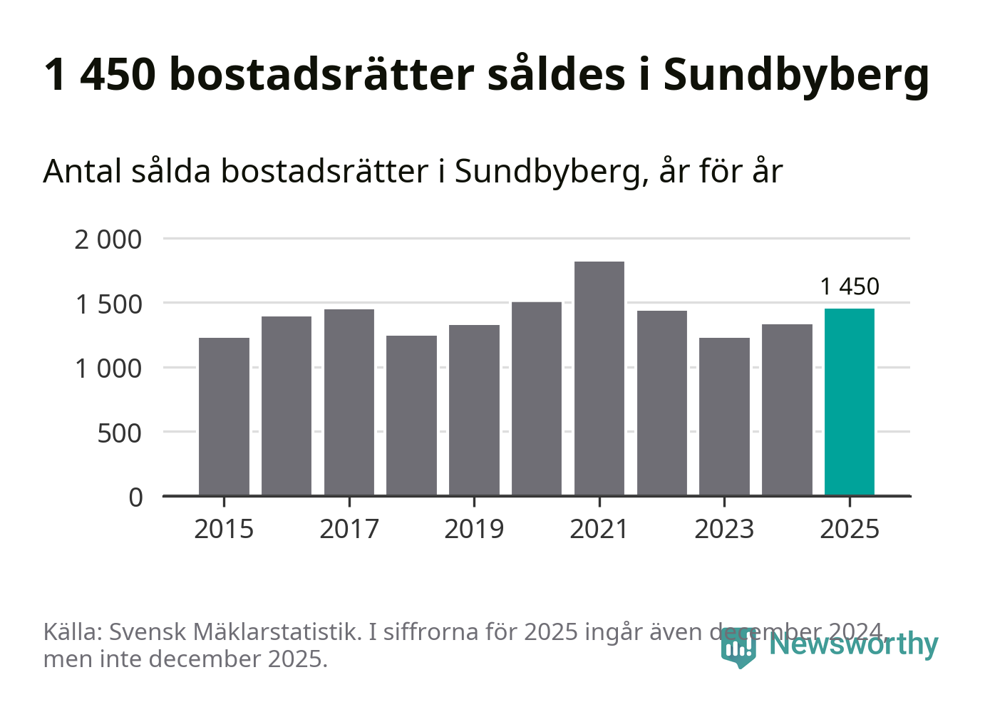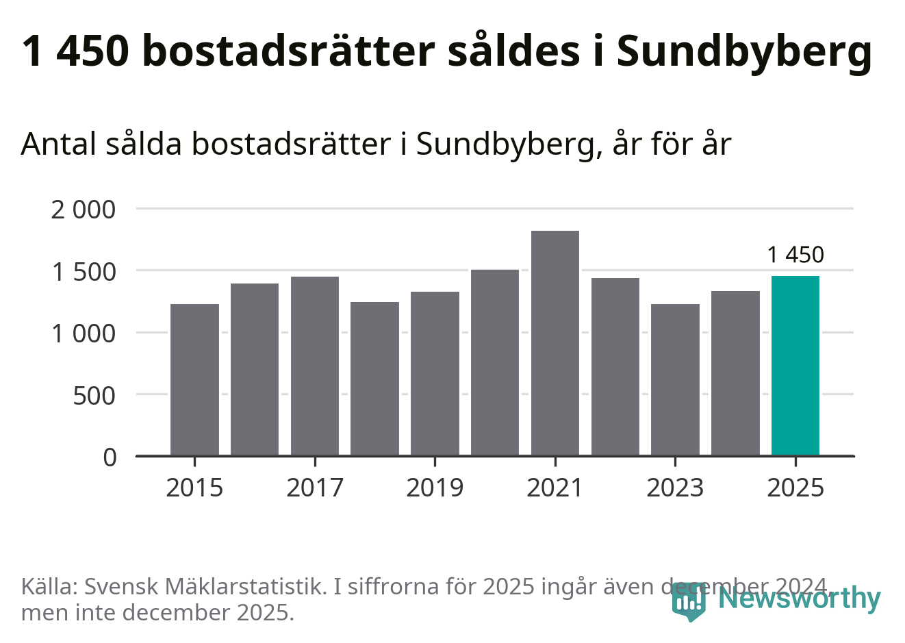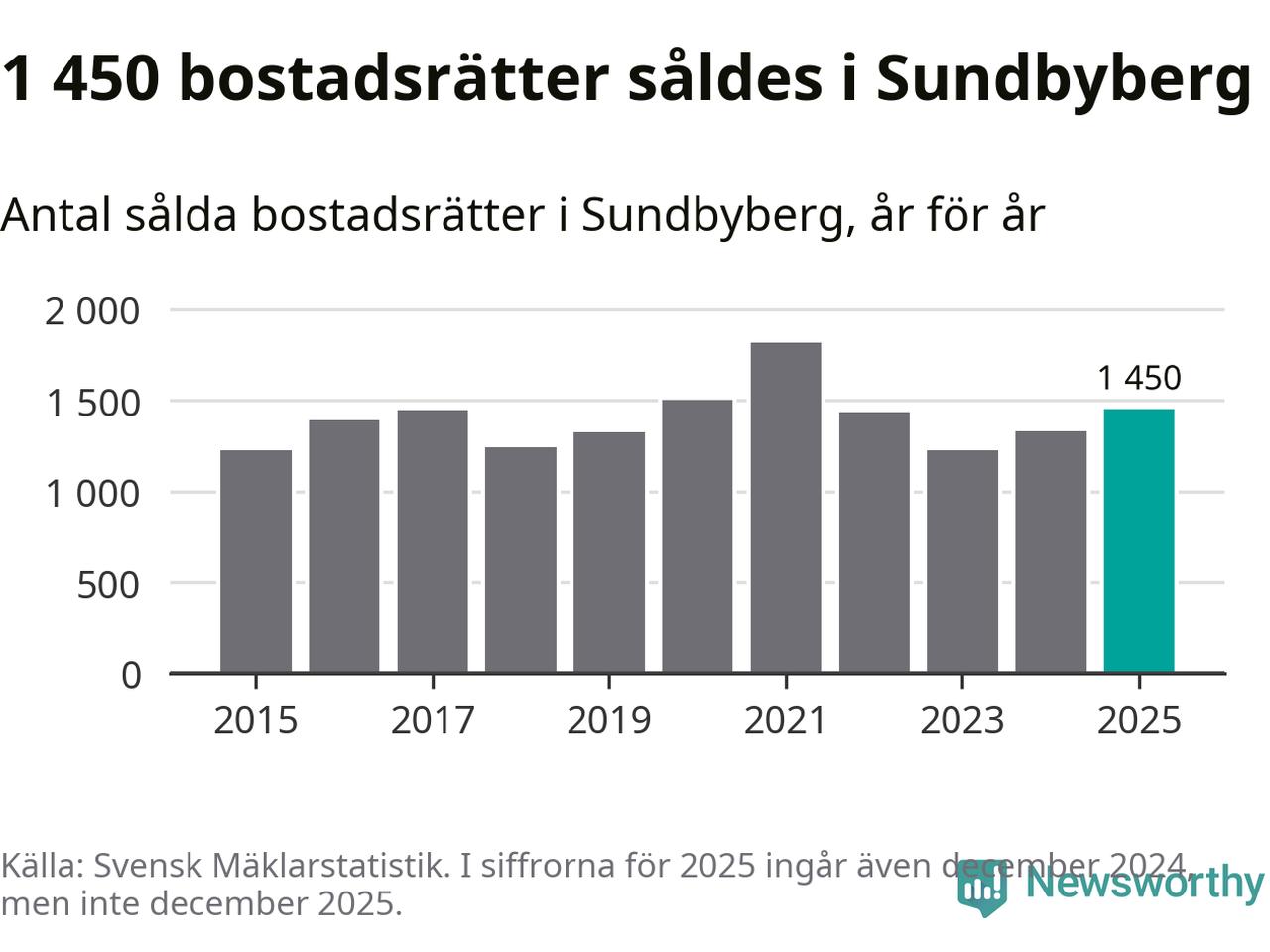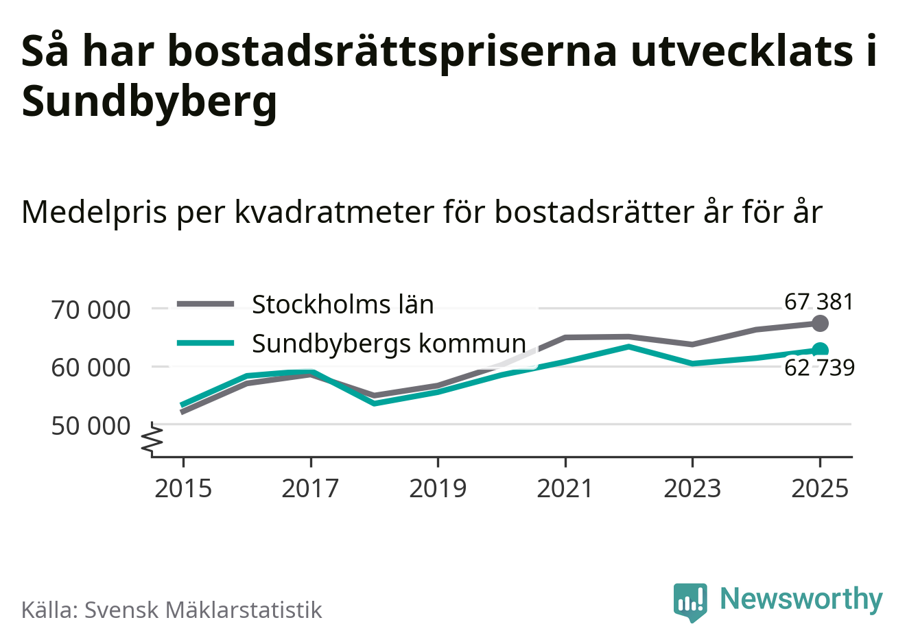 Det såldes totalt 1 450 bostadsrätter i Sundbybergs kommun under året. Genomsnittspriset per kvadratmeter landade på 62 739 kronor. Det är en ökning med två procent i kommunen på ett år.