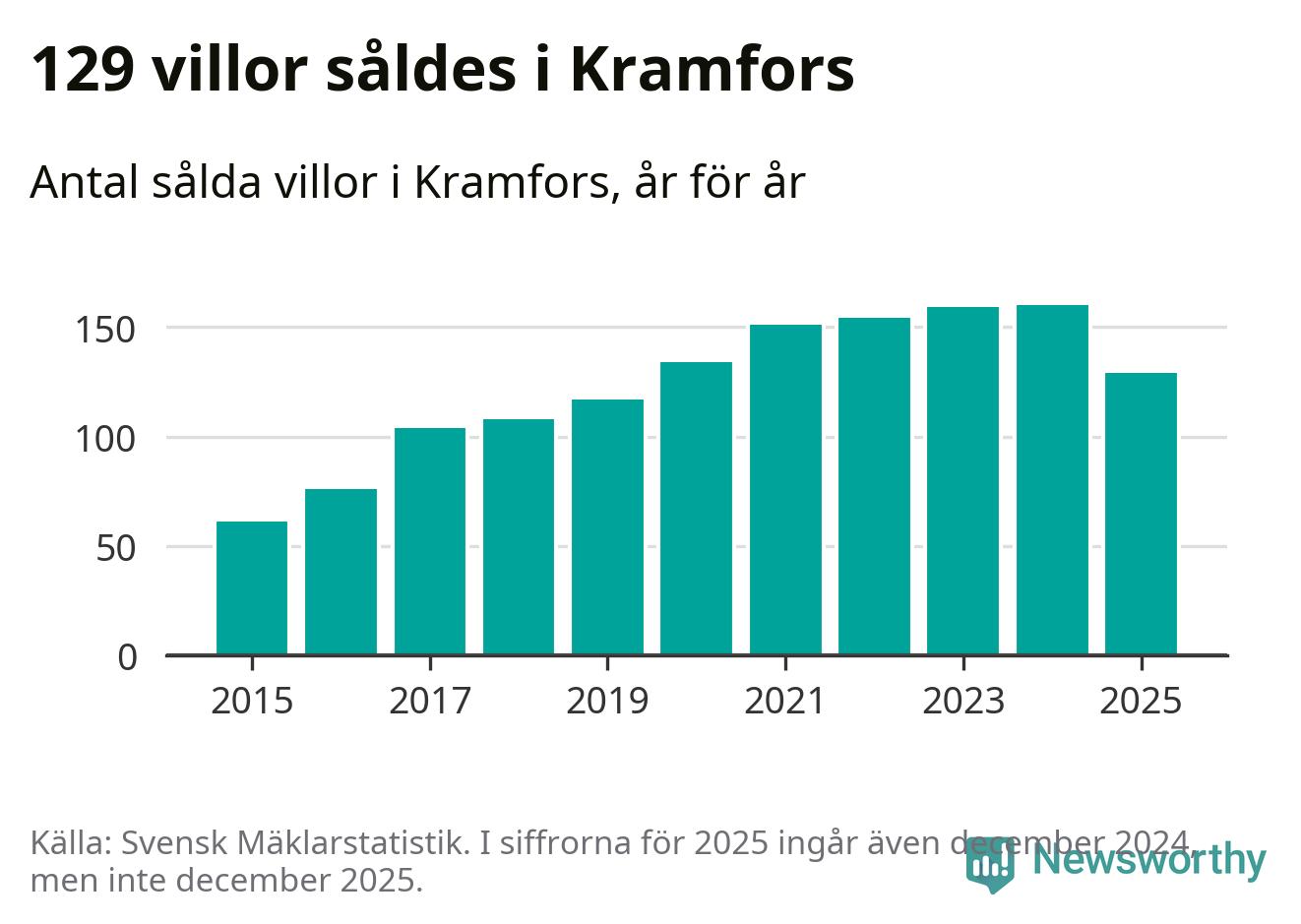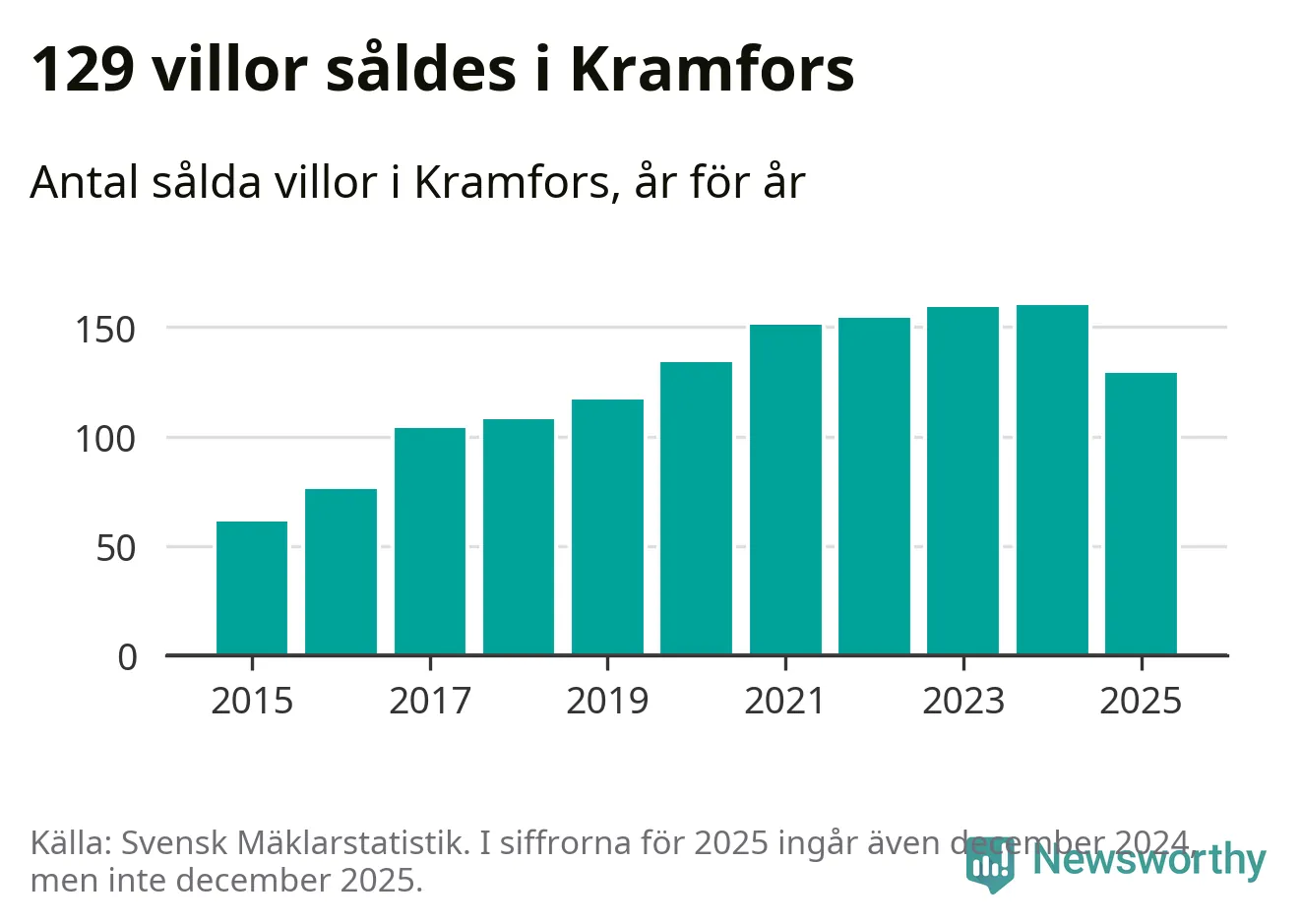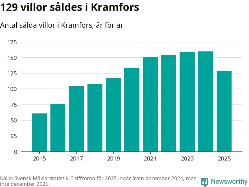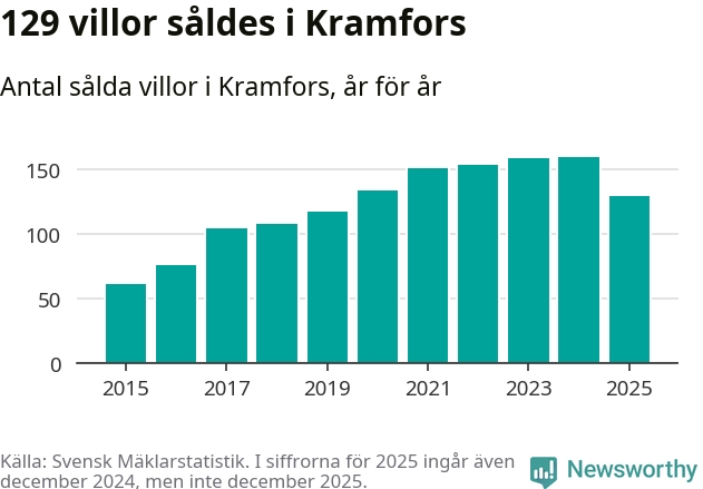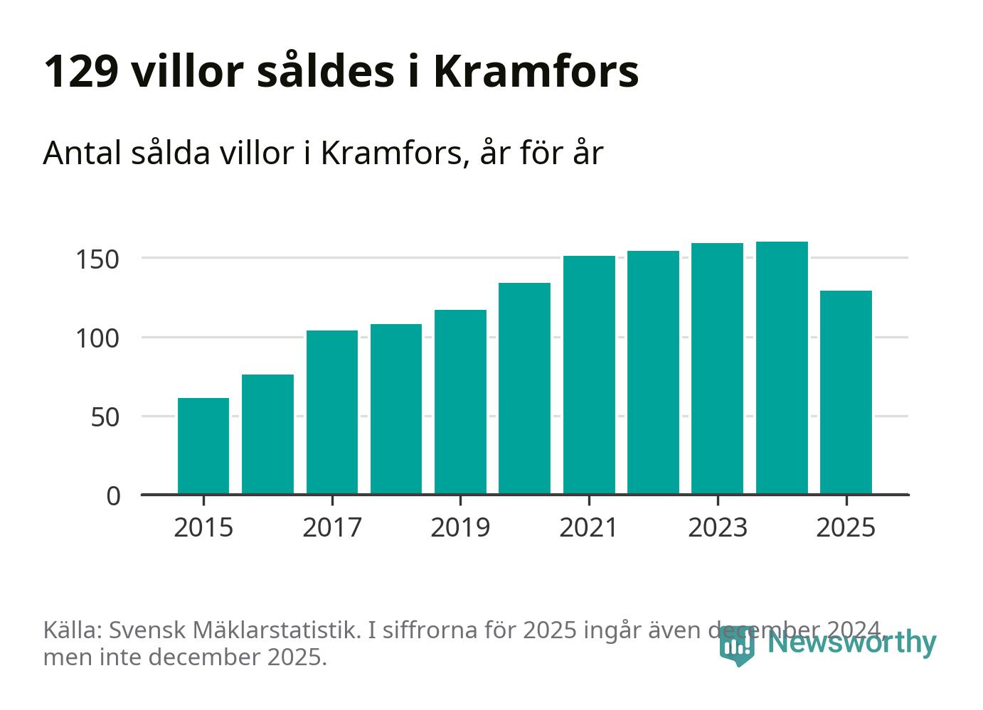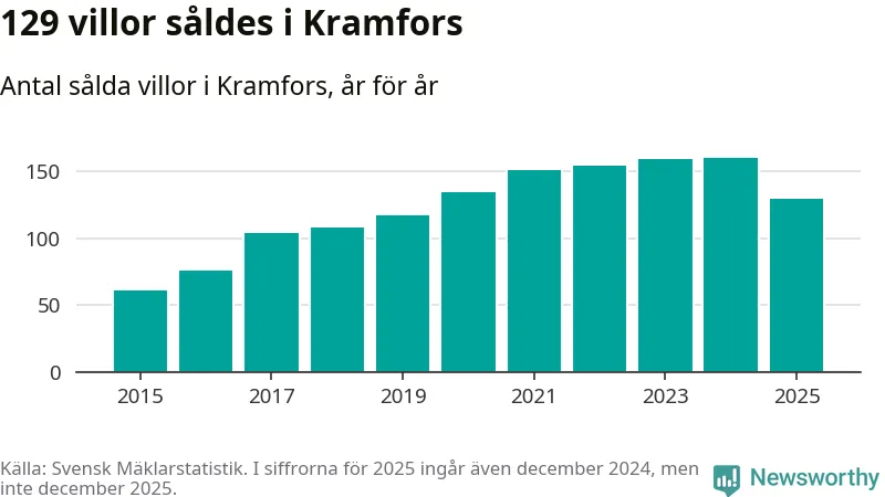 Antalet sålda villor minskade också. Totalt såldes 129 villor, att jämföra med 160 under 2024.