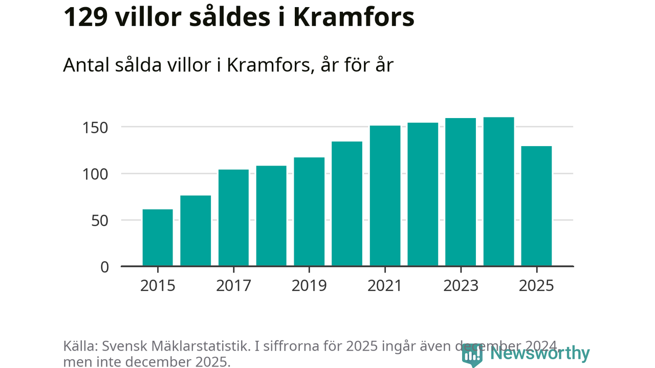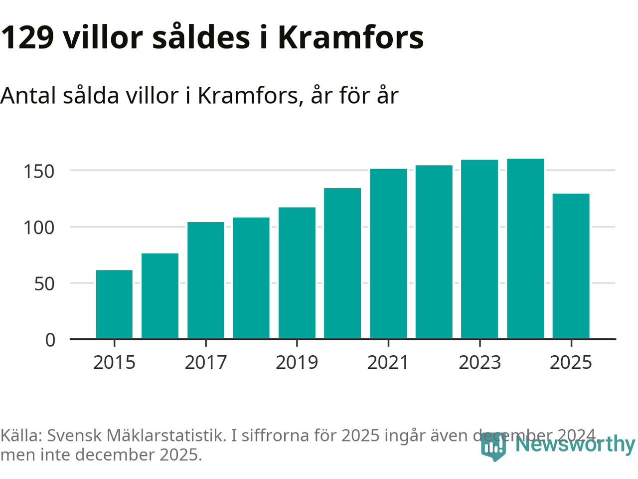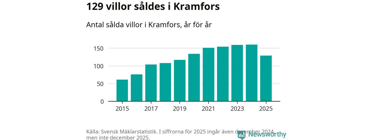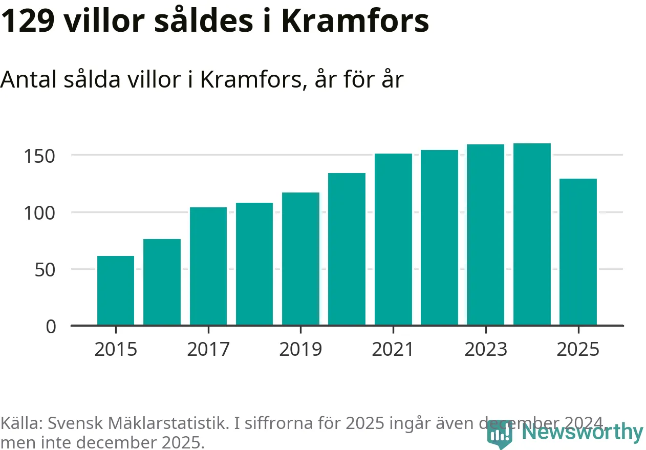 Antalet sålda villor minskade också. Totalt såldes 129 villor, att jämföra med 160 under 2024.