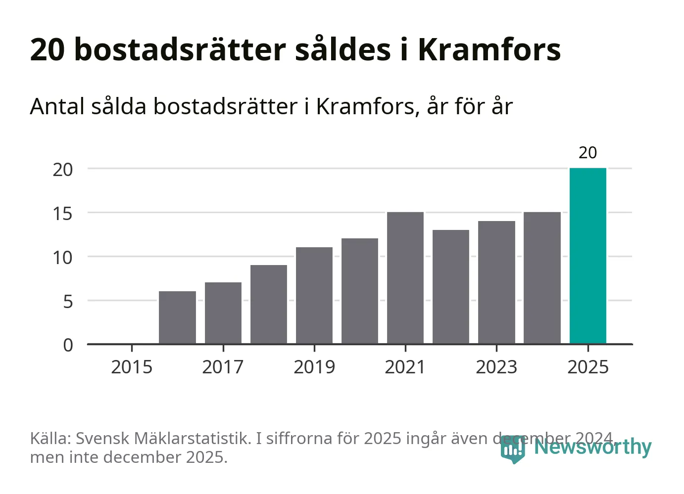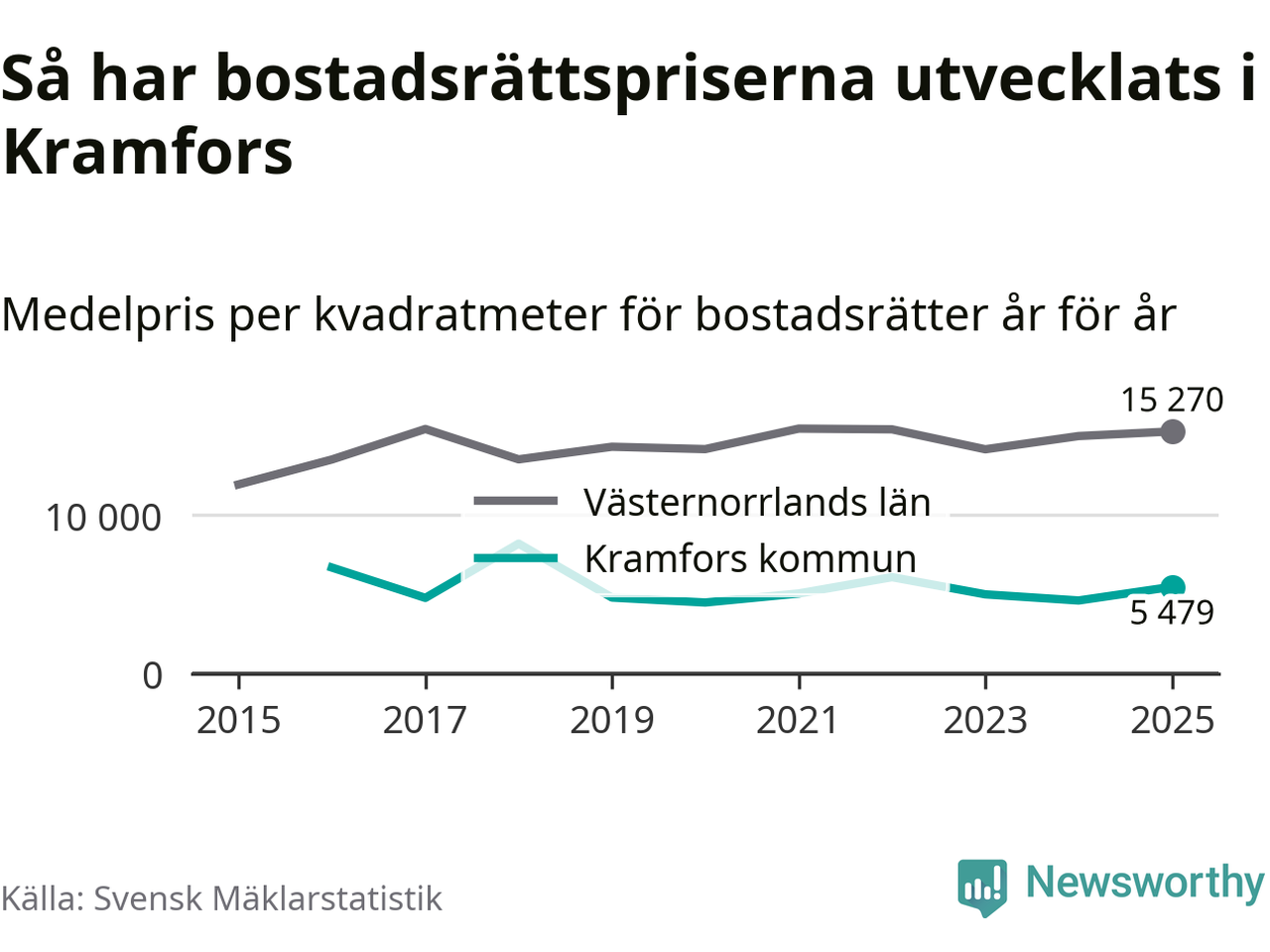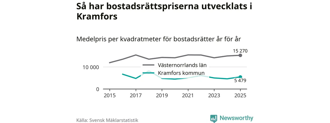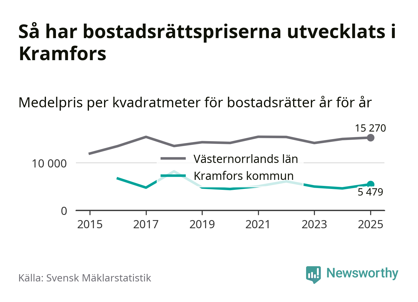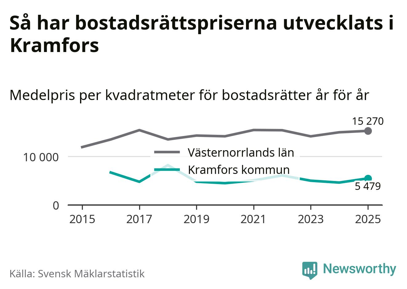 När det gäller bostadsrätter i Kramfors kommun såldes 20 under året. Snittet per kvadratmeter landade på omkring 5 500 kronor. Det är en ökning jämfört med förra året.
