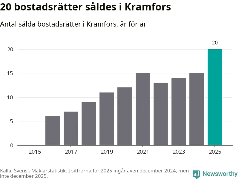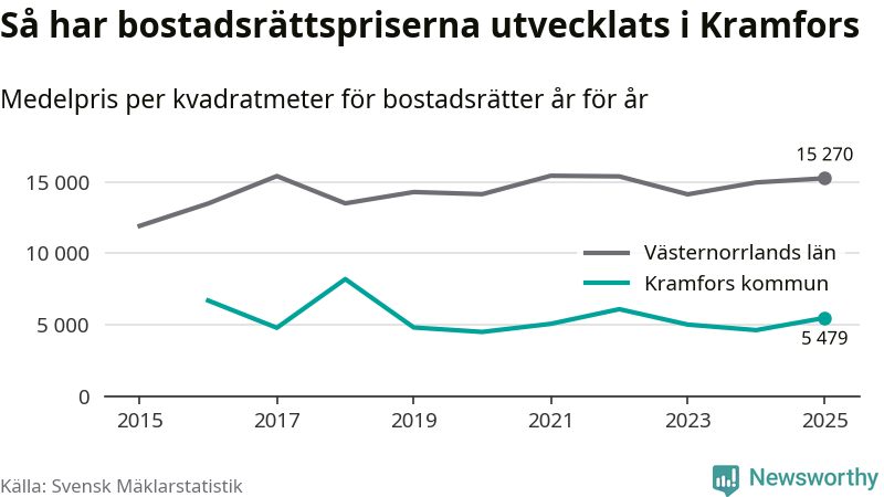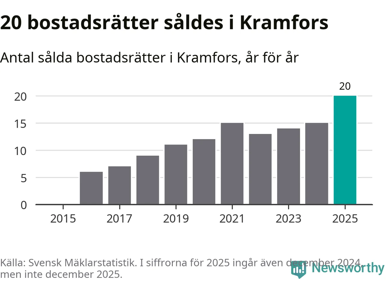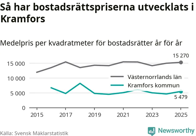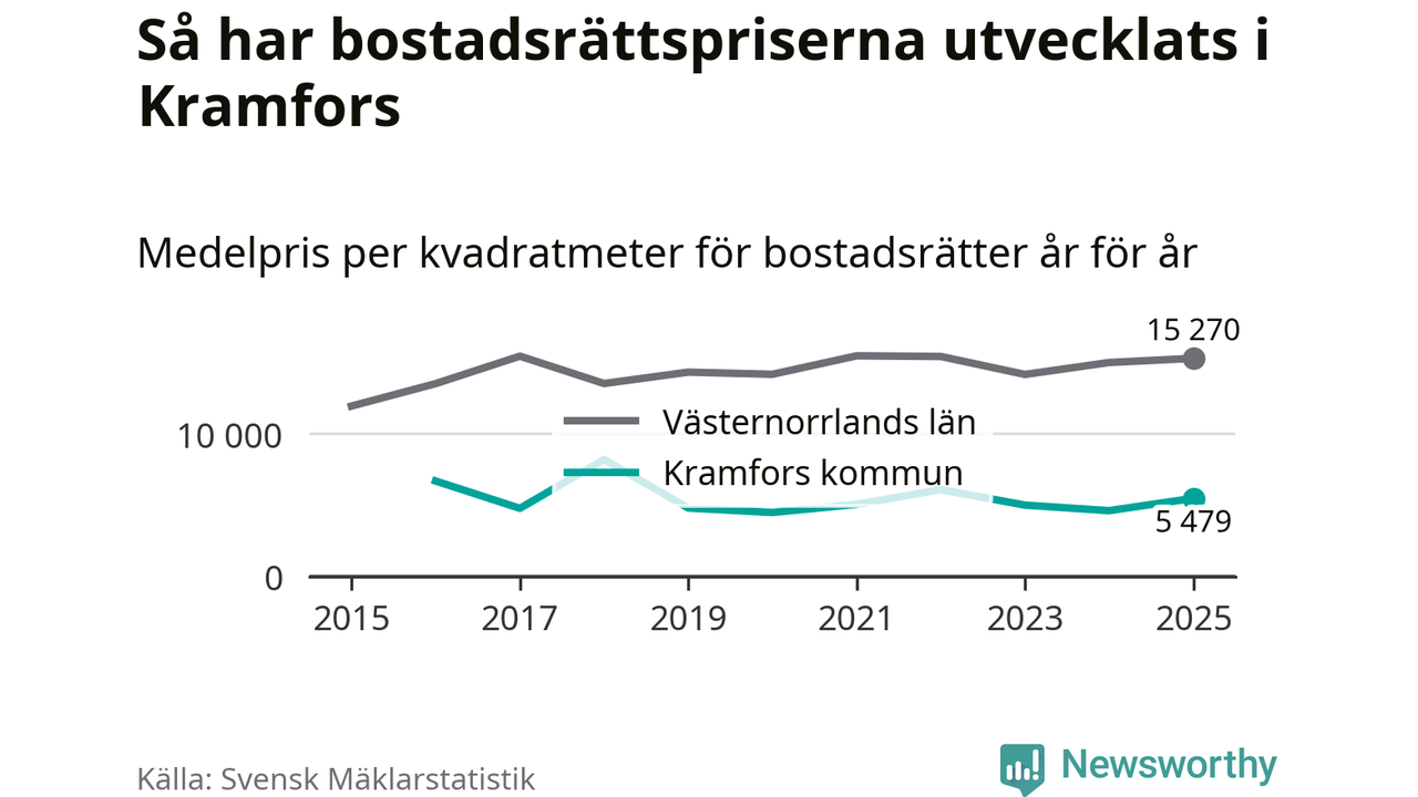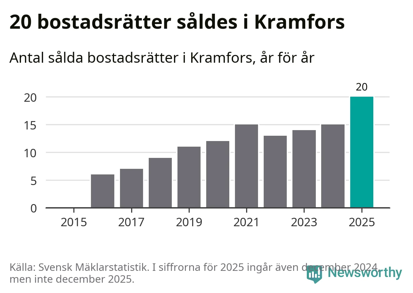 När det gäller bostadsrätter i Kramfors kommun såldes 20 under året. Snittet per kvadratmeter landade på omkring 5 500 kronor. Det är en ökning jämfört med förra året.