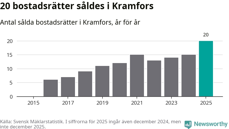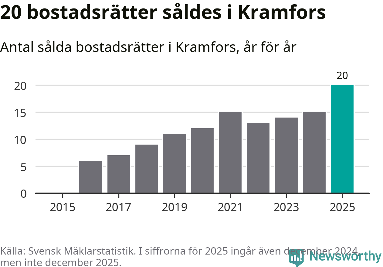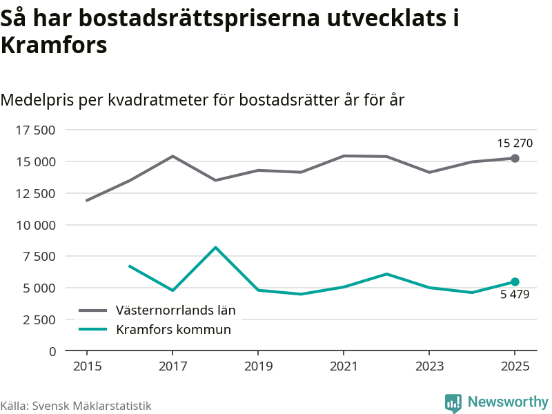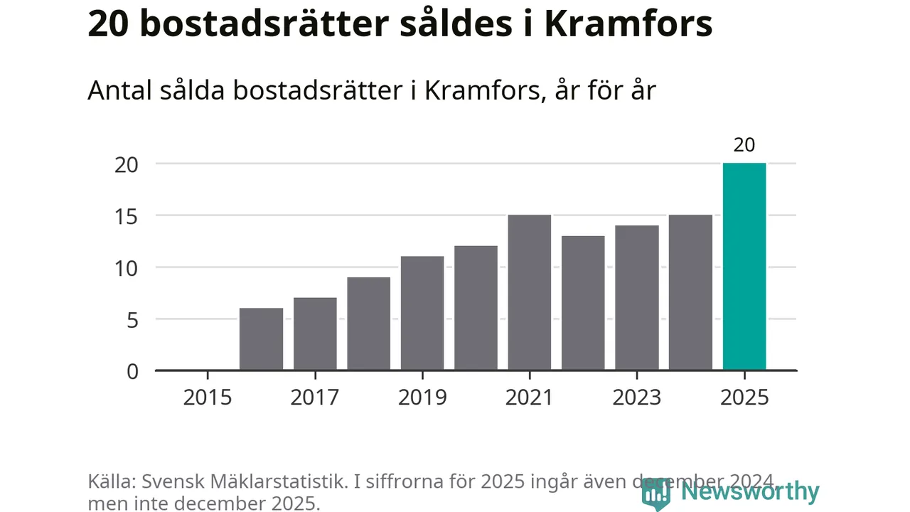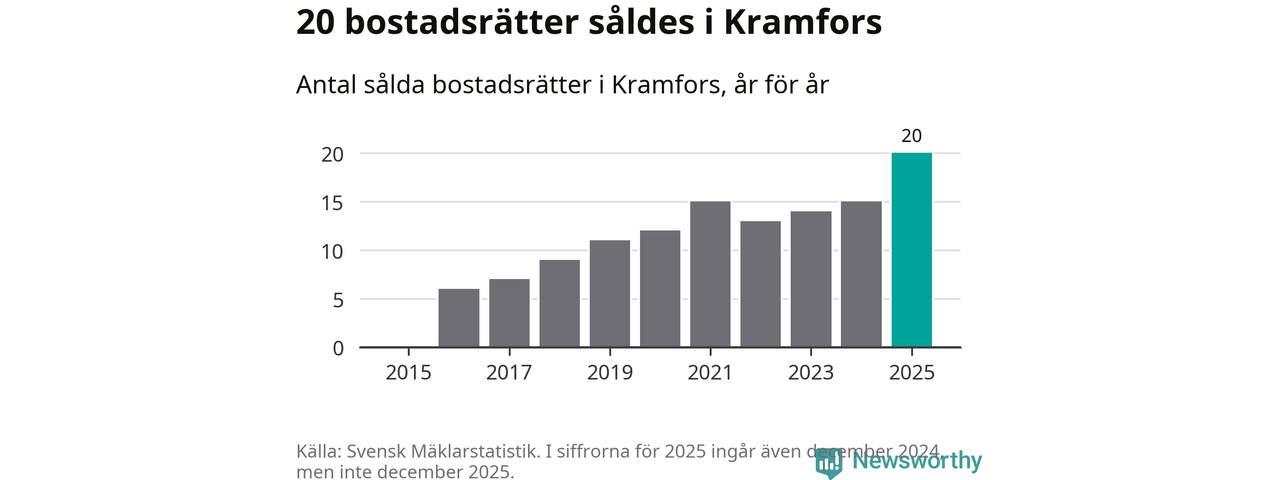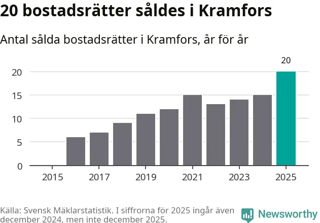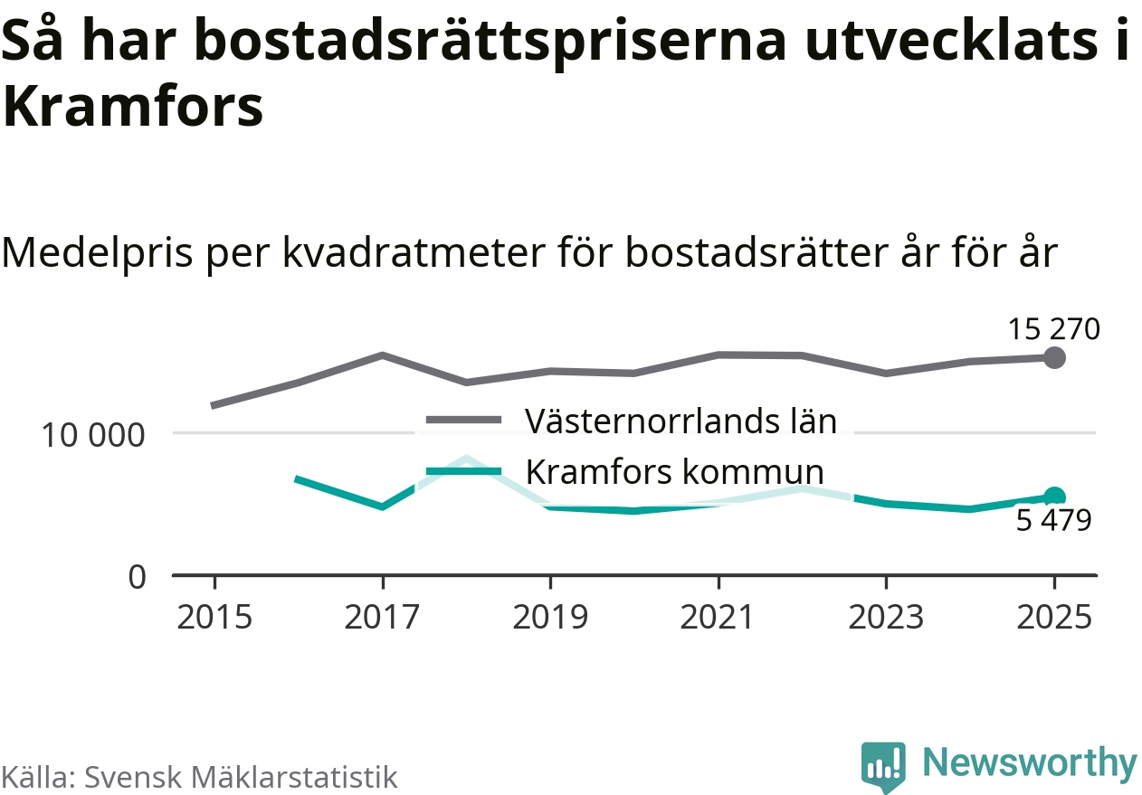När det gäller bostadsrätter i Kramfors kommun såldes 20 under året. Snittet per kvadratmeter landade på omkring 5 500 kronor. Det är en ökning jämfört med förra året.