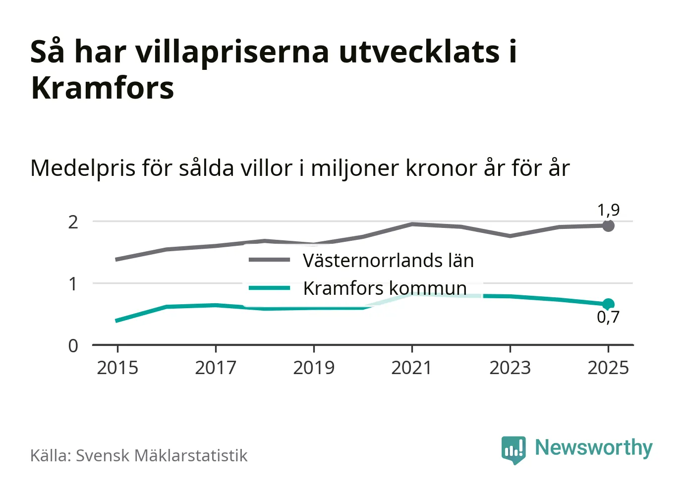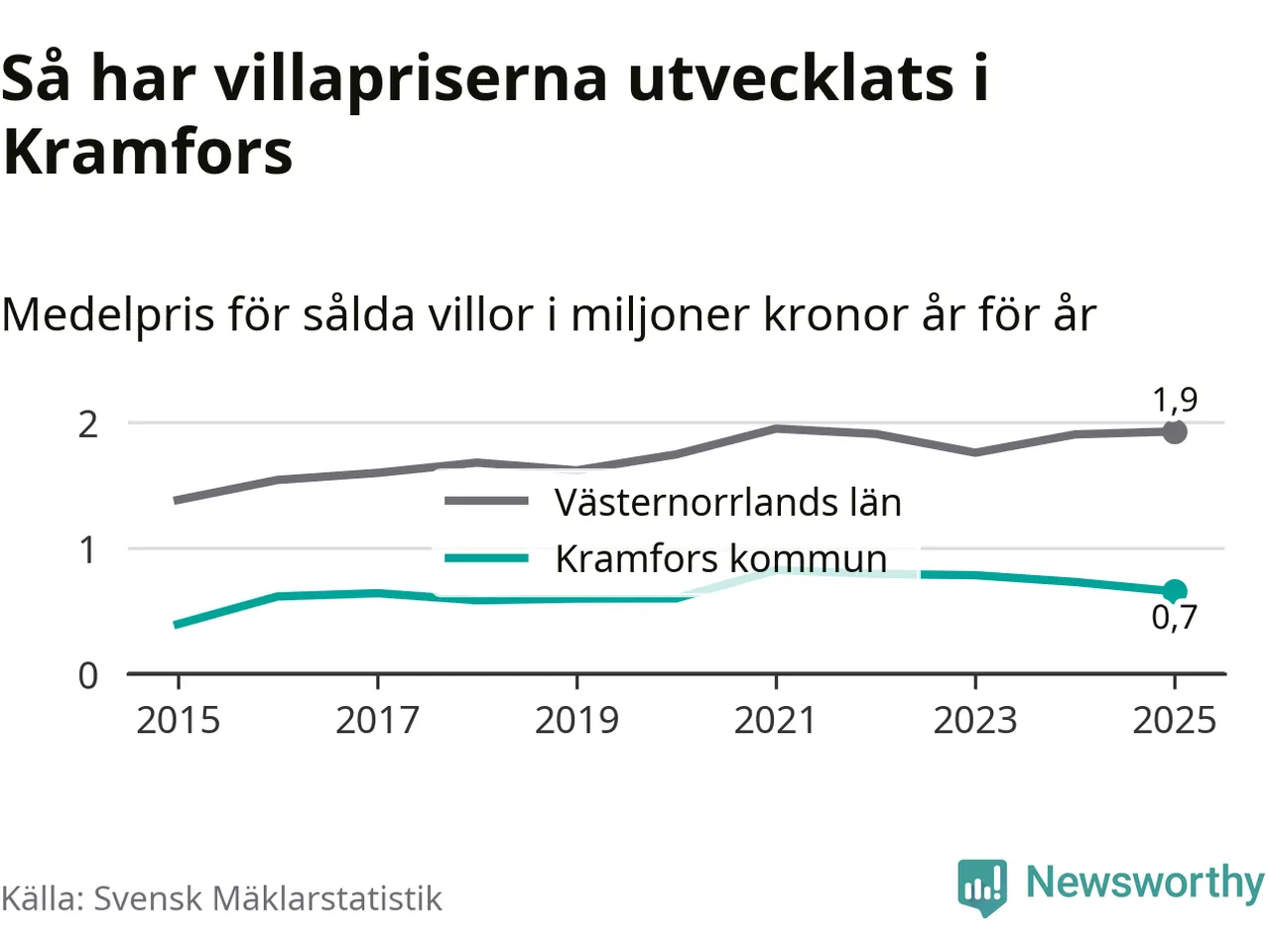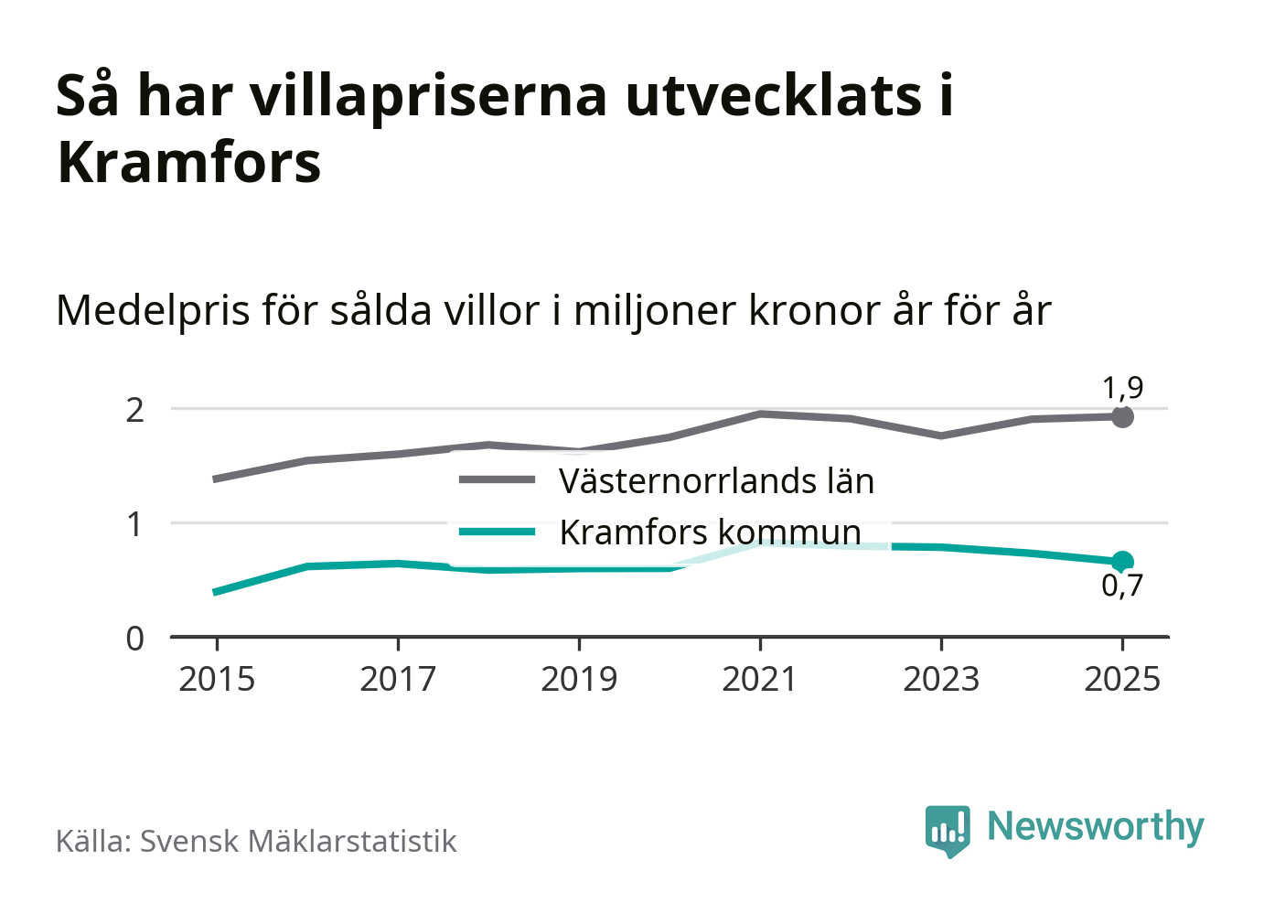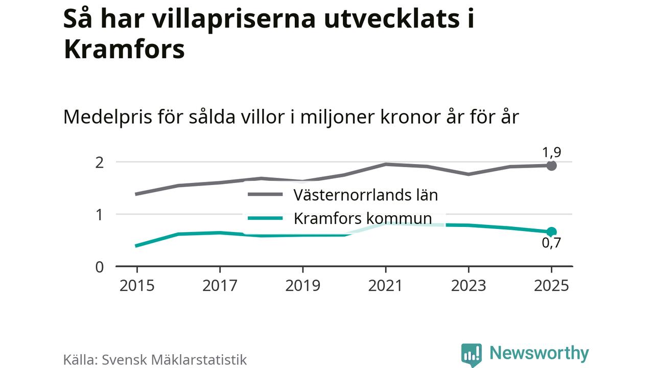 654 000 kronor är medelpriset för de villor som såldes i Kramfors kommun under året, eller 6 286 kronor per kvadratmeter. Det innebär en prisminskning med tio procent på ett år och är fjärde året i rad som priserna sjunker i kommunen.