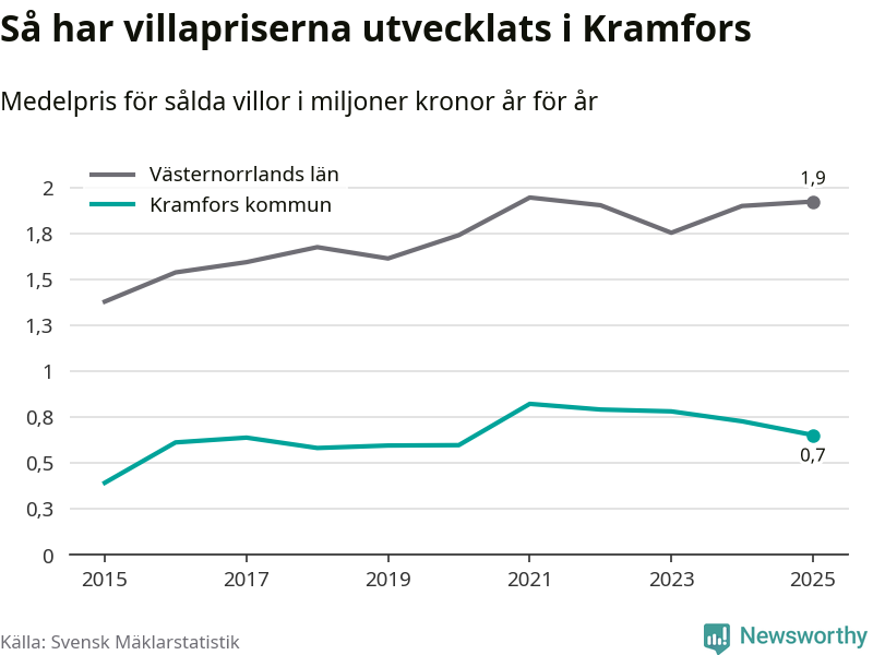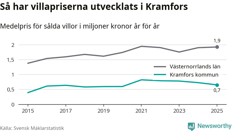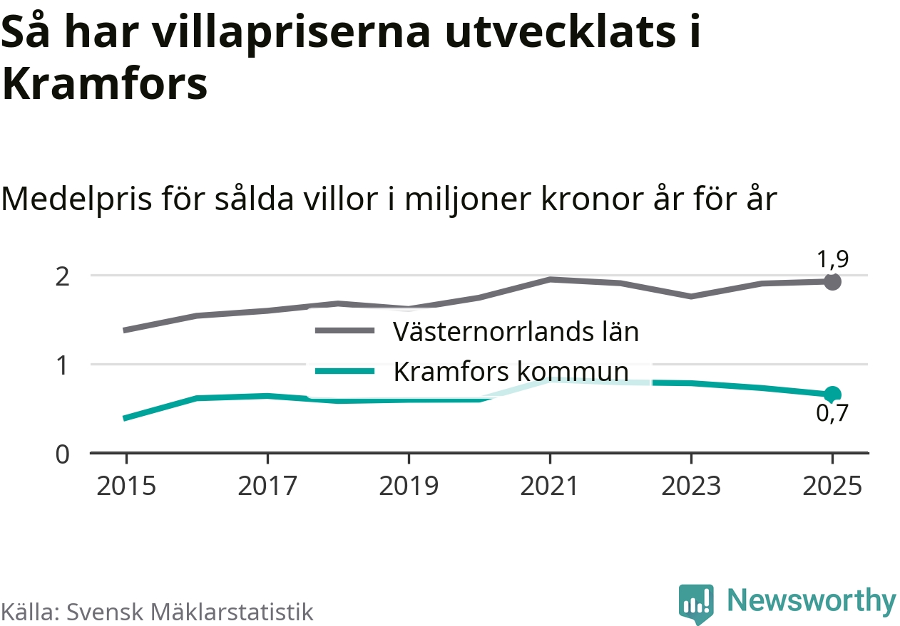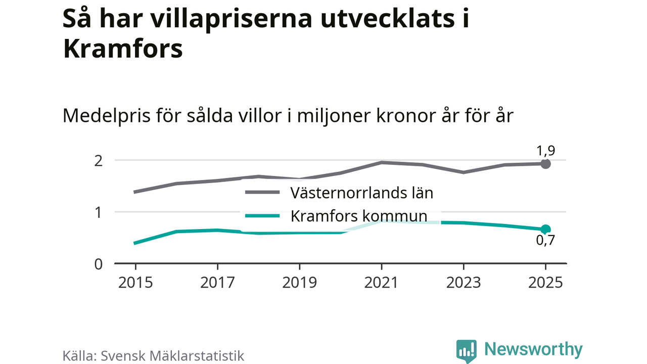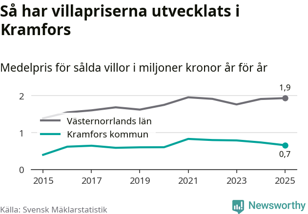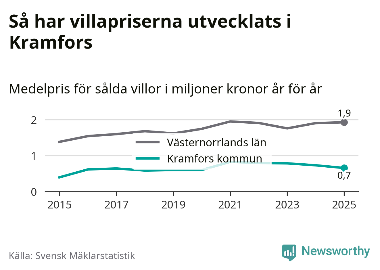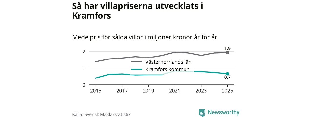 654 000 kronor är medelpriset för de villor som såldes i Kramfors kommun under året, eller 6 286 kronor per kvadratmeter. Det innebär en prisminskning med tio procent på ett år och är fjärde året i rad som priserna sjunker i kommunen.
