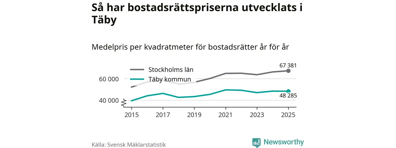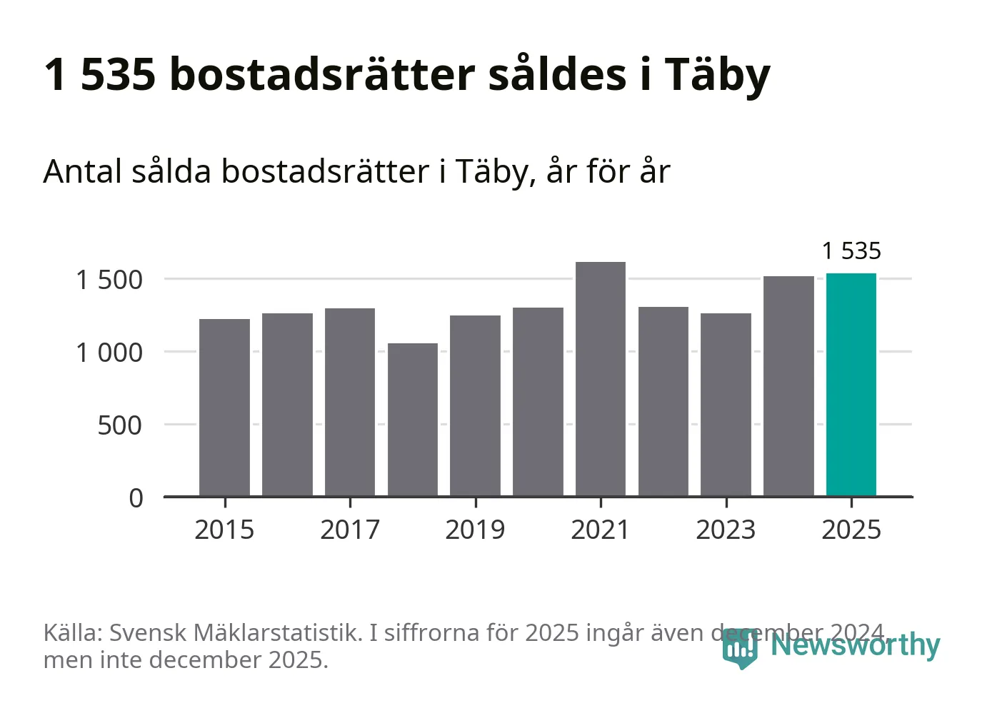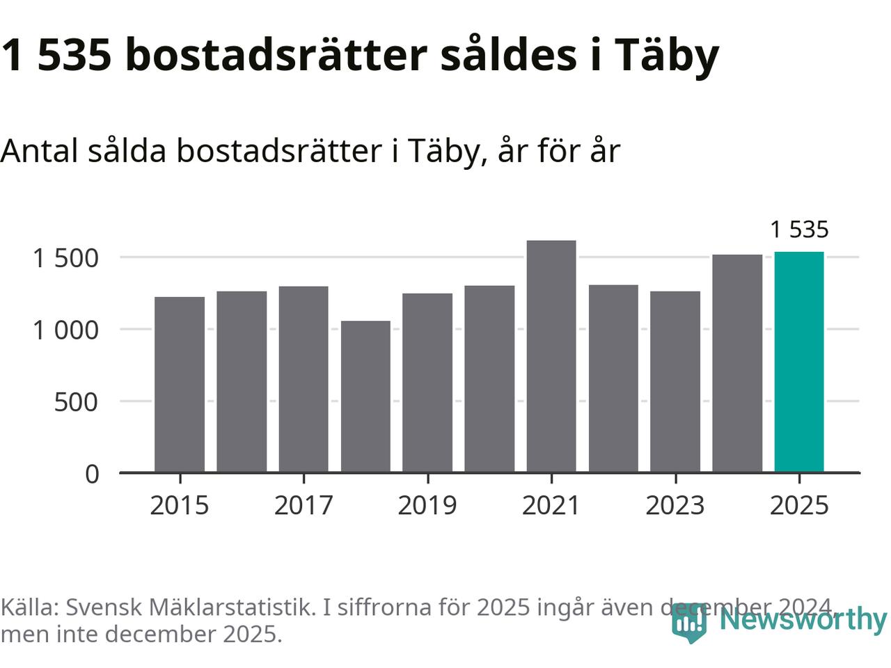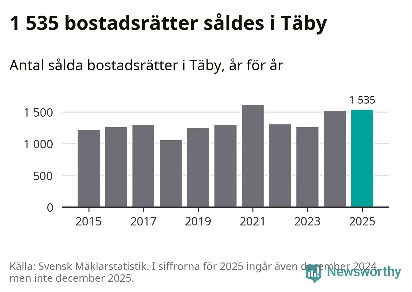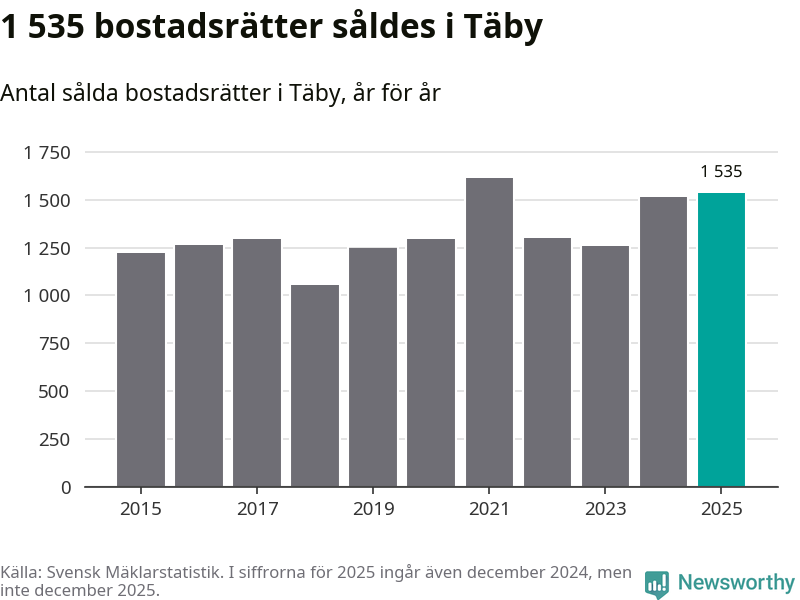Det såldes totalt 1 535 bostadsrätter i Täby kommun under året. Genomsnittspriset per kvadratmeter landade på 48 285 kronor, vilket är ungefär samma nivå som förra året.