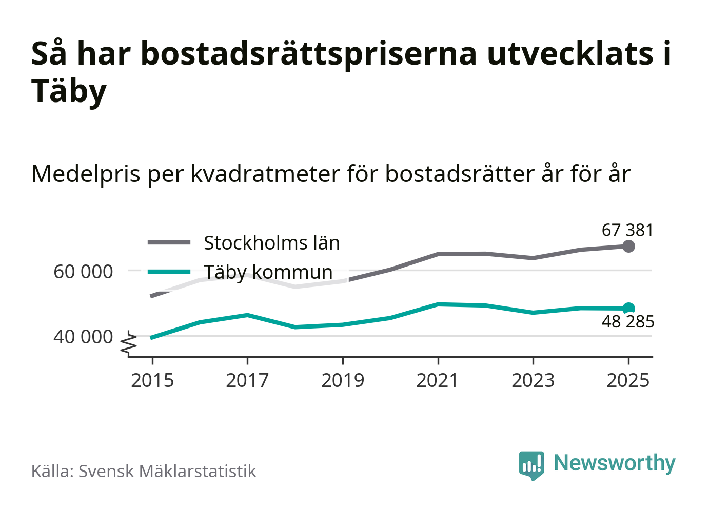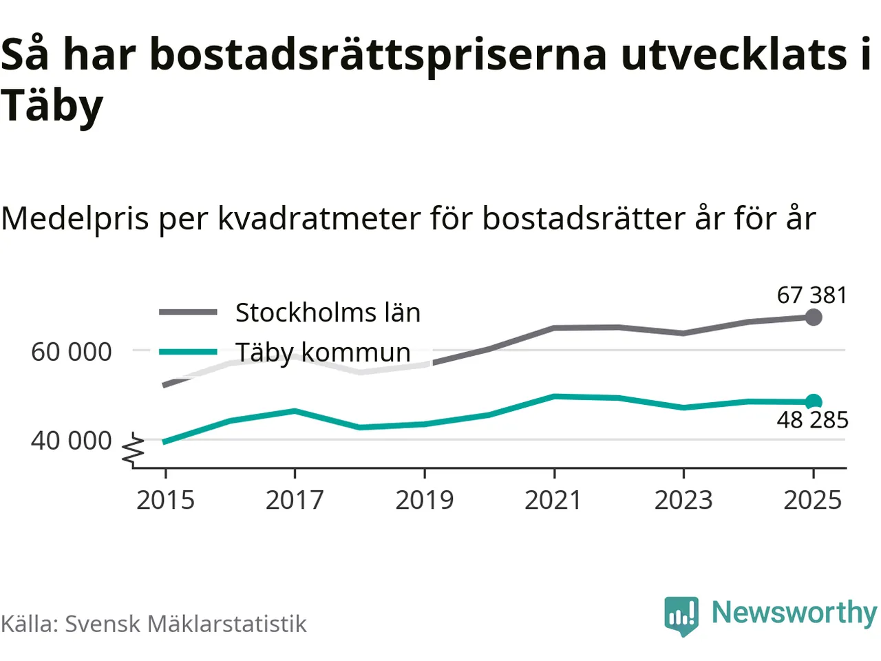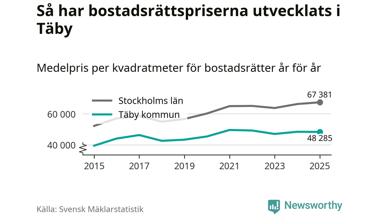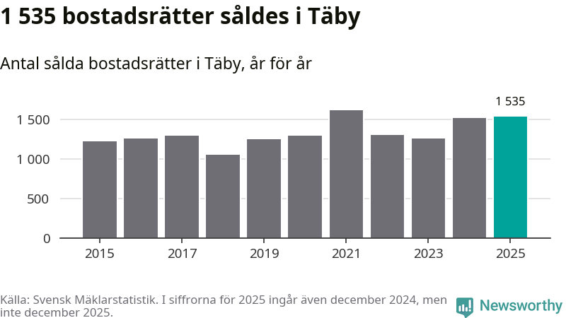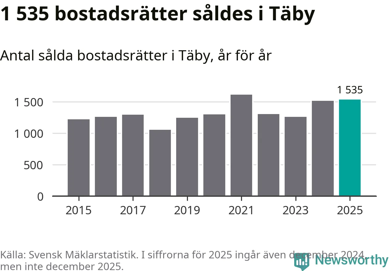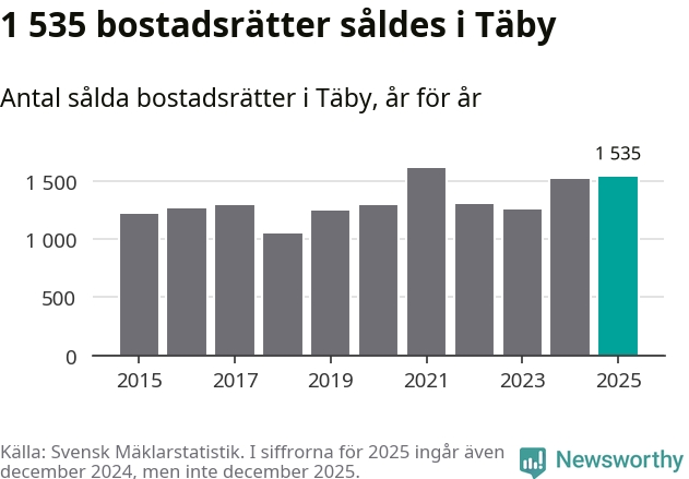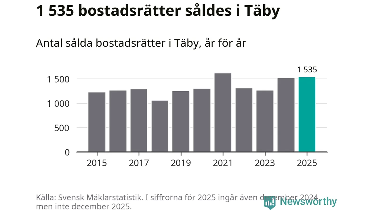 Det såldes totalt 1 535 bostadsrätter i Täby kommun under året. Genomsnittspriset per kvadratmeter landade på 48 285 kronor, vilket är ungefär samma nivå som förra året.