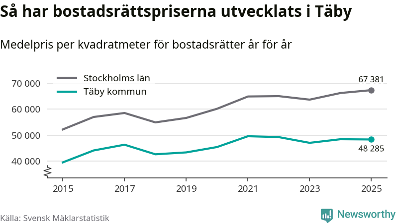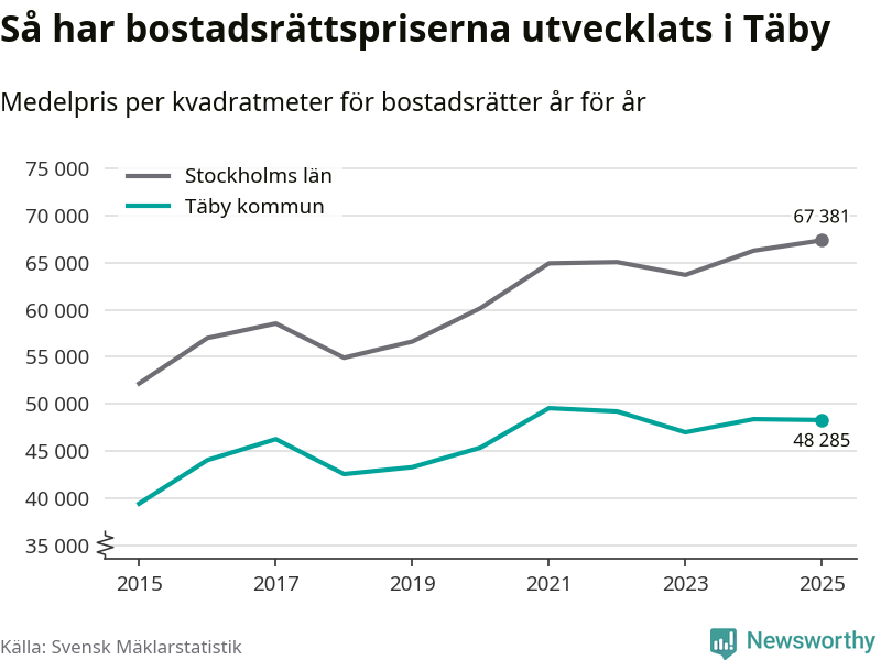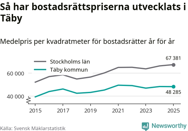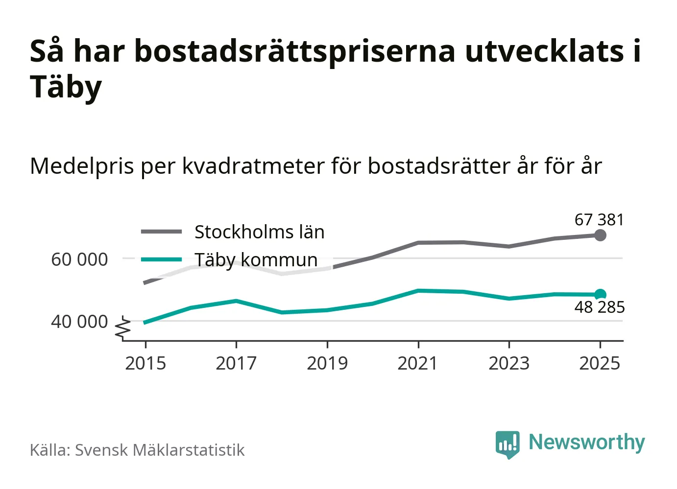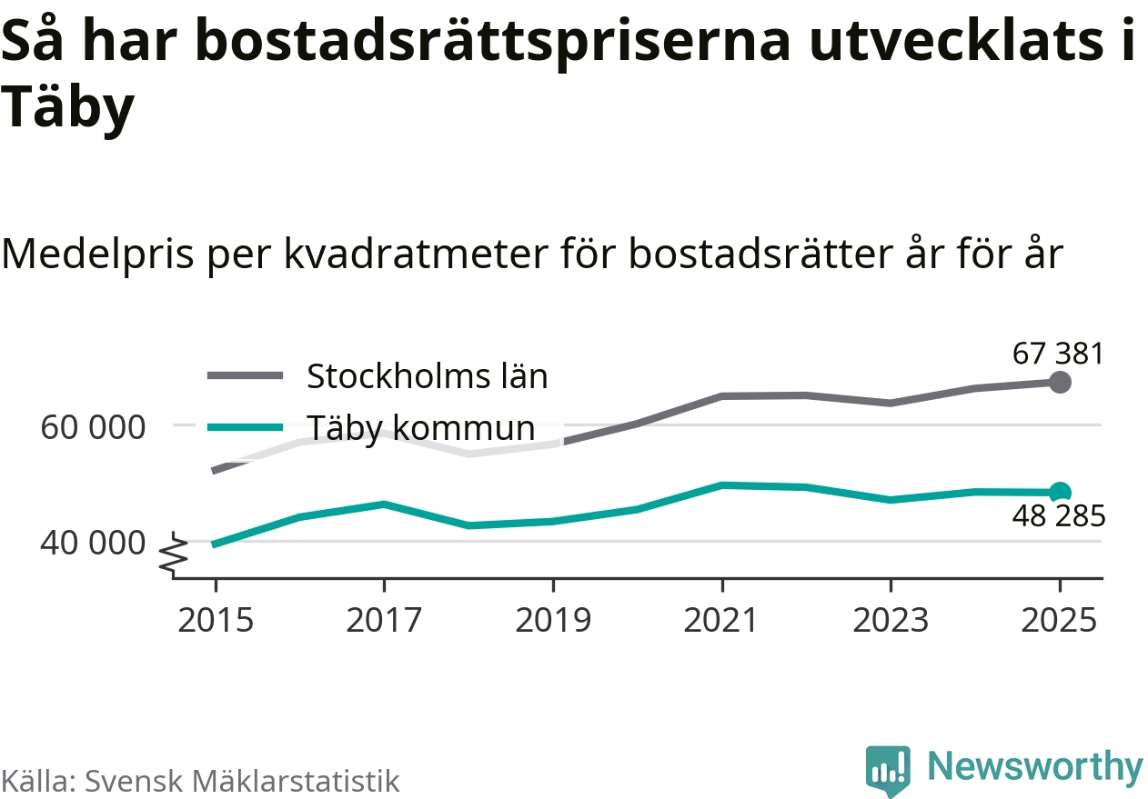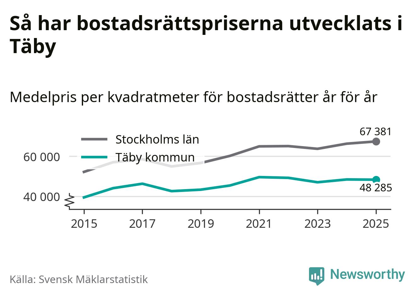 Det såldes totalt 1 535 bostadsrätter i Täby kommun under året. Genomsnittspriset per kvadratmeter landade på 48 285 kronor, vilket är ungefär samma nivå som förra året.