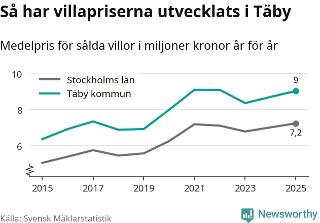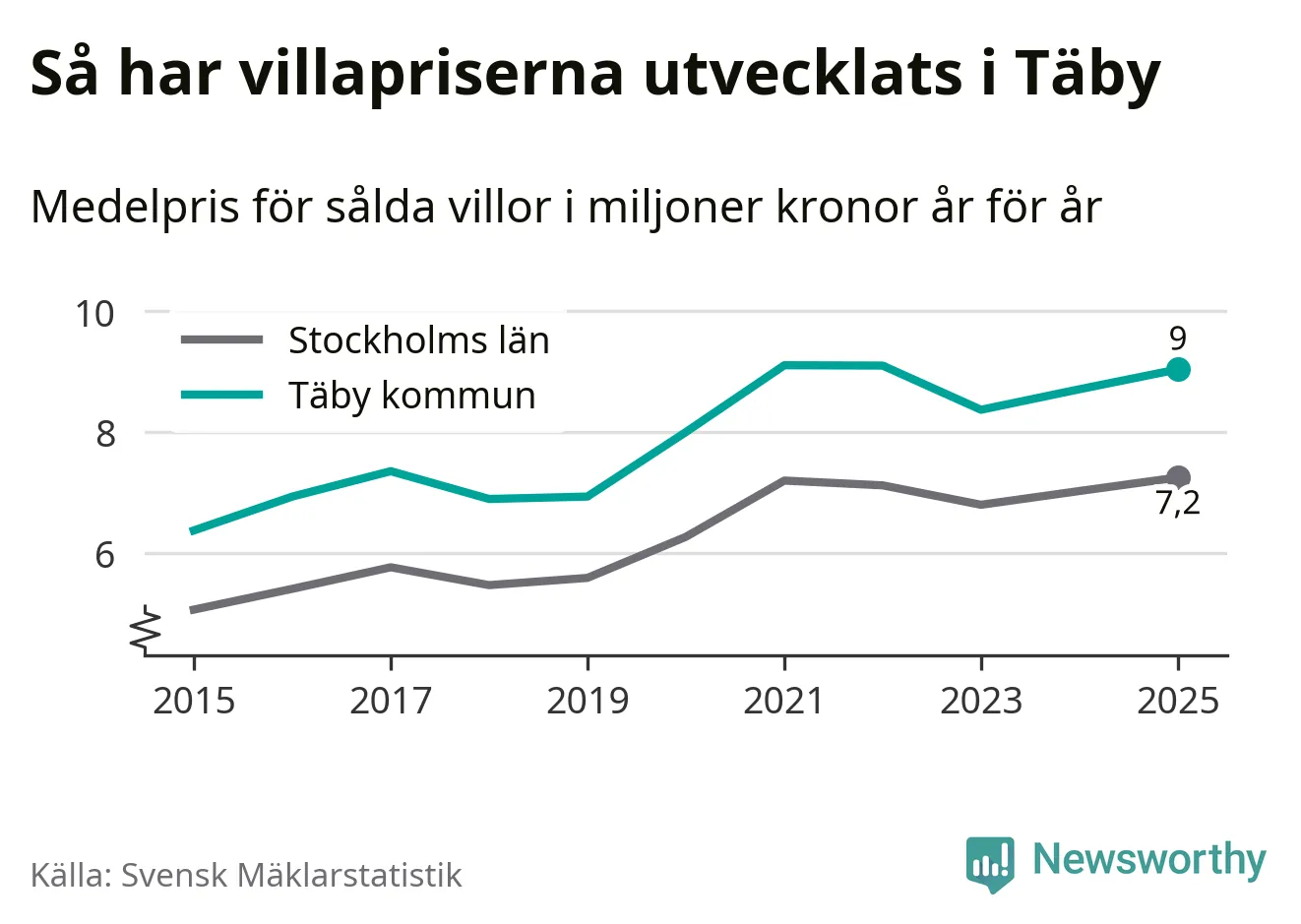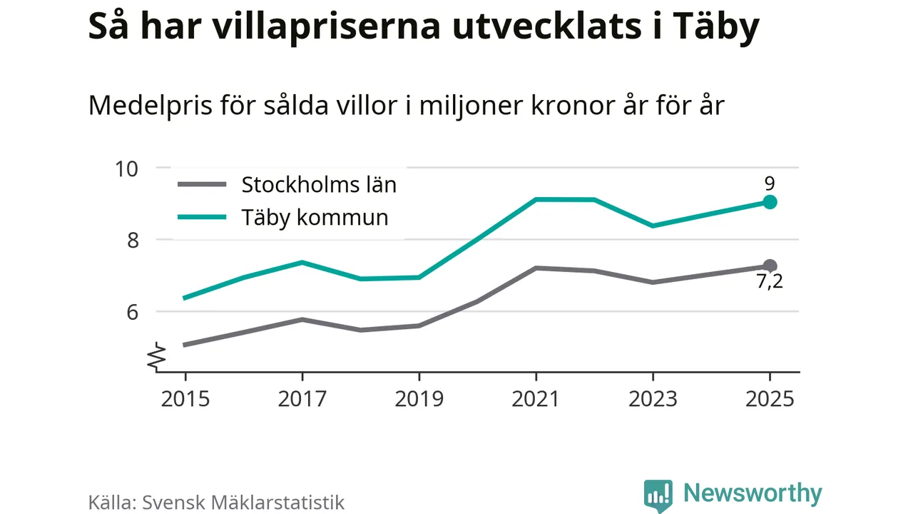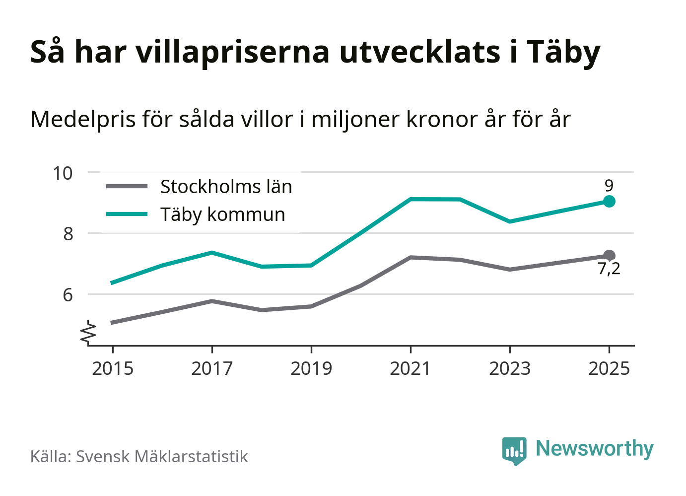 Nio miljoner kronor är medelpriset för de villor som såldes i Täby kommun under året, eller 61 010 kronor per kvadratmeter. Det innebär en prisökning med fyra procent på ett år och är andra året i rad som priserna ökar i kommunen.