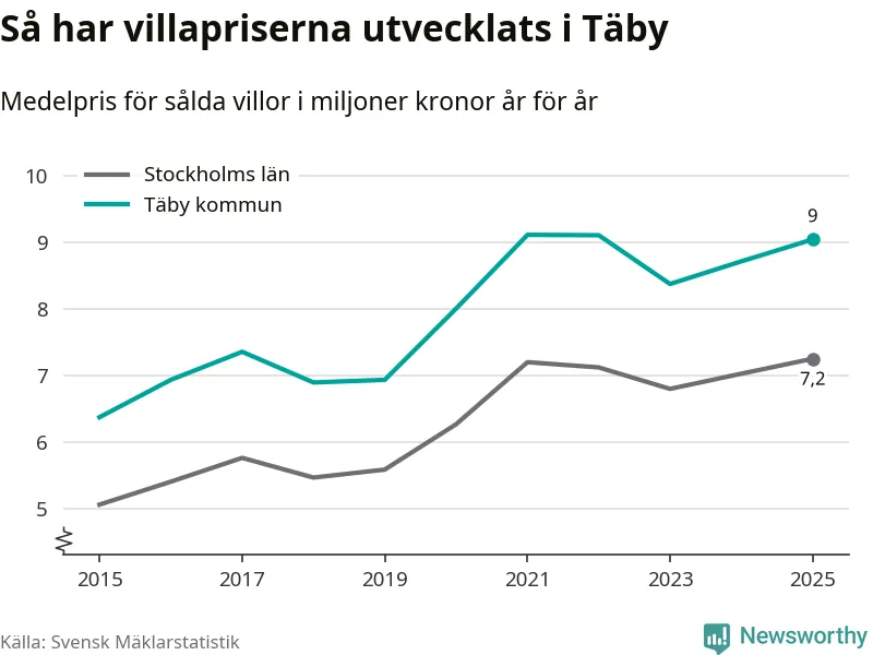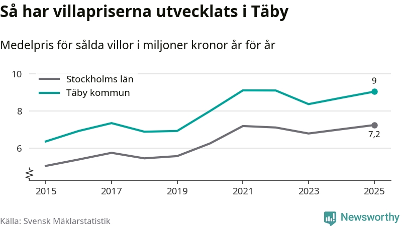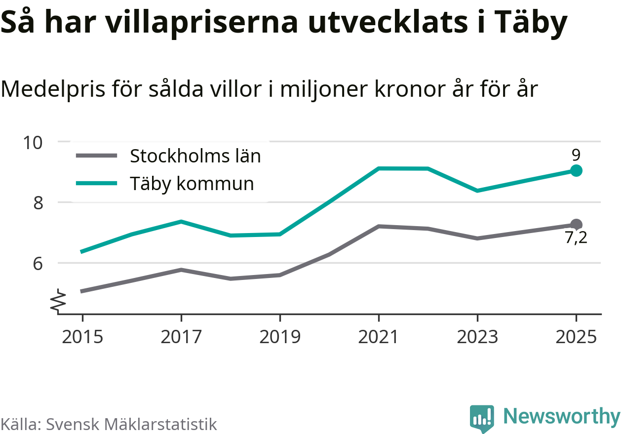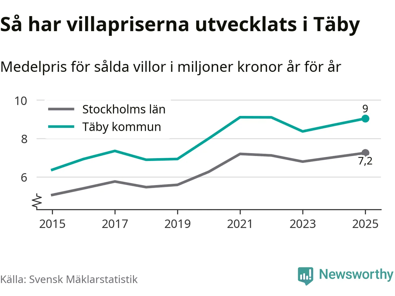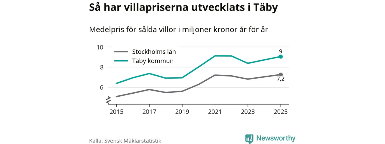 Nio miljoner kronor är medelpriset för de villor som såldes i Täby kommun under året, eller 61 010 kronor per kvadratmeter. Det innebär en prisökning med fyra procent på ett år och är andra året i rad som priserna ökar i kommunen.