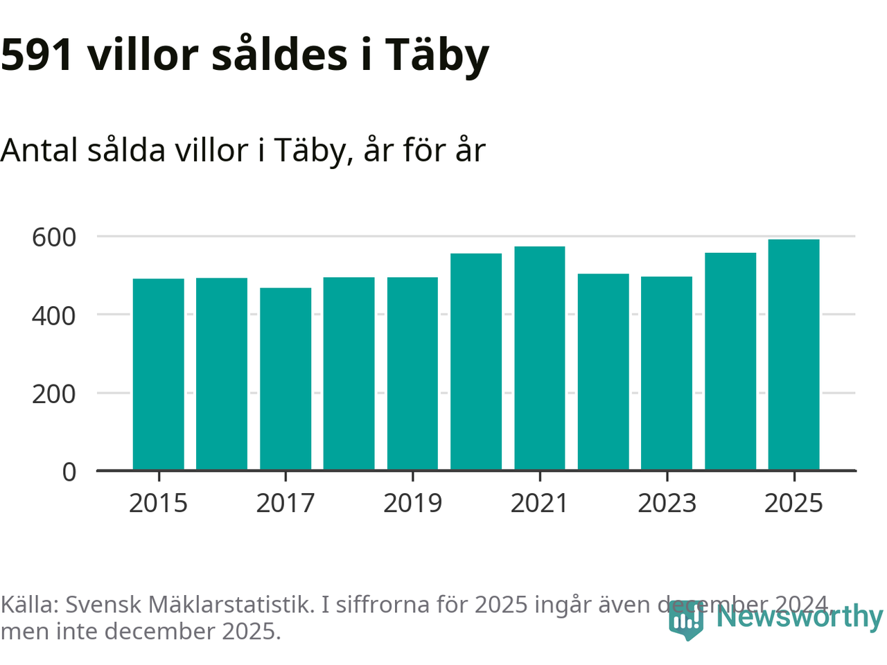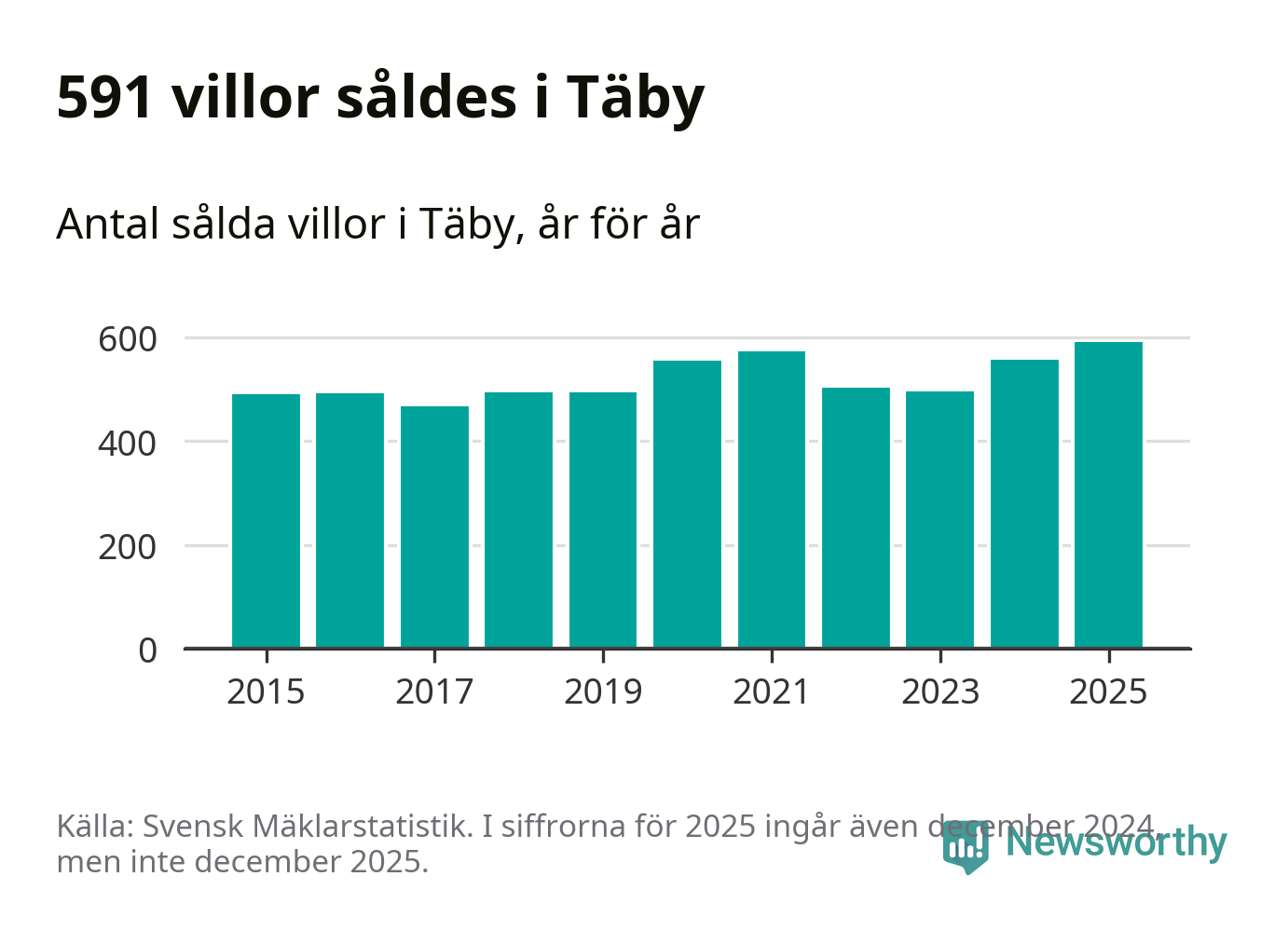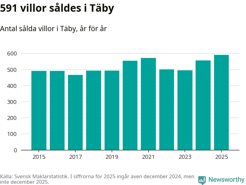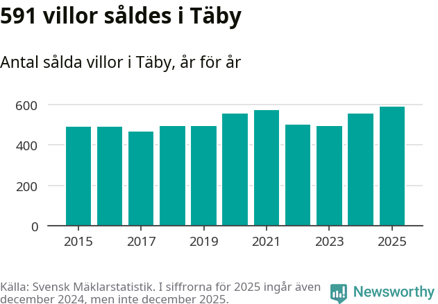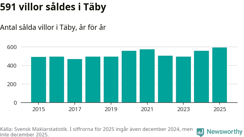 Antalet sålda villor ökade också. Totalt såldes 591 villor, att jämföra med 556 under 2024. Det är fler än något annat år sedan 2015.