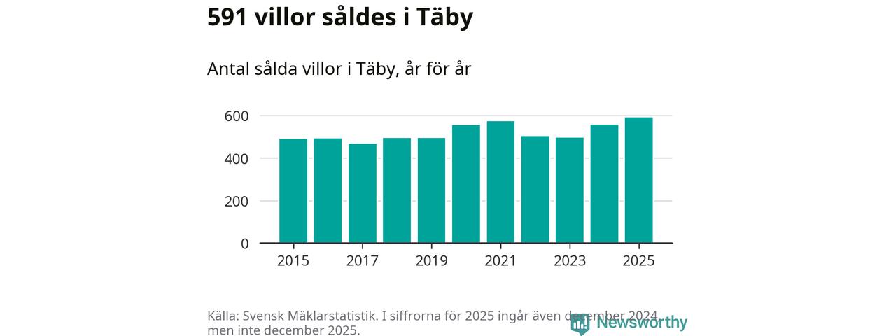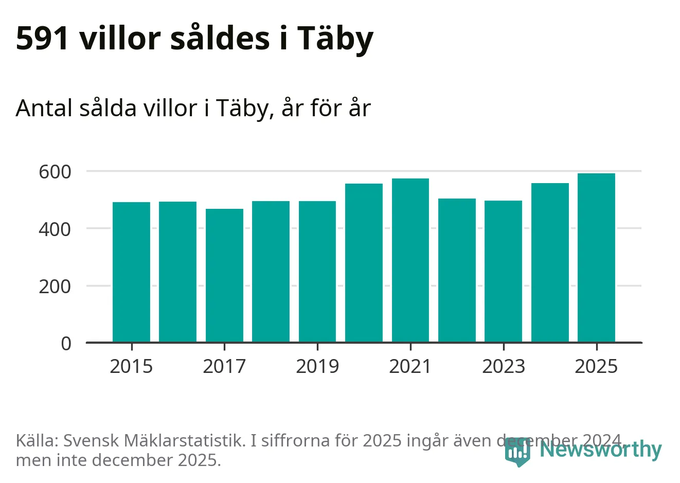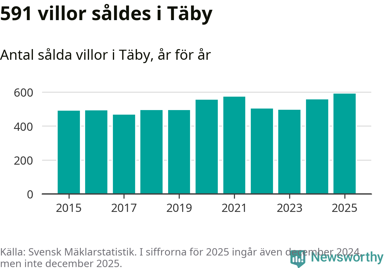 Antalet sålda villor ökade också. Totalt såldes 591 villor, att jämföra med 556 under 2024. Det är fler än något annat år sedan 2015.