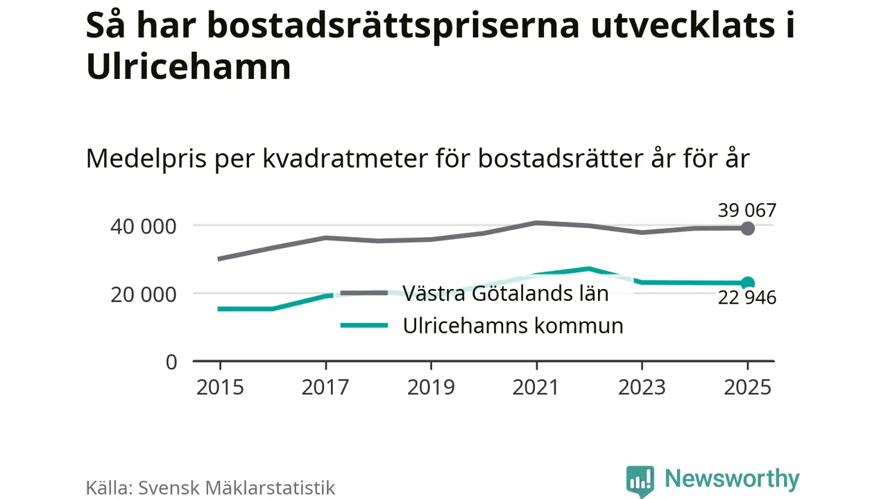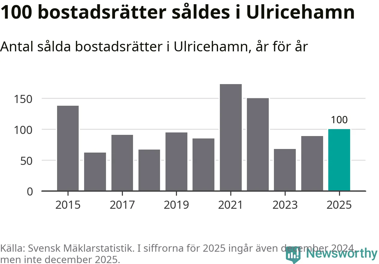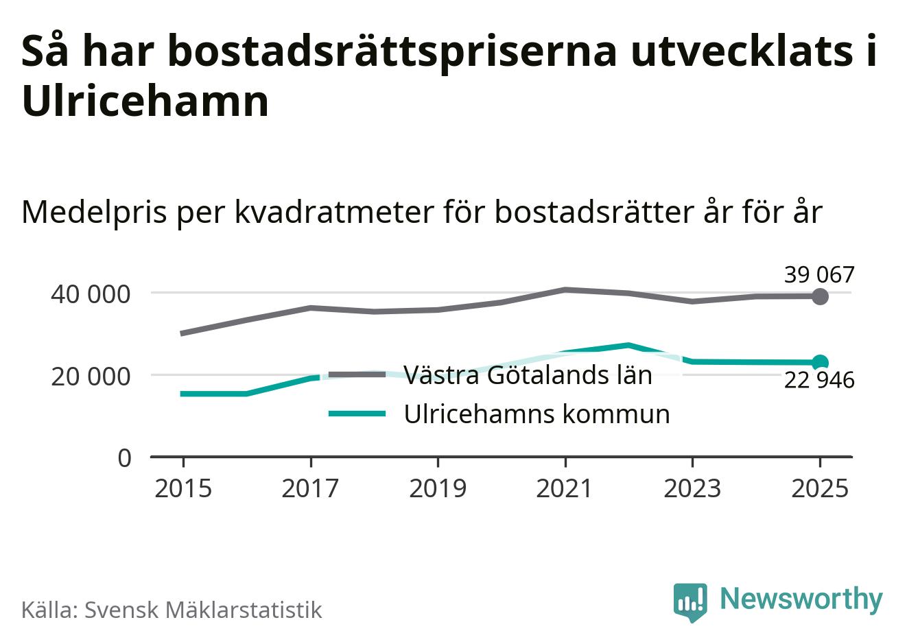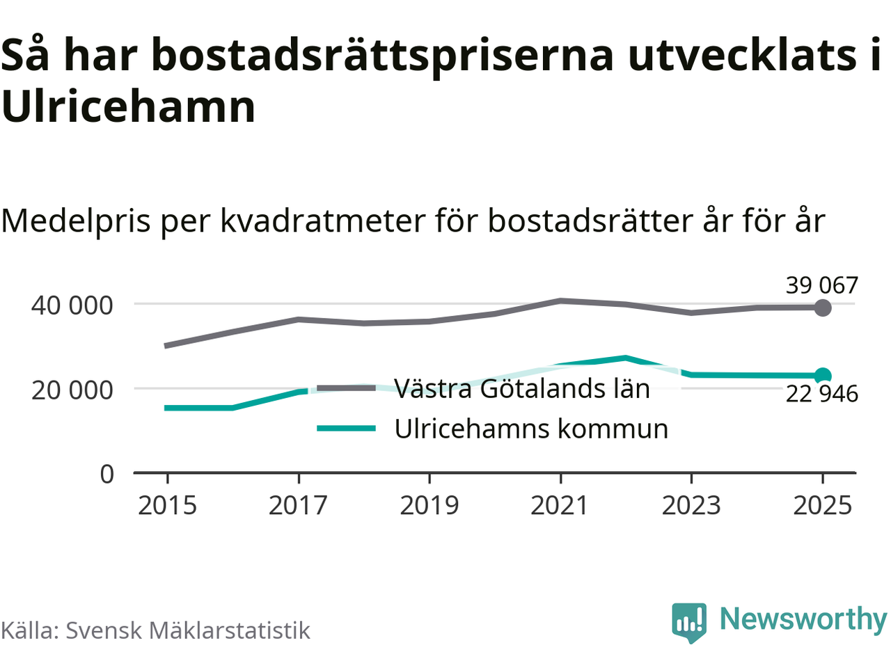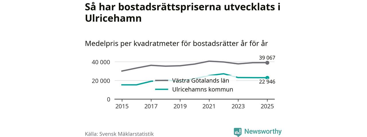 Det såldes totalt 100 bostadsrätter i Ulricehamns kommun under året. Genomsnittspriset per kvadratmeter landade på 22 946 kronor, vilket är ungefär samma nivå som förra året.