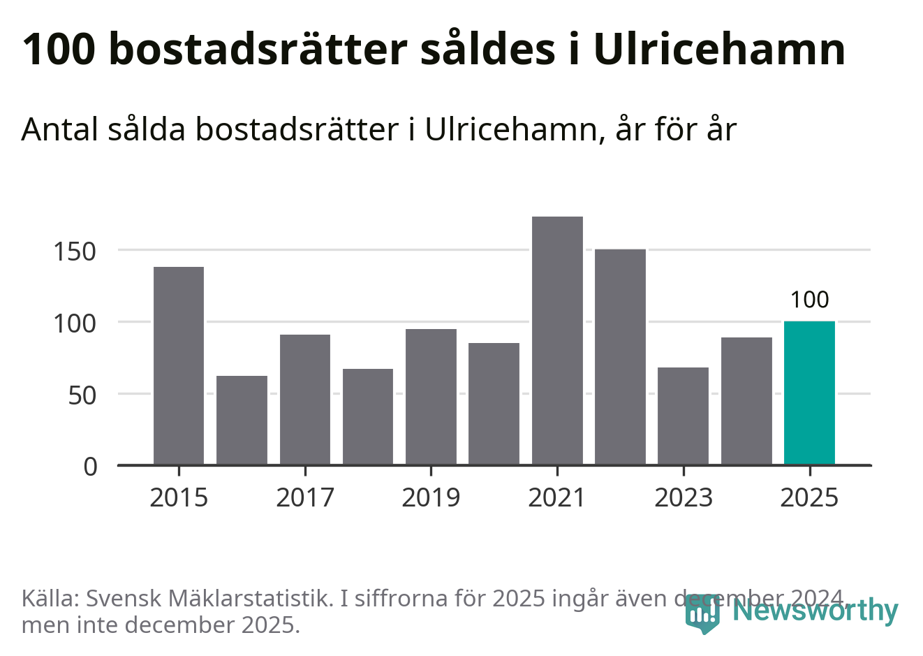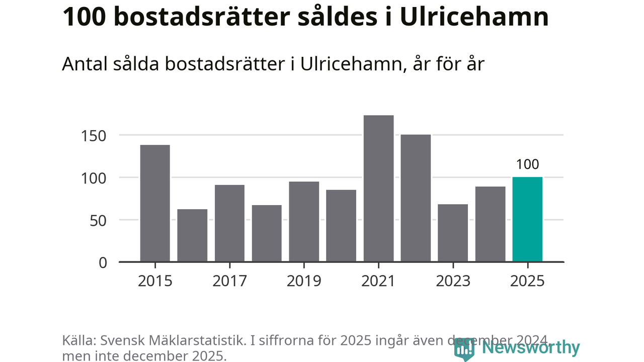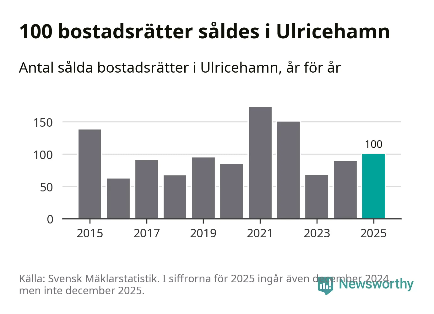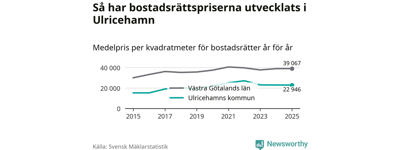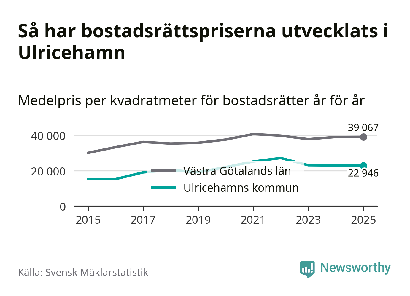 Det såldes totalt 100 bostadsrätter i Ulricehamns kommun under året. Genomsnittspriset per kvadratmeter landade på 22 946 kronor, vilket är ungefär samma nivå som förra året.