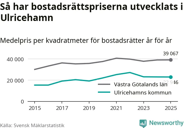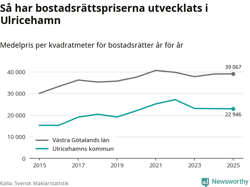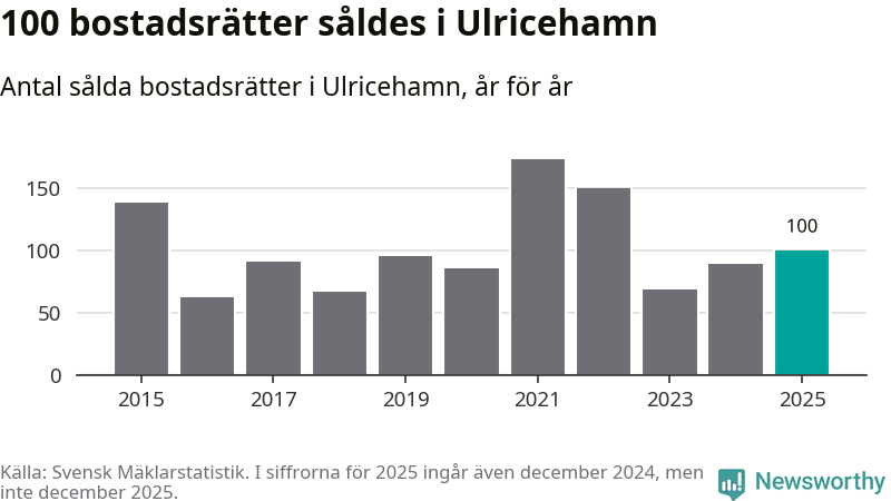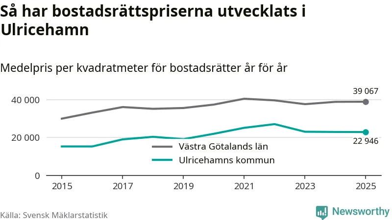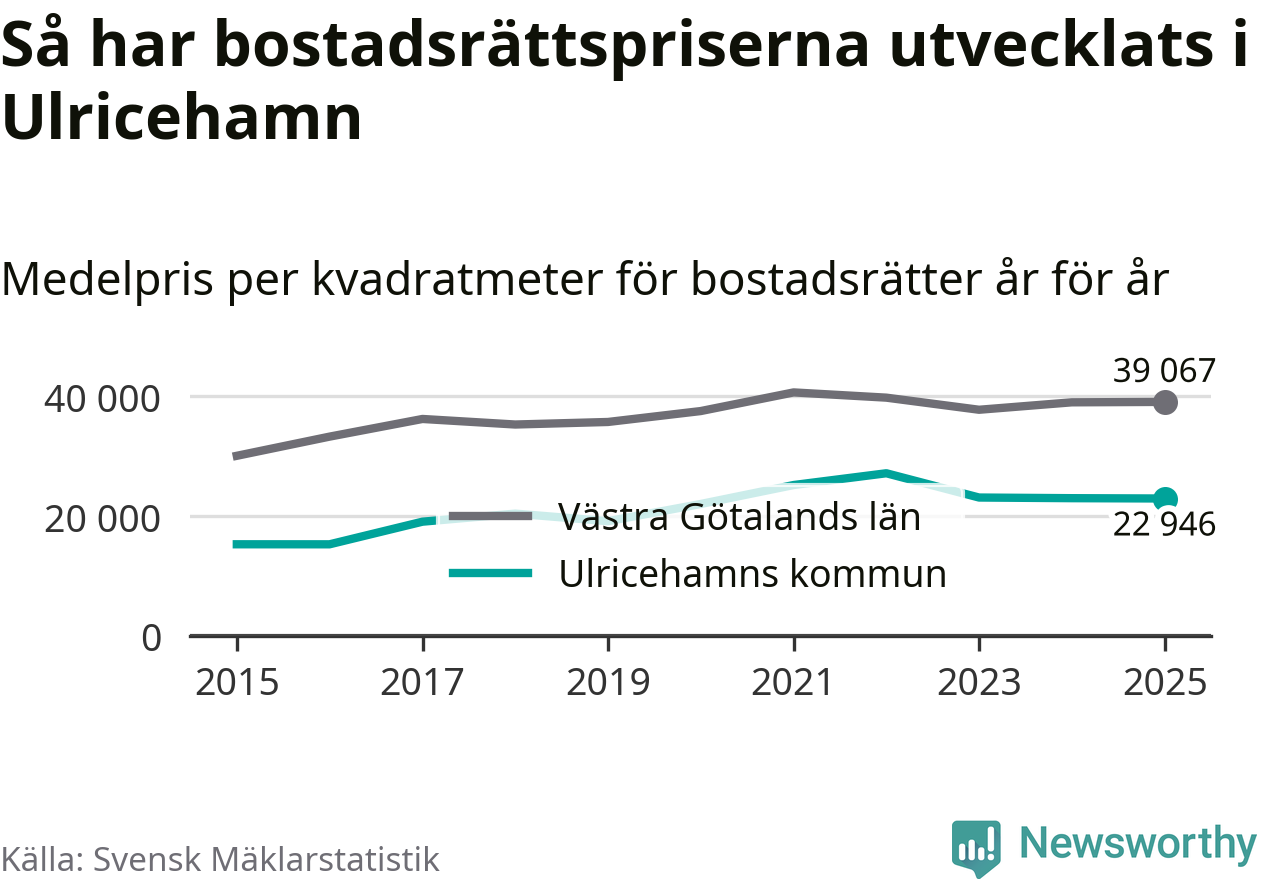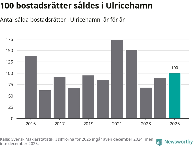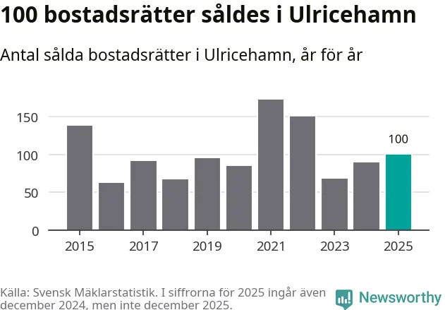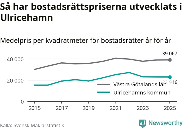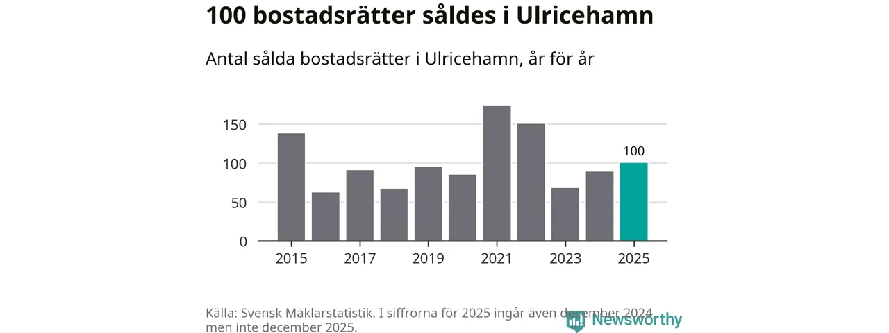 Det såldes totalt 100 bostadsrätter i Ulricehamns kommun under året. Genomsnittspriset per kvadratmeter landade på 22 946 kronor, vilket är ungefär samma nivå som förra året.