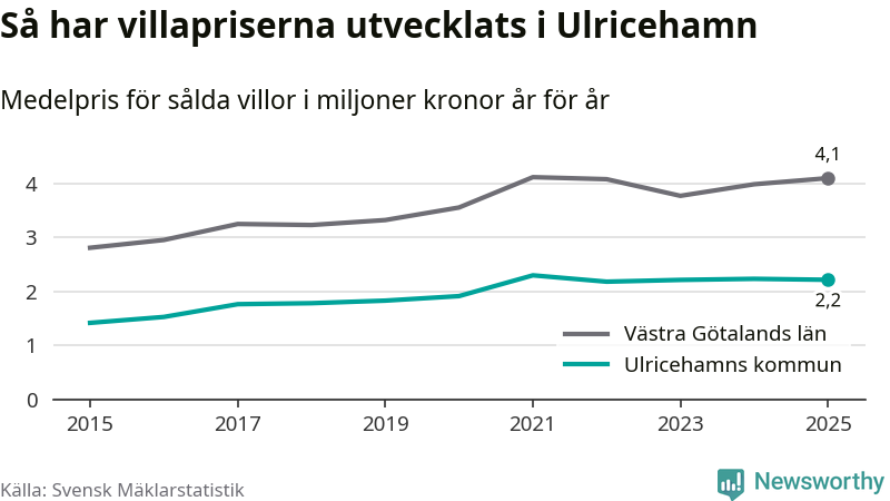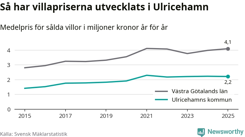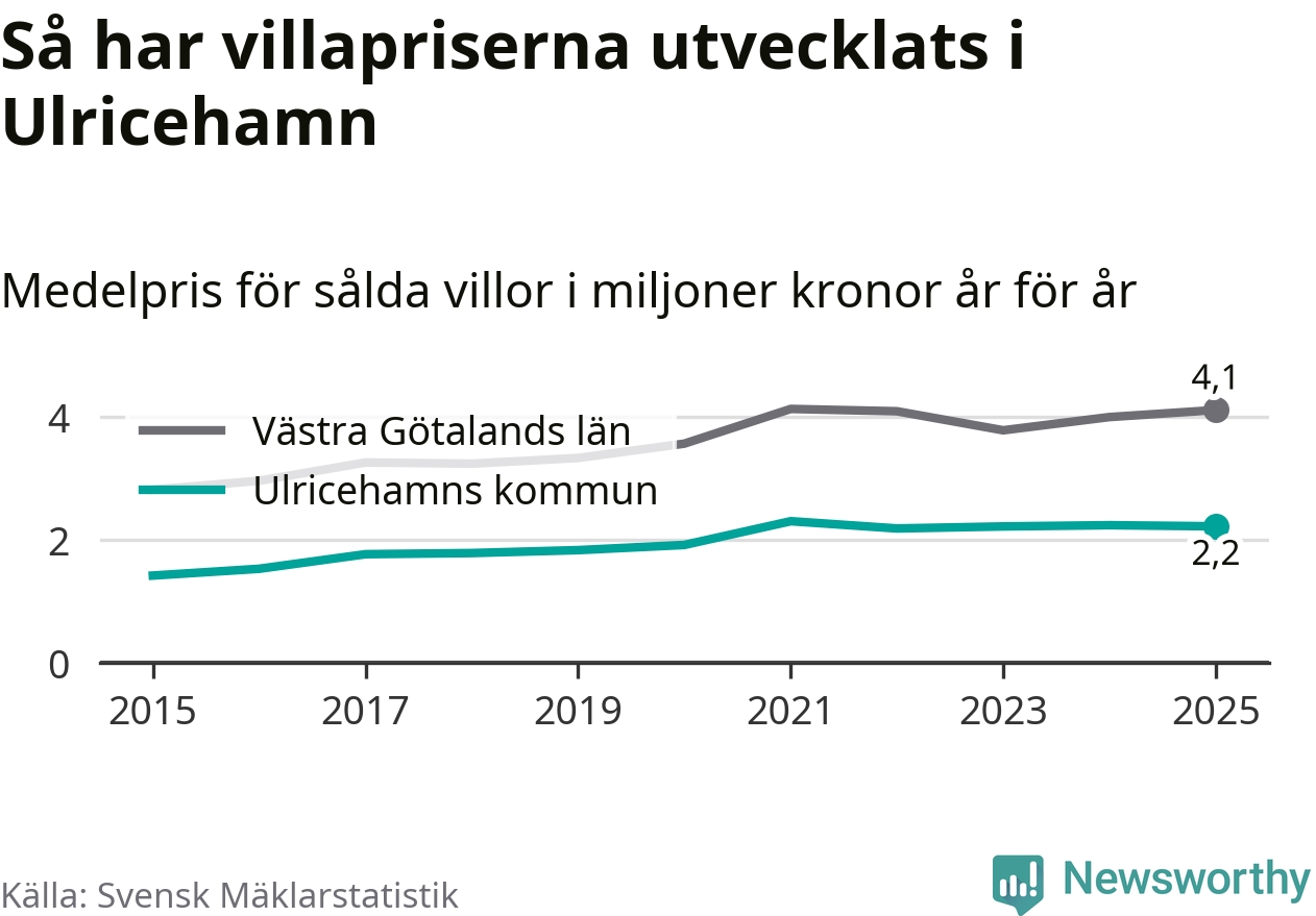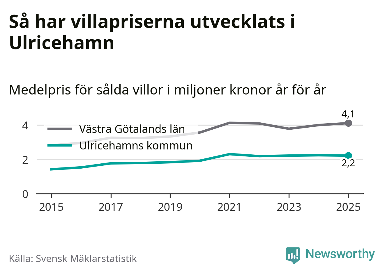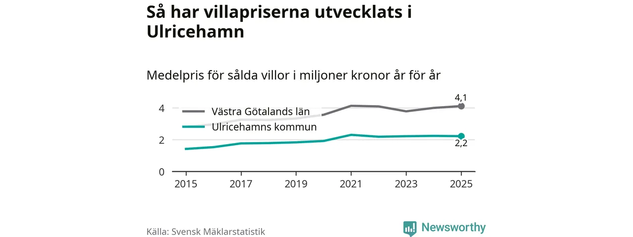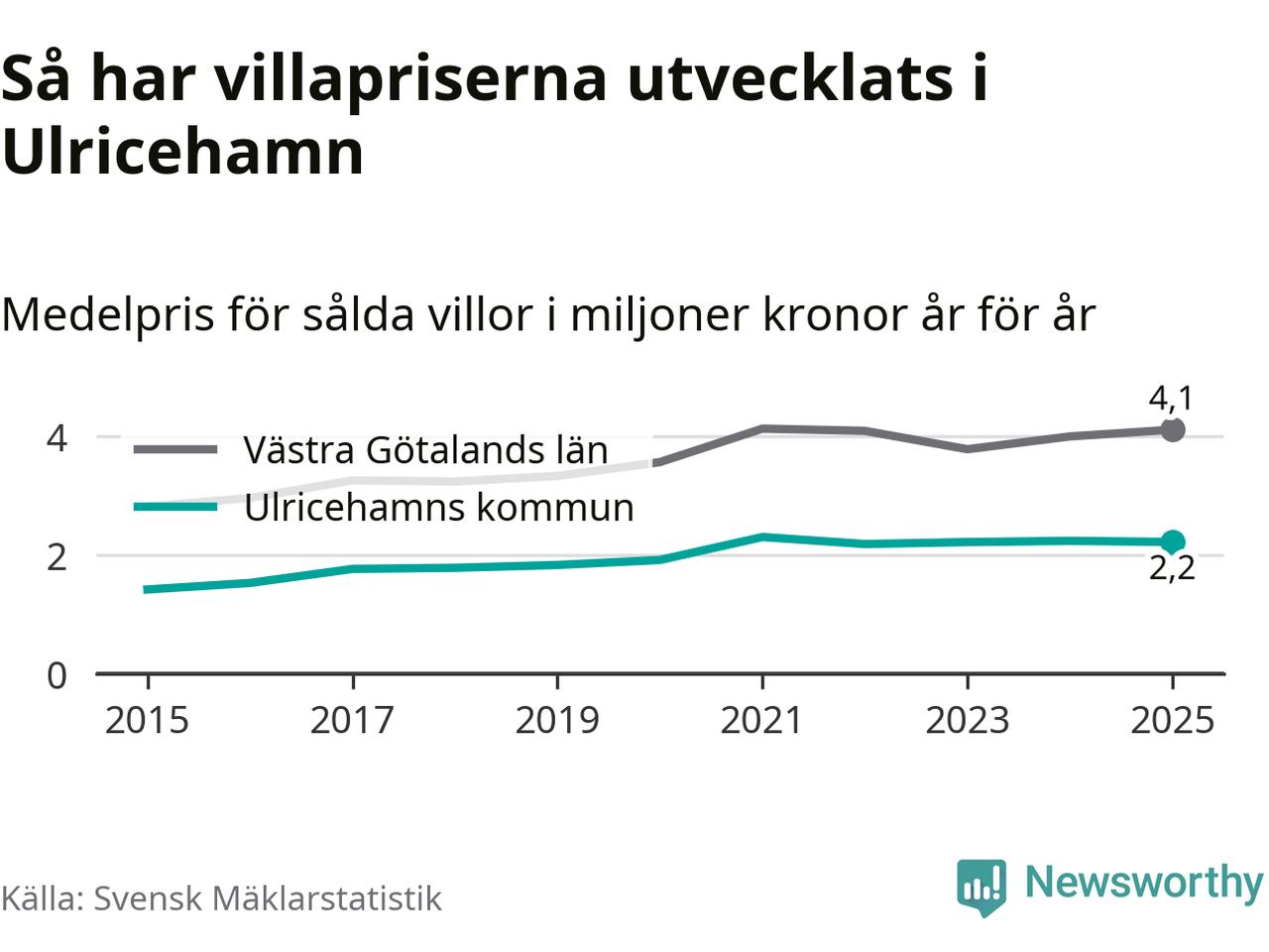 2,2 miljoner kronor är medelpriset för de villor som såldes i Ulricehamns kommun under året, eller 18 744 kronor per kvadratmeter. Det innebär att priserna har legat i stort sett stilla sedan förra året.