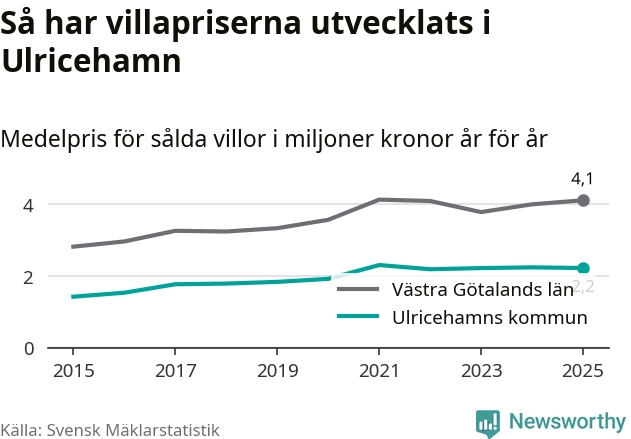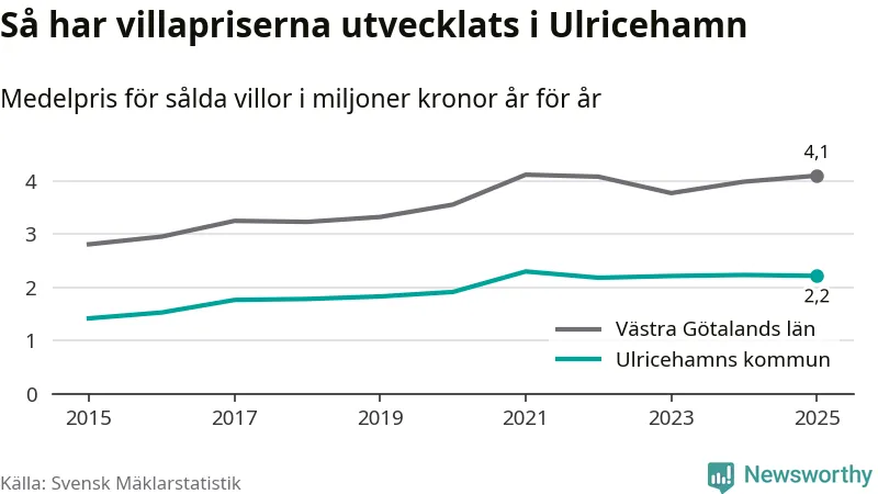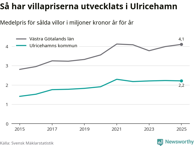 Priserna på villor i Västra Götalands län som helhet har ökat med tre procent sedan förra året. Dock har de inte nått samma nivåer som toppåret i länet 2021.