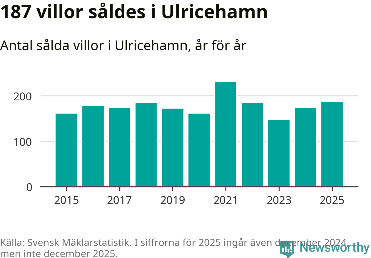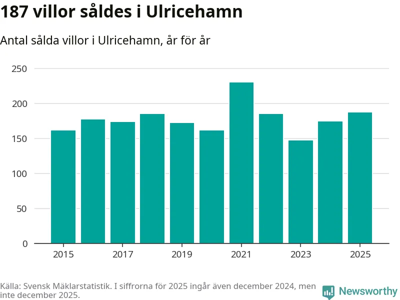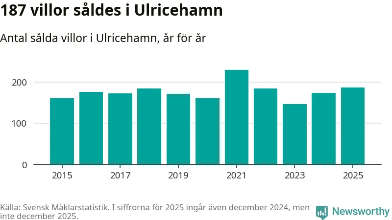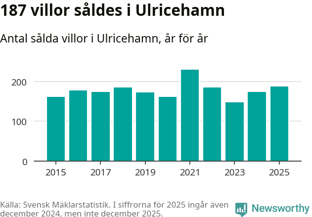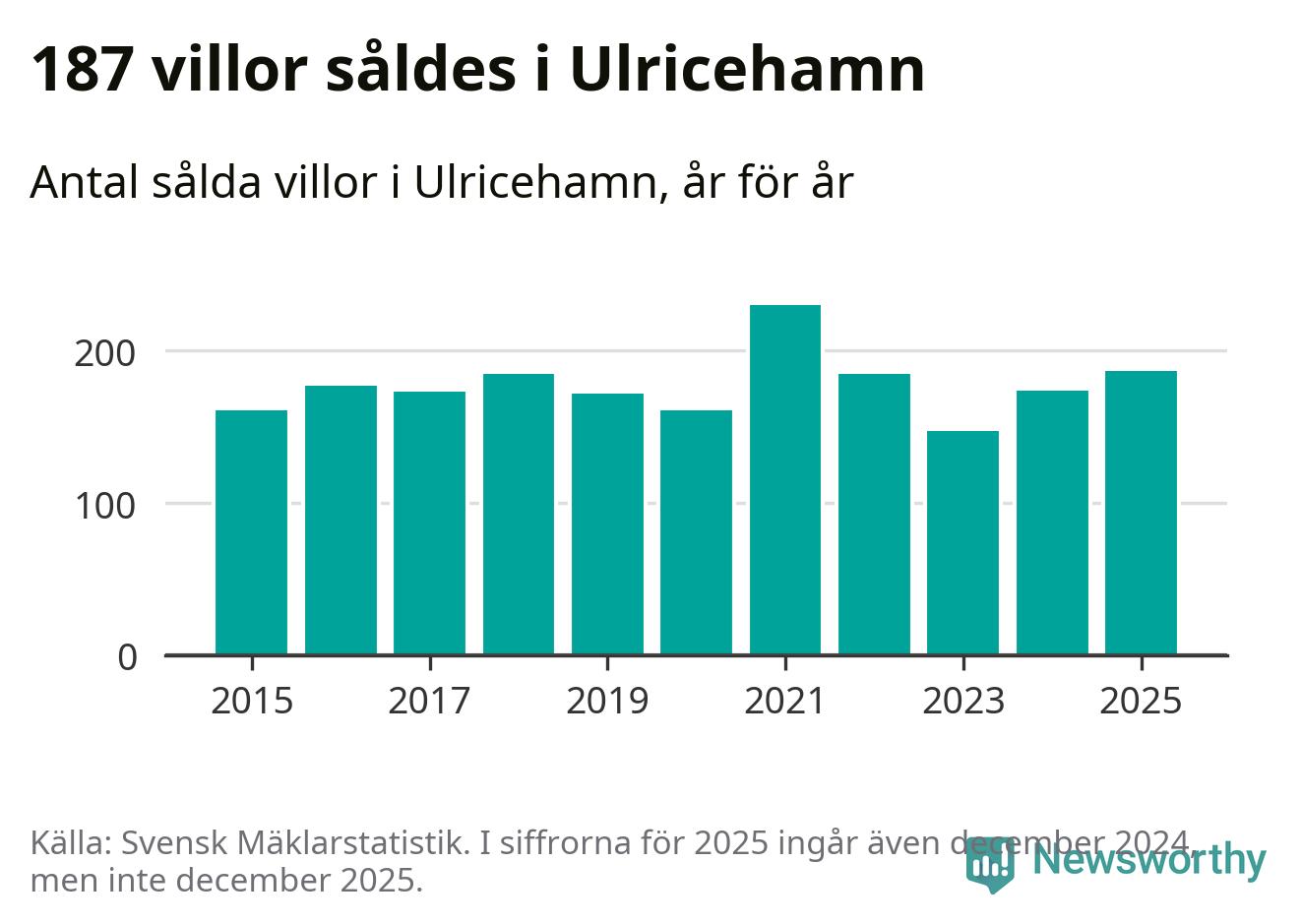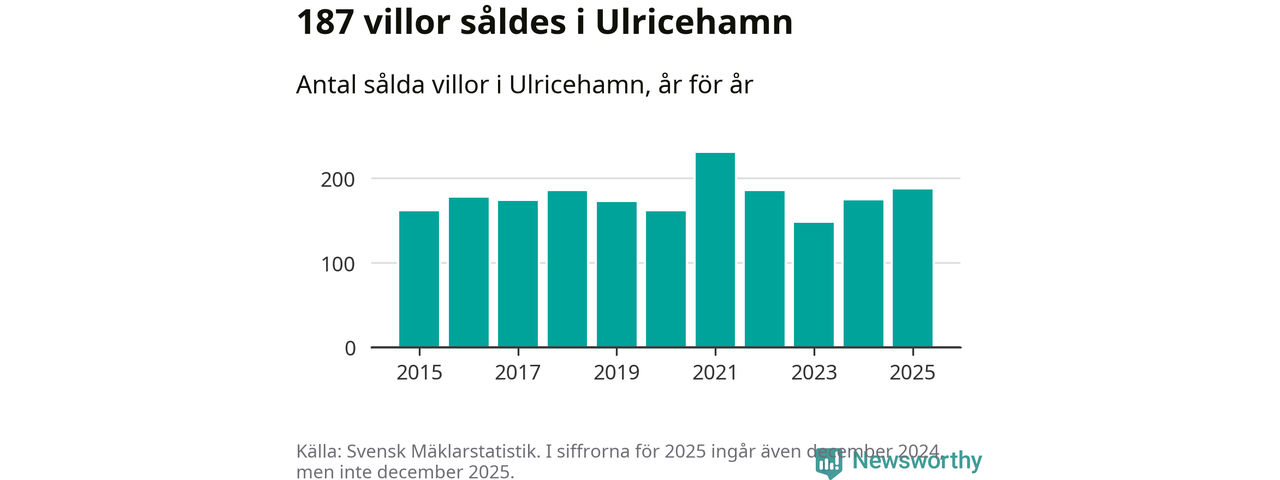 Däremot ökade antalet sålda villor. Totalt såldes 187 villor, att jämföra med 174 under 2024. Det är andra året i rad som antalet sålda villor ökar i kommunen.